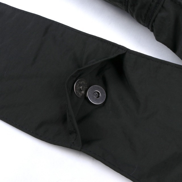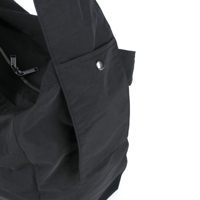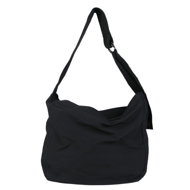 コットンライクなワッシャーナイロンのニュースペーパーバッグ。 非常に軽量で大容量かつ頑丈な作りで、リングベルトアジャスターのショルダーは共生地仕様で洋服にも優しいです。 ショルダーの先端には携帯やカードケース等が収納できるスナップボタンポケットを付きデザインのポイントにも一躍買っています。 収納口はファスナーで開閉できる仕様です