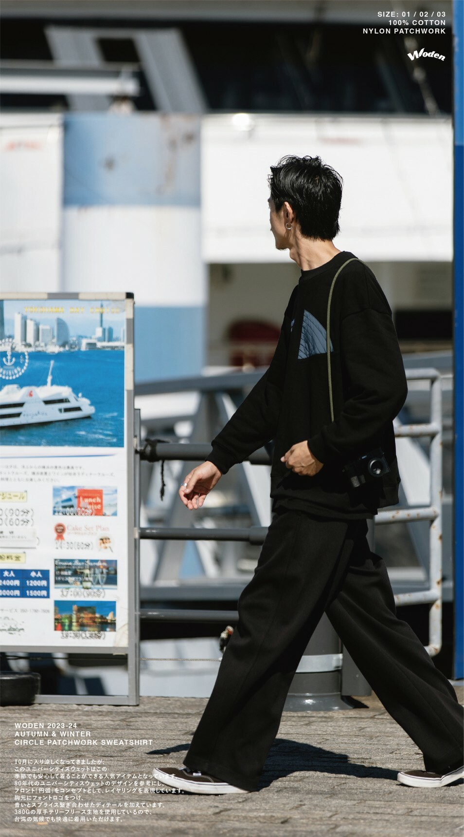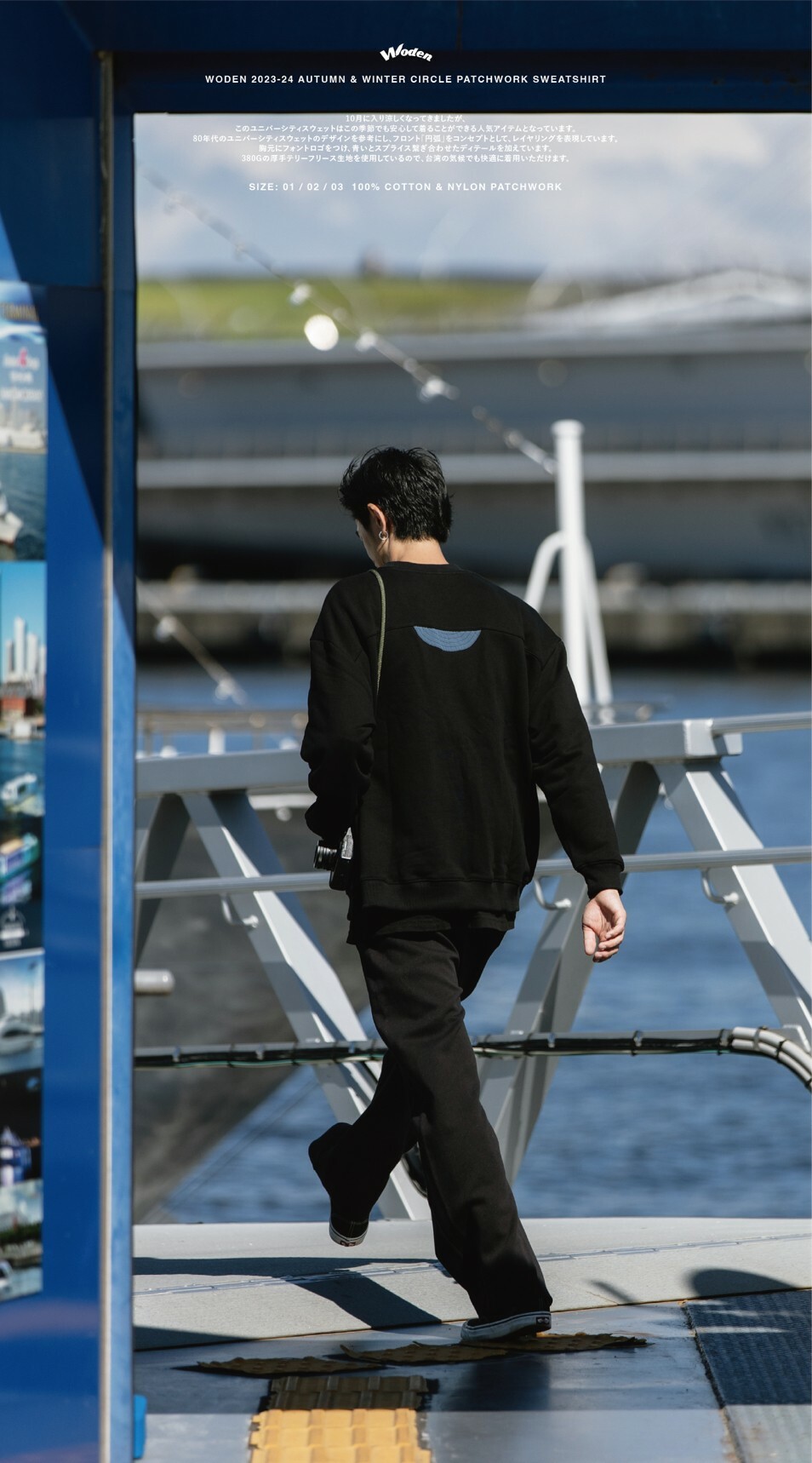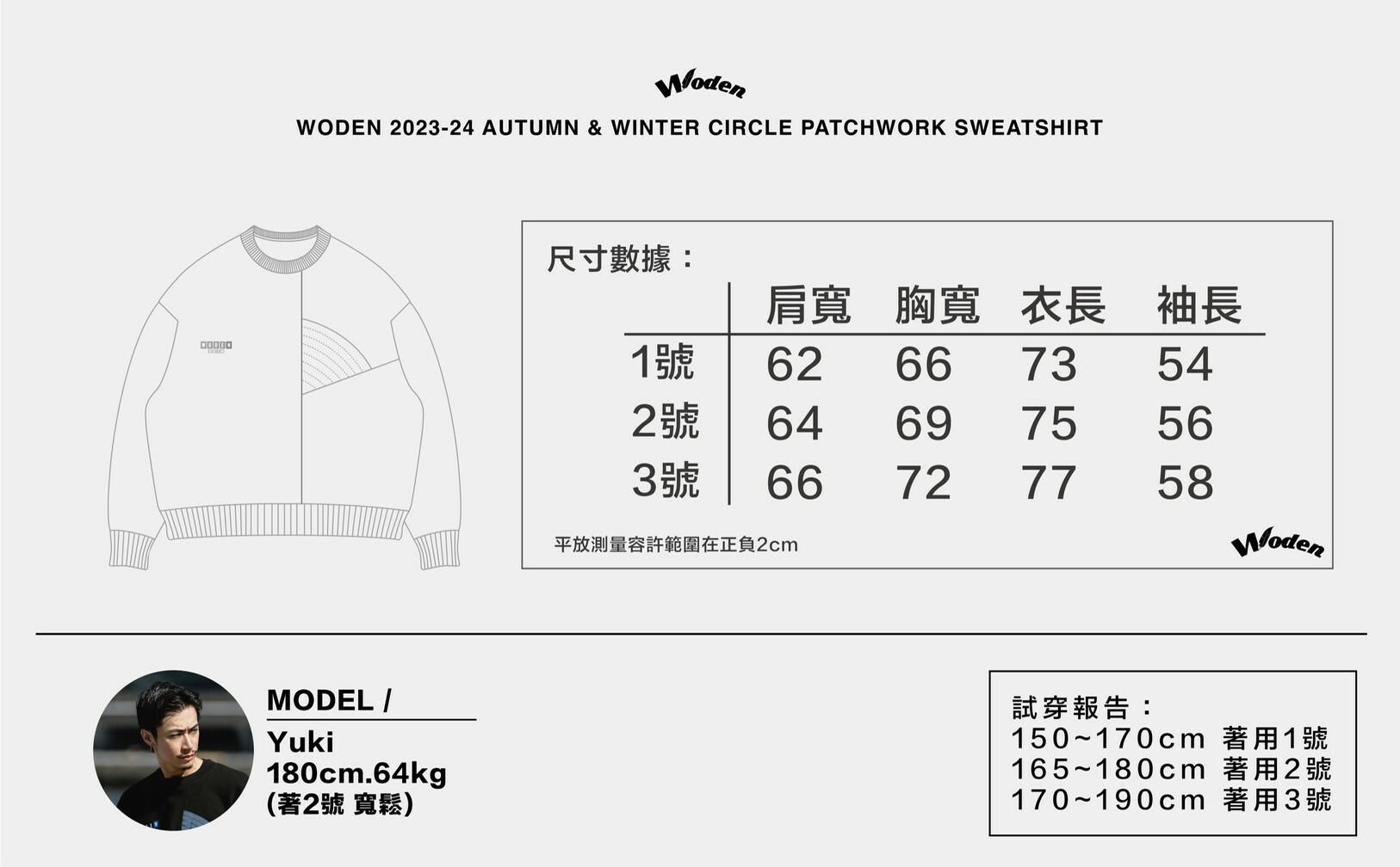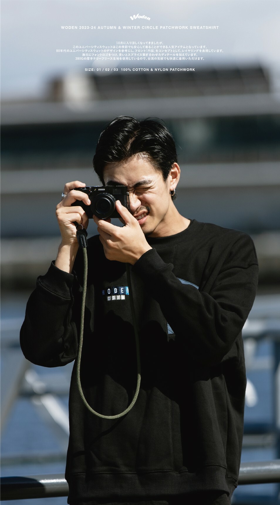 設計團隊延續WODEN寬鬆大學tee版型,參考80年代常使用的幾何圖形拼接設計,以尼龍異材質拼接增加細節。正面圓錐形拼接與背部的半圓形拼接相得益彰,為了增加層次感,於拼接處加入裝飾縫線,使拼接細節更加完整。