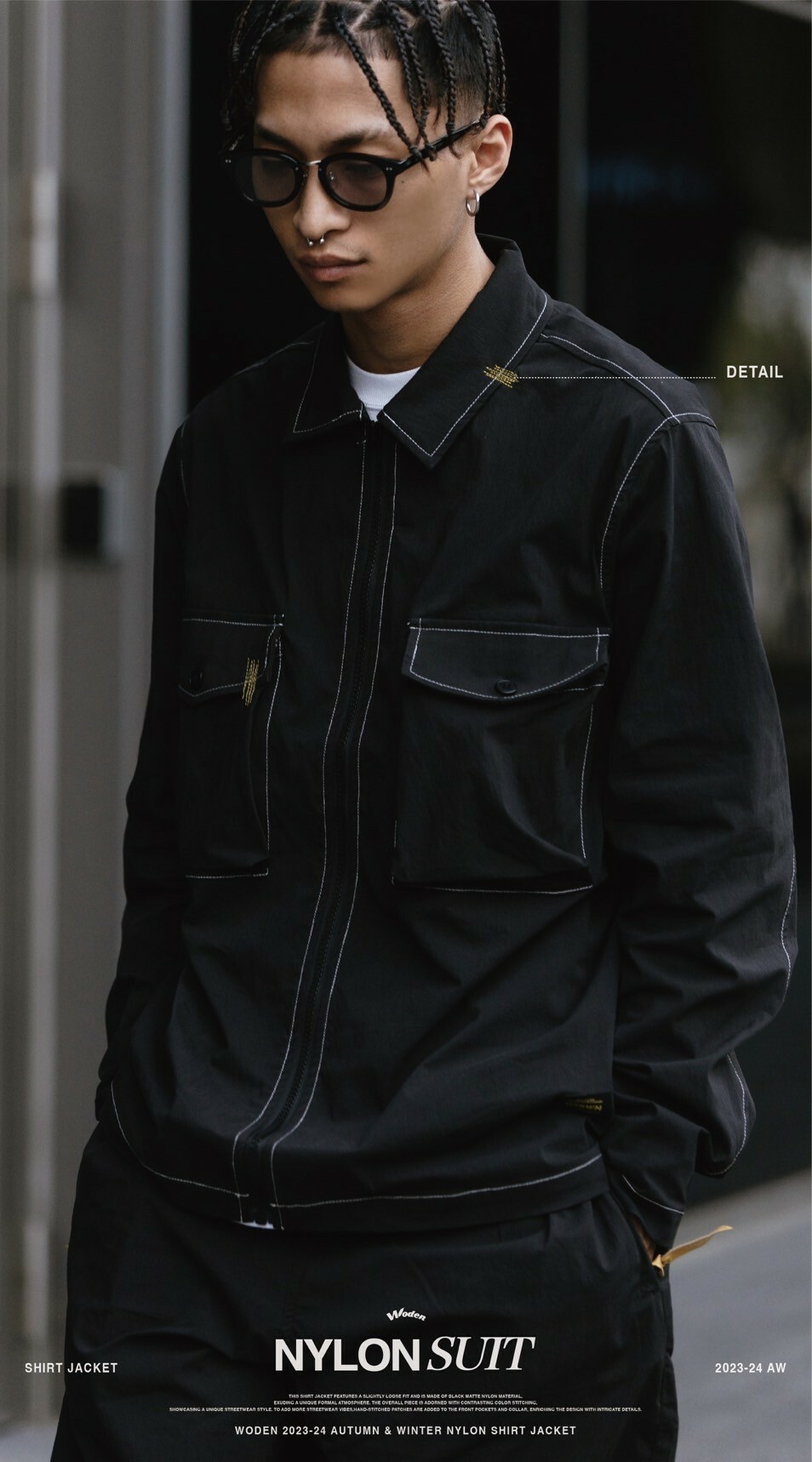 本次襯衫外套採用微寬鬆版型,選用黑色霧面尼龍材質,展現出獨特的正裝氛圍。整體單品以撞色車縫線點綴,展現出街頭休閒的獨特風格。