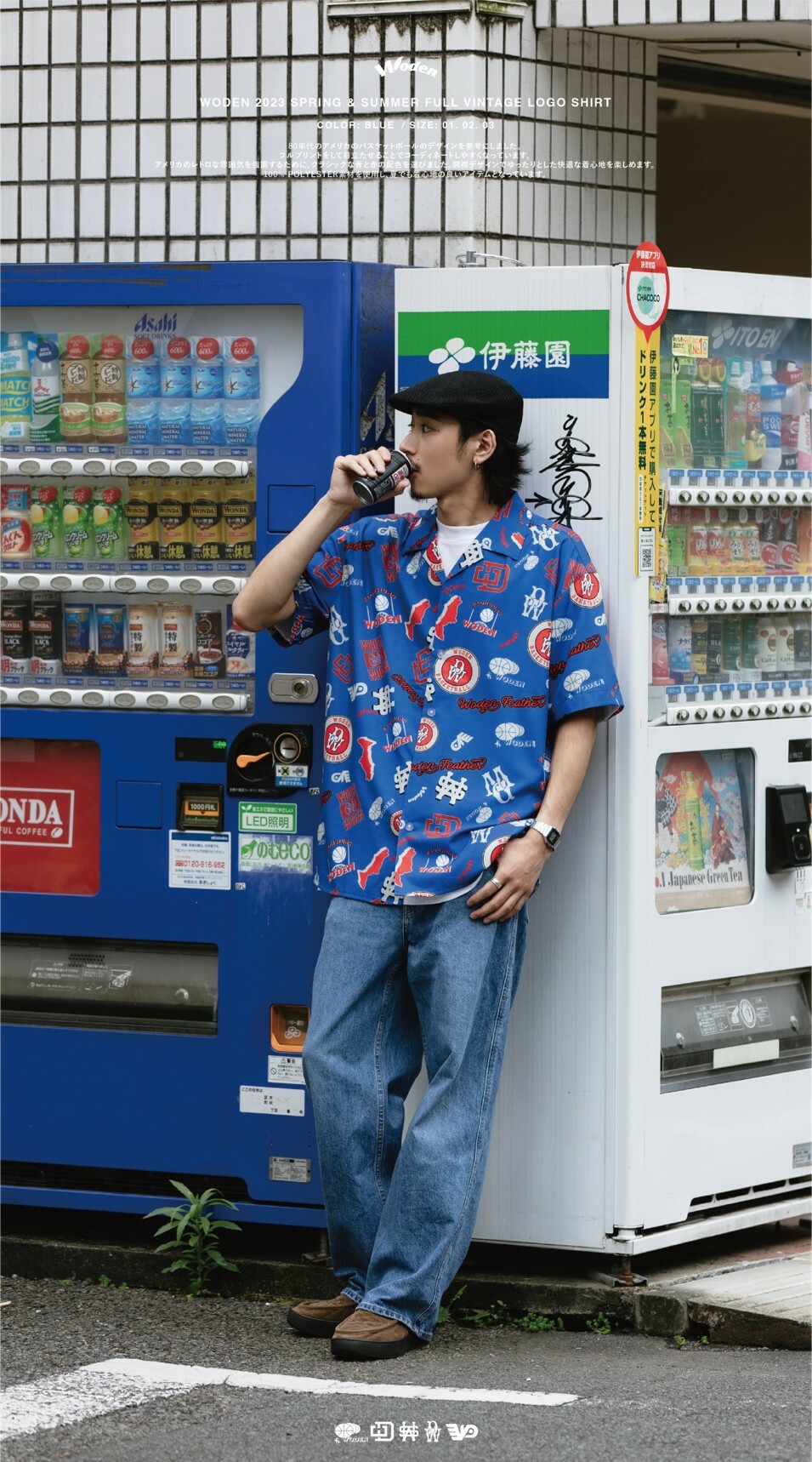 為了強調美式復古氛圍,滿版圖特別選擇了經典藍紅配色,再加入卡其色則作為點綴,使整體設計更加豐富多彩。版型選擇古巴襯衫樣式,除了寬鬆舒適,領子開襟設計特別適合夏日穿著。