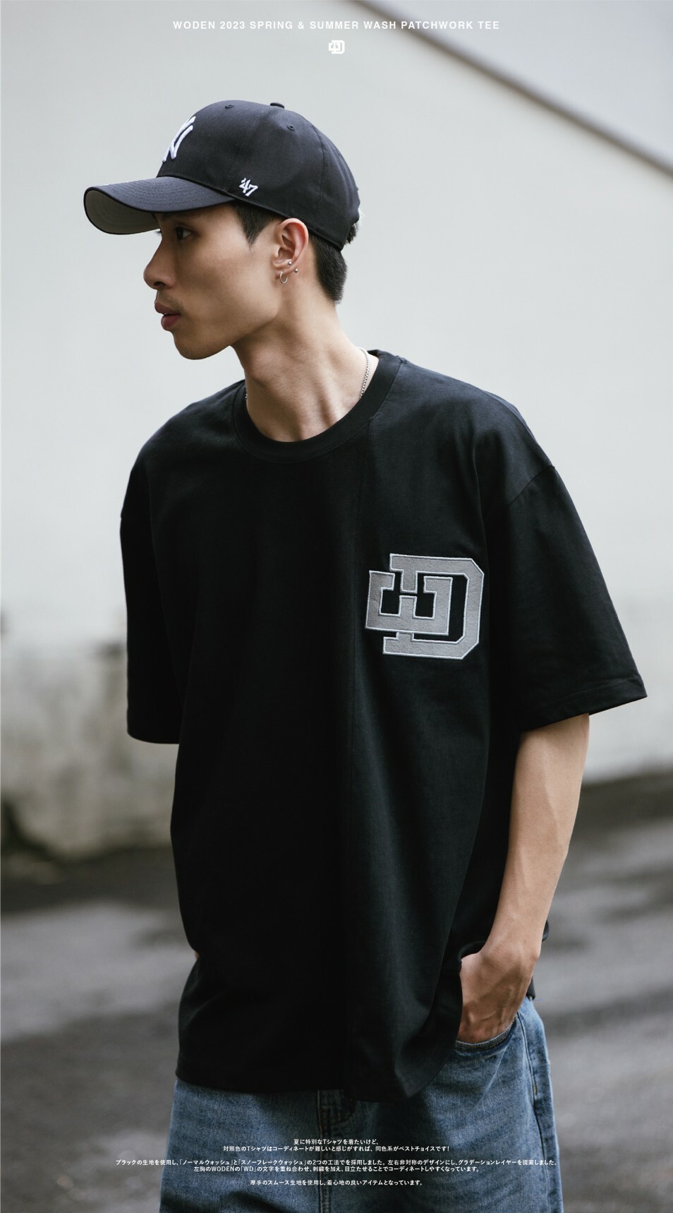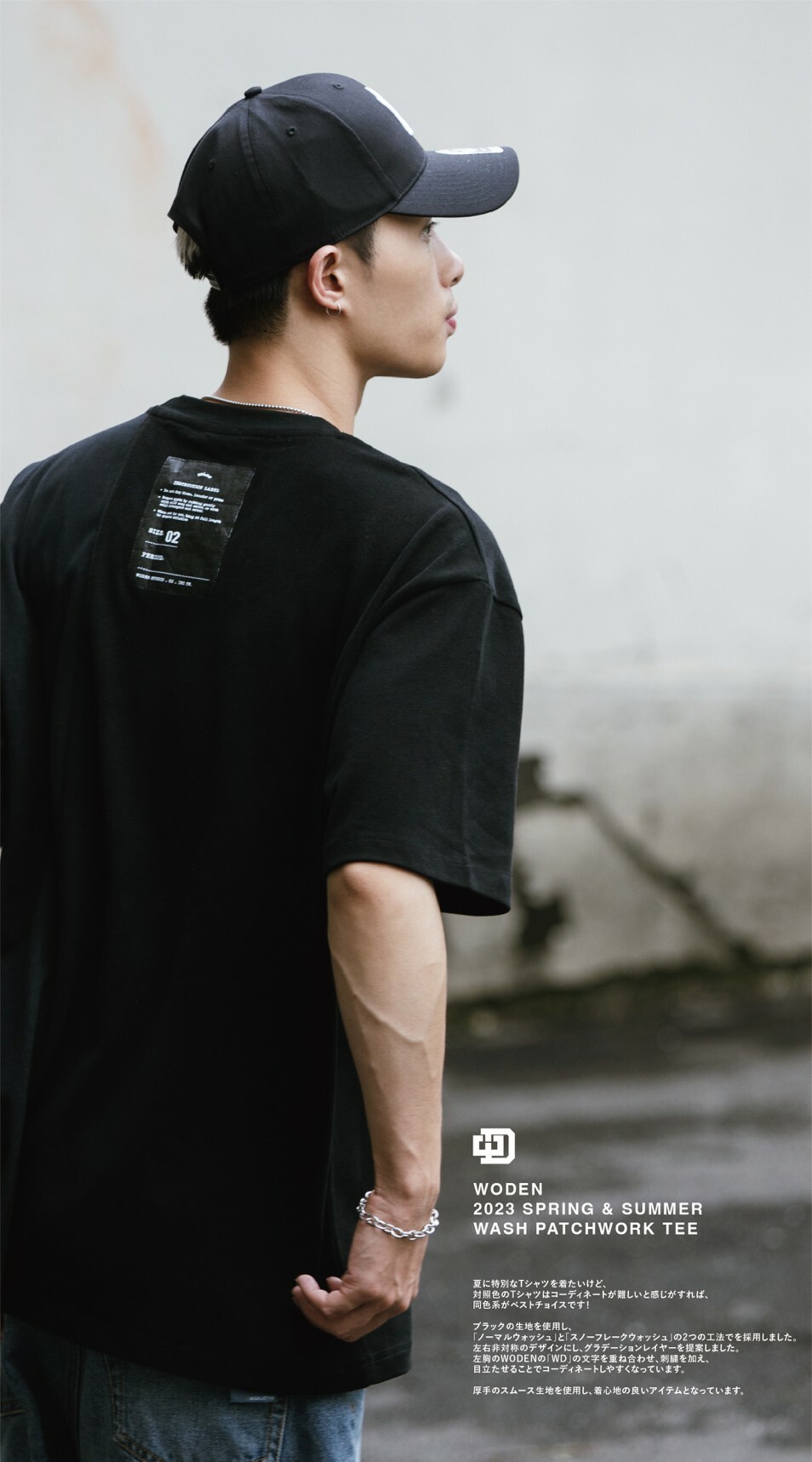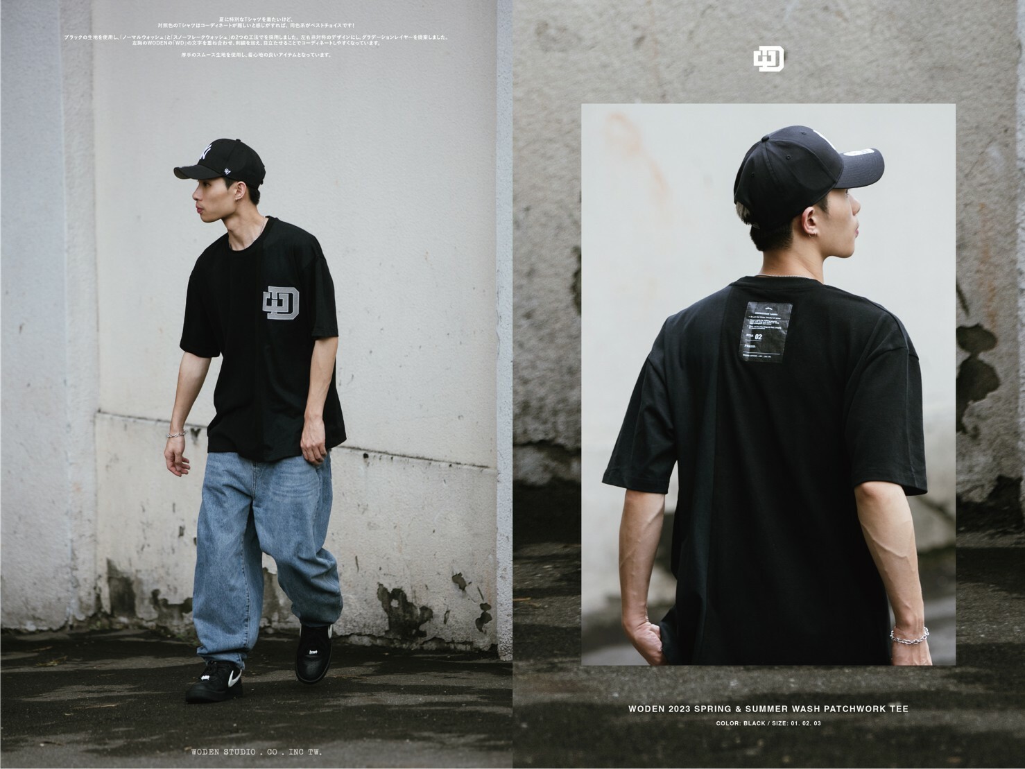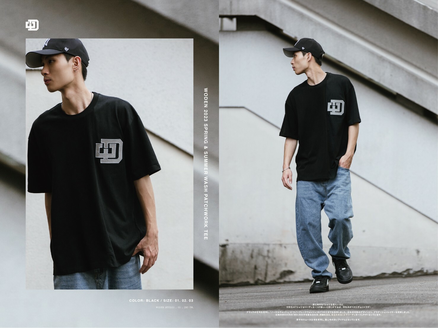 延續WODEN擅長的拼接設計,以黑色面料為基礎,採用『普通洗水』和『雪花洗水』兩種後加工工法。以不對稱的拼接設計,使單品呈現有如褪色褪一半的漸層效果。