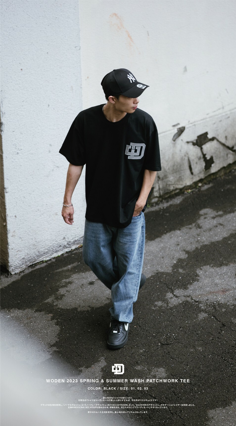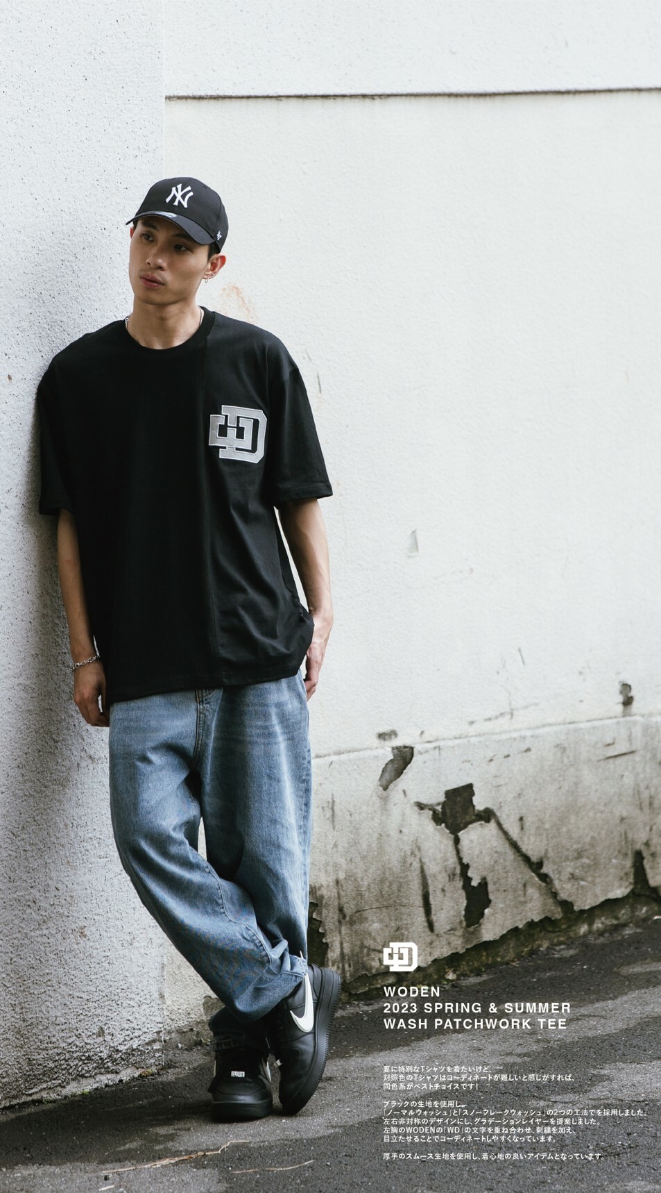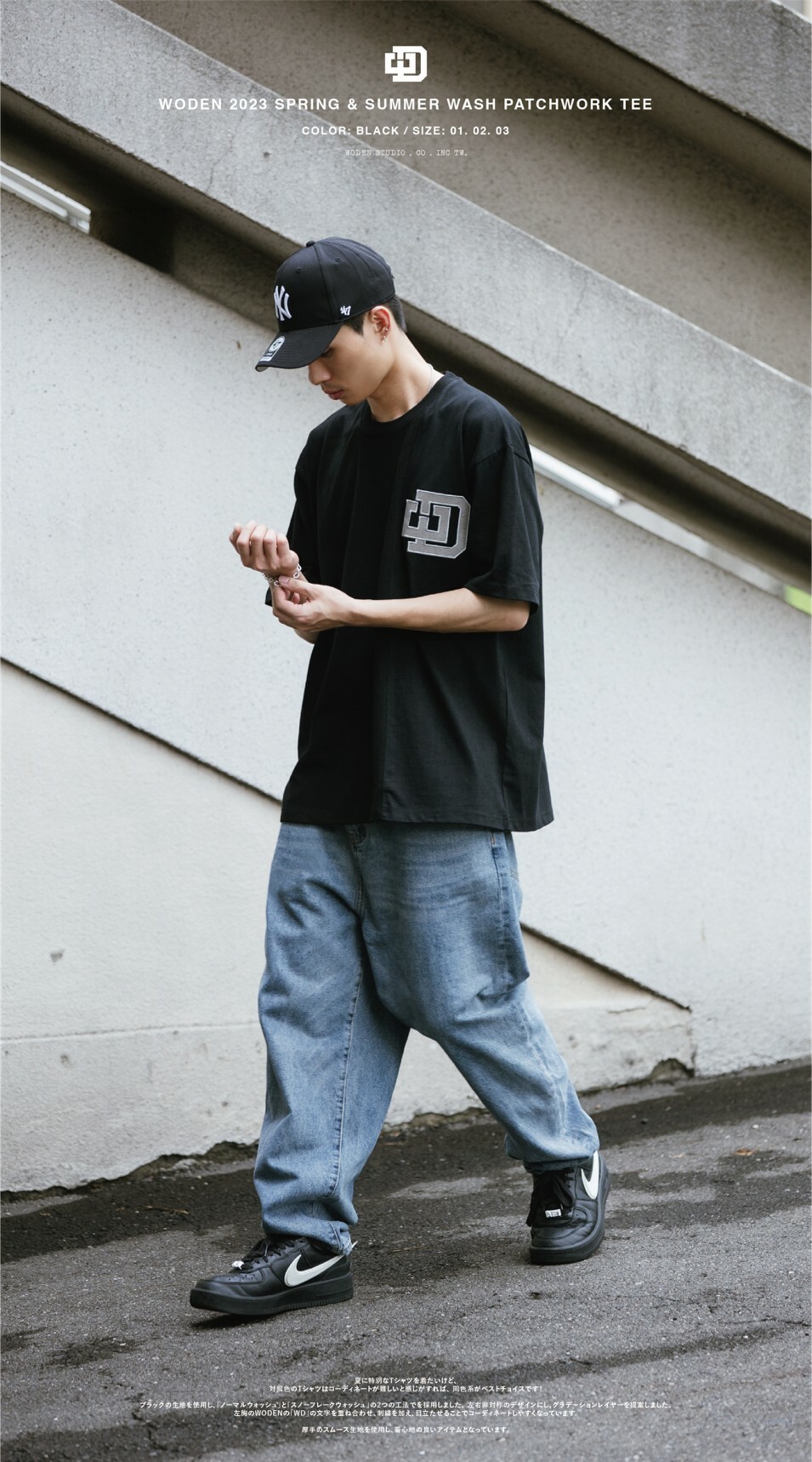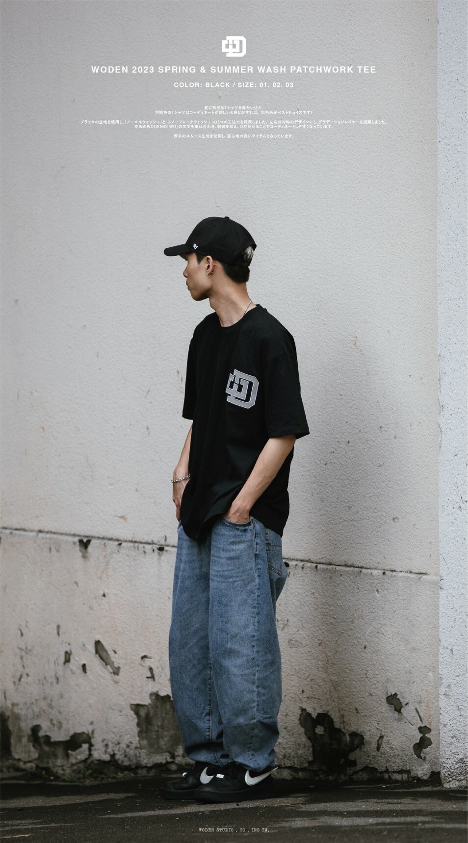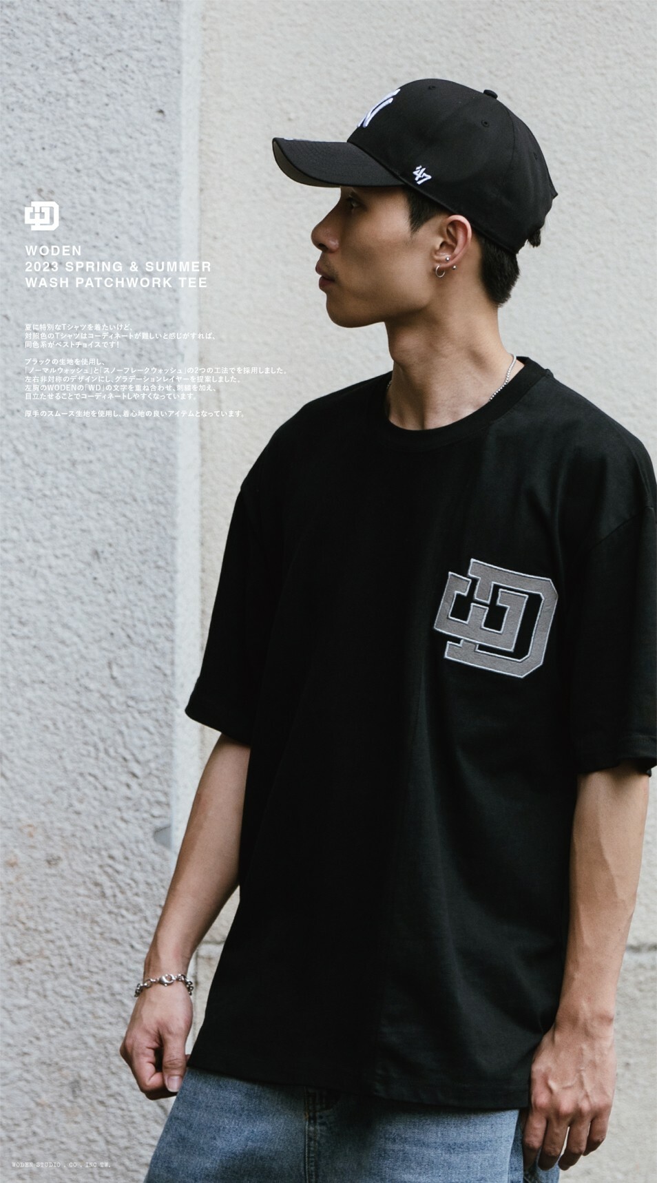 延續WODEN擅長的拼接設計,以黑色面料為基礎,採用『普通洗水』和『雪花洗水』兩種後加工工法。以不對稱的拼接設計,使單品呈現有如褪色褪一半的漸層效果。