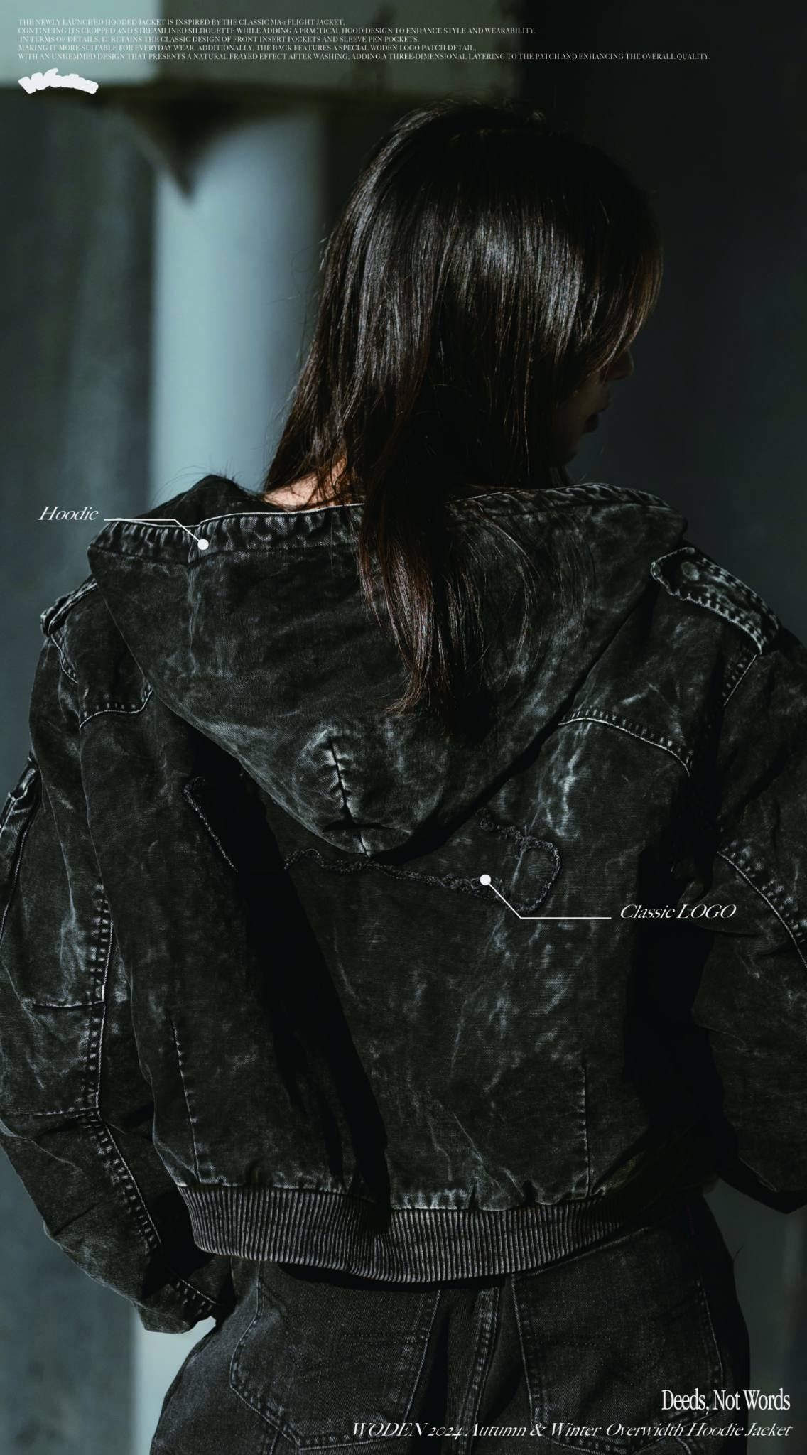 本次推出的連帽外套靈感源自經典MA-1飛行夾克,延續其寬短俐落的版型,加入實用的連帽設計,增添造型感與實穿性。細節上,保留正面插袋與袖部筆袋的經典設計,更加適合日常穿搭。此外,背面特別加入 WODEN LOGO 貼布細節,不收邊設計經過洗水工藝後呈現自然抽鬚效果,增加貼布的立體層次感,讓整體質感更加突出。