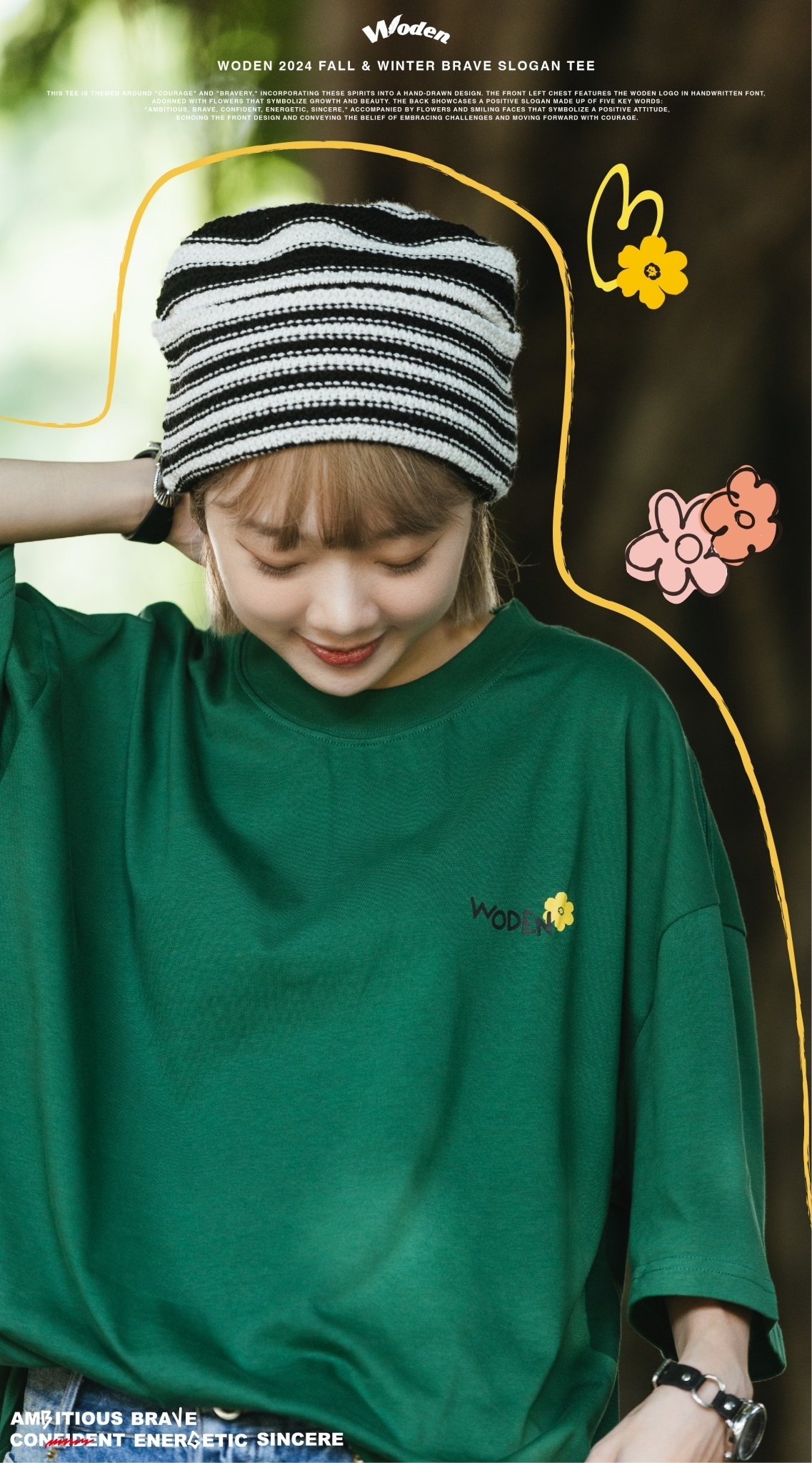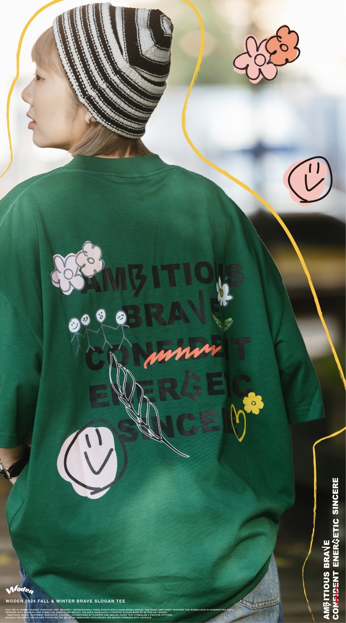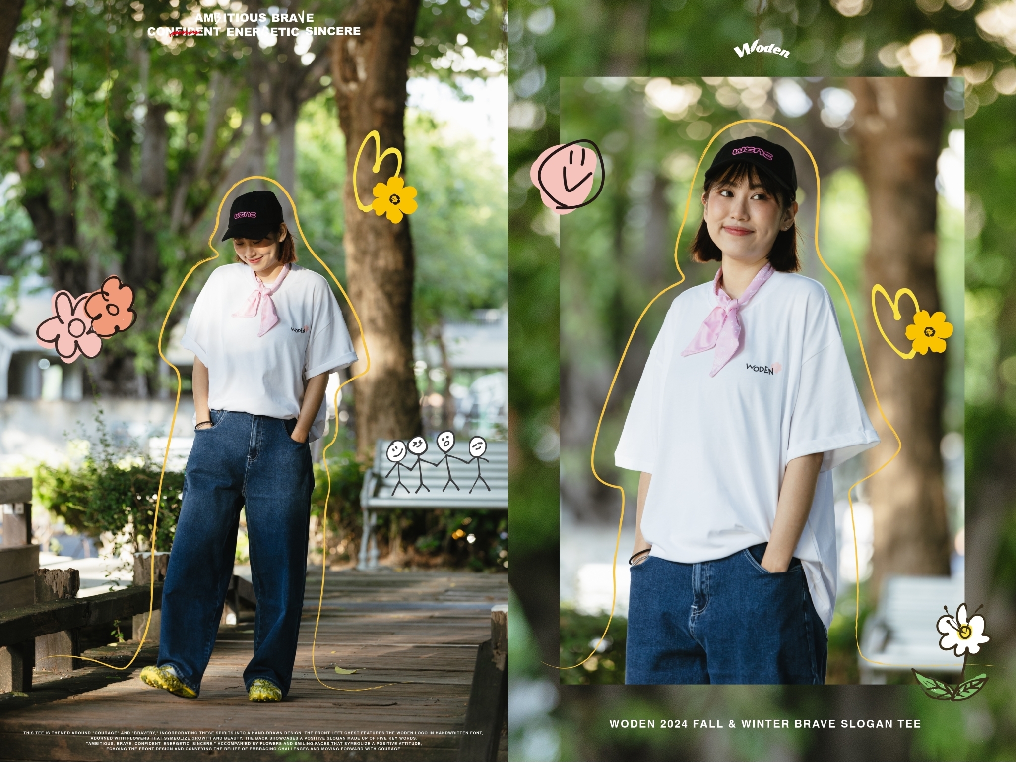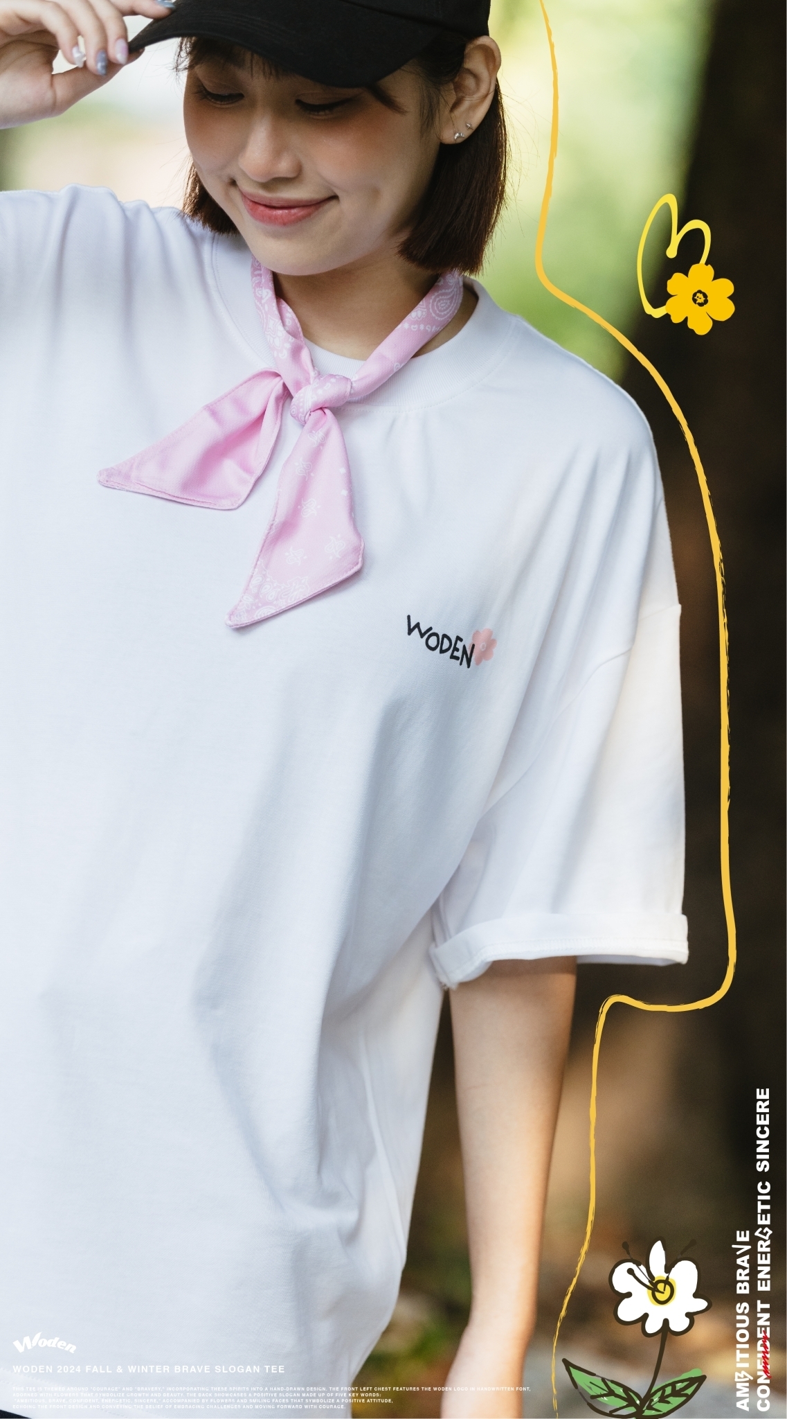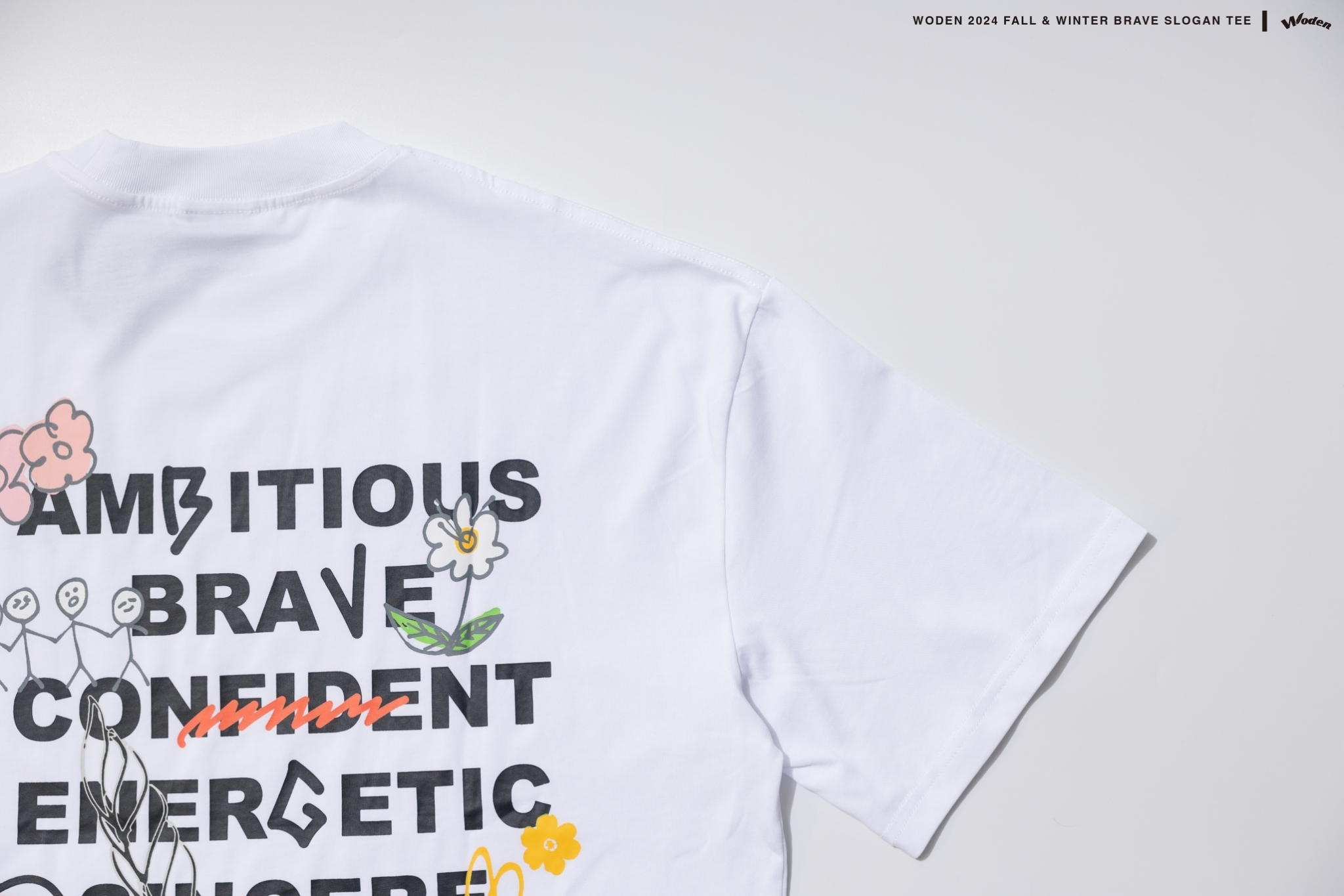 此款短Tee以「勇氣」與「勇敢」為主題,將這些精神融入手繪設計中。正面左胸口以手寫字體呈現 WODEN 標誌,並點綴花朵,象徵成長與美好。背面則以「Ambitious、brave、confident、energetic、sincere」五個關鍵詞組合正向標語,搭配象徵積極態度的花朵和笑臉,與正面圖案相呼應,傳遞迎接挑戰、勇敢向前的信念。