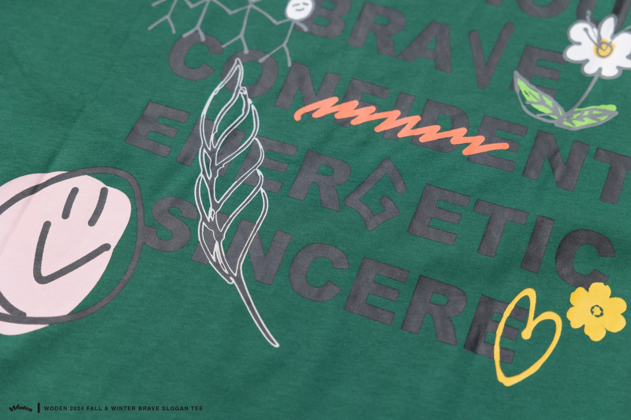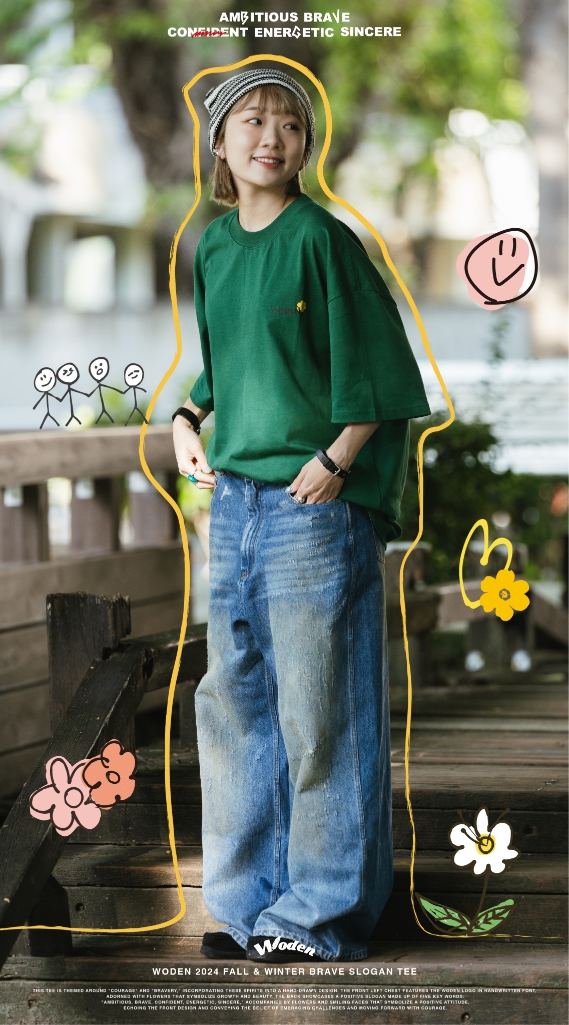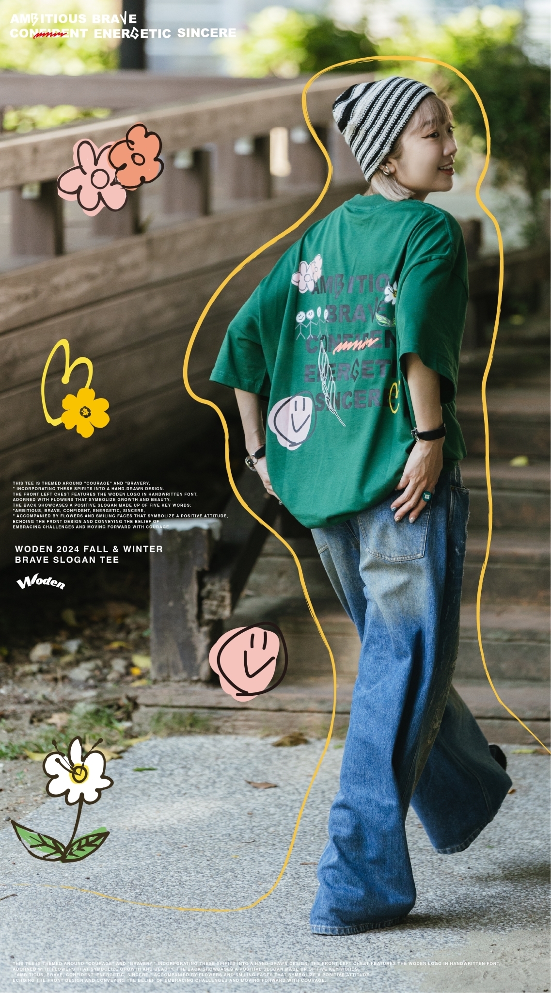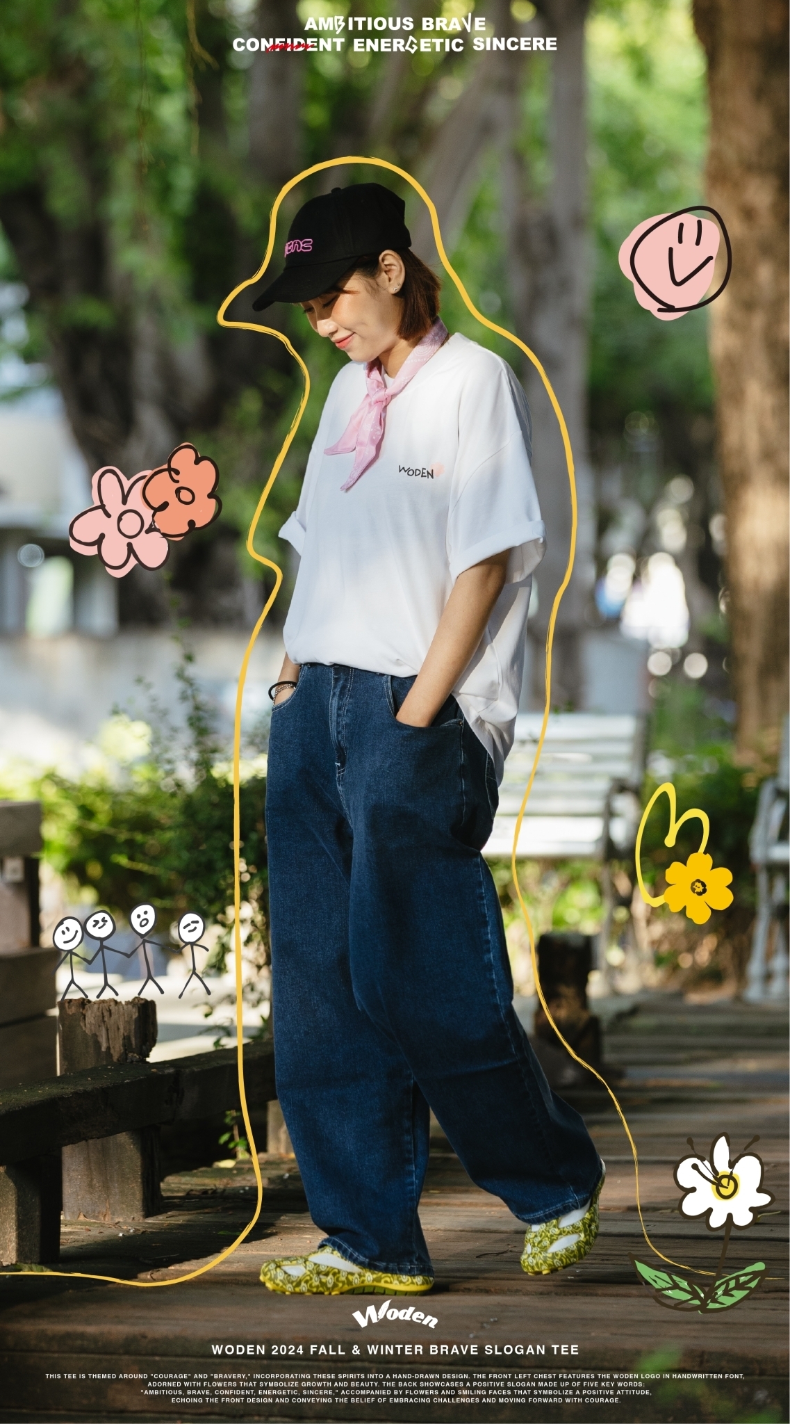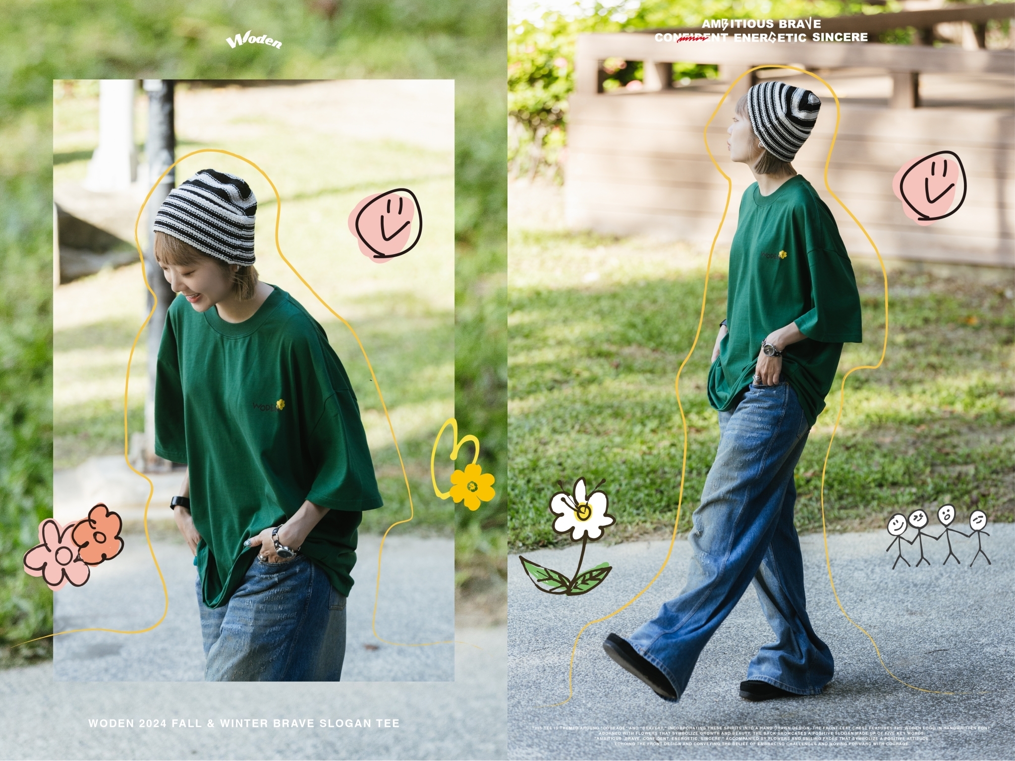 此款短Tee以「勇氣」與「勇敢」為主題,將這些精神融入手繪設計中。正面左胸口以手寫字體呈現 WODEN 標誌,並點綴花朵,象徵成長與美好。背面則以「Ambitious、brave、confident、energetic、sincere」五個關鍵詞組合正向標語,搭配象徵積極態度的花朵和笑臉,與正面圖案相呼應,傳遞迎接挑戰、勇敢向前的信念。