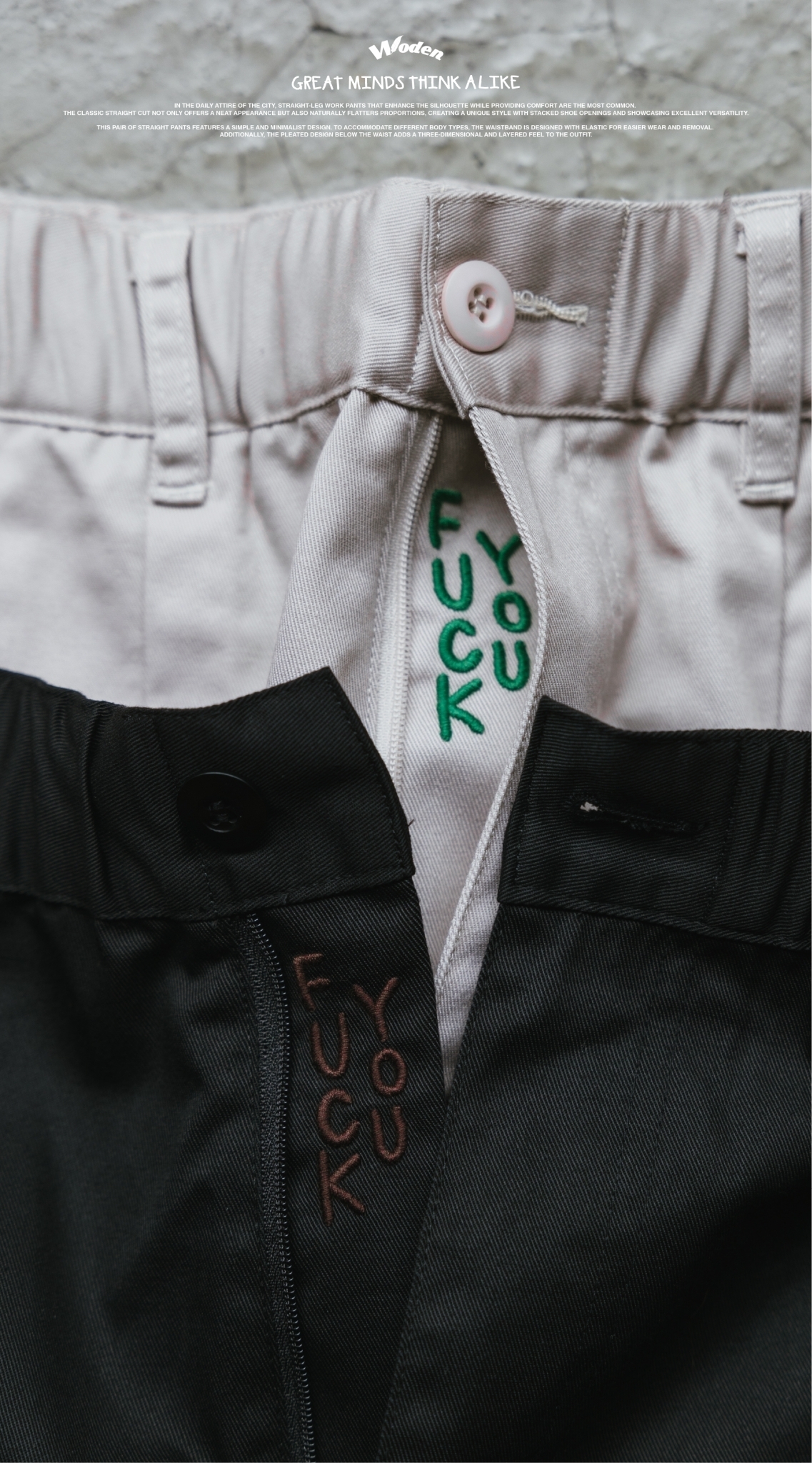 細節部分,背面口袋下方飾有不收邊布塊,搭配鎖鏈邊框與手寫Slogan刺繡,展現隨性與個性風格。小腿側邊的鎖鏈邊框刺繡與背面刺繡設計相互呼應,細節之處盡顯巧思。