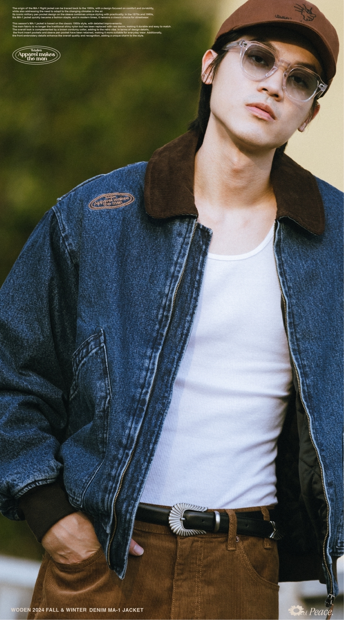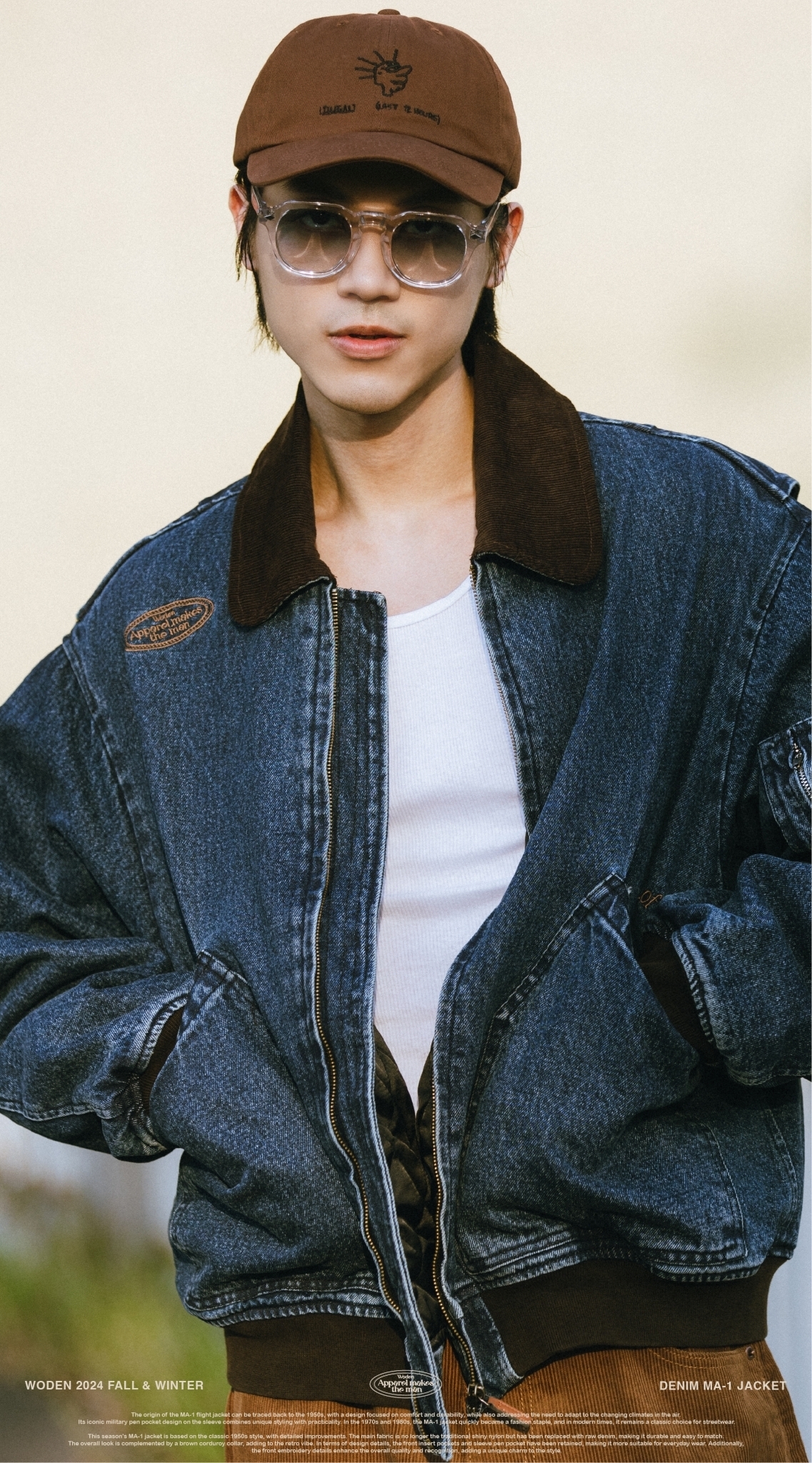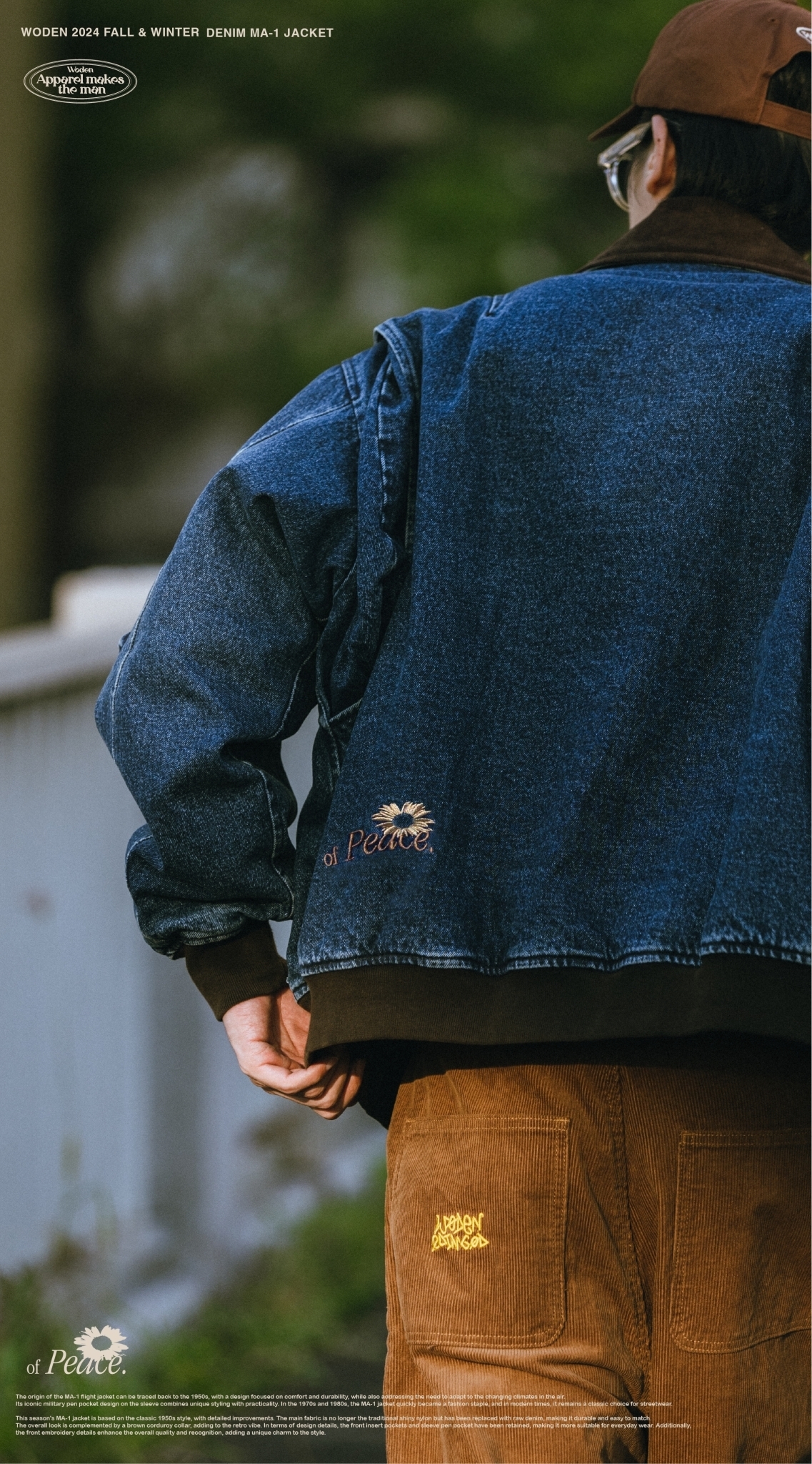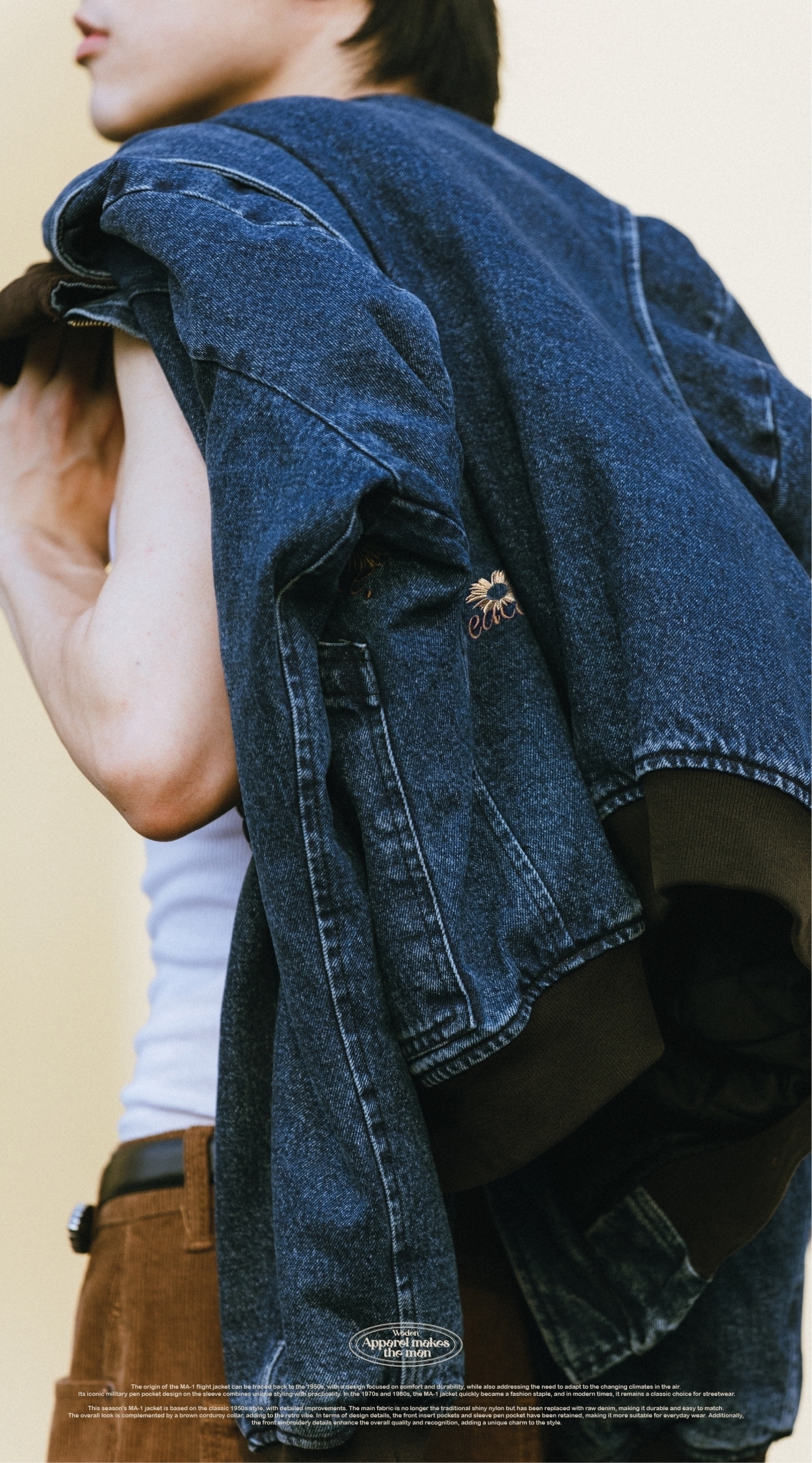 本季的MA-1夾克以經典1950年代經典款式為基礎,進行了細節改良。主布料不再採用傳統的亮面尼龍,而是選用了原色牛仔布,耐穿易搭,整體搭配棕色燈芯絨領子,更增添復古氛圍。細節設計上,保留了正面插袋和袖部筆袋,使其更適合日常穿搭,同時正面電繡細節提升整體質感和辨識度,為造型增添獨特韻味。