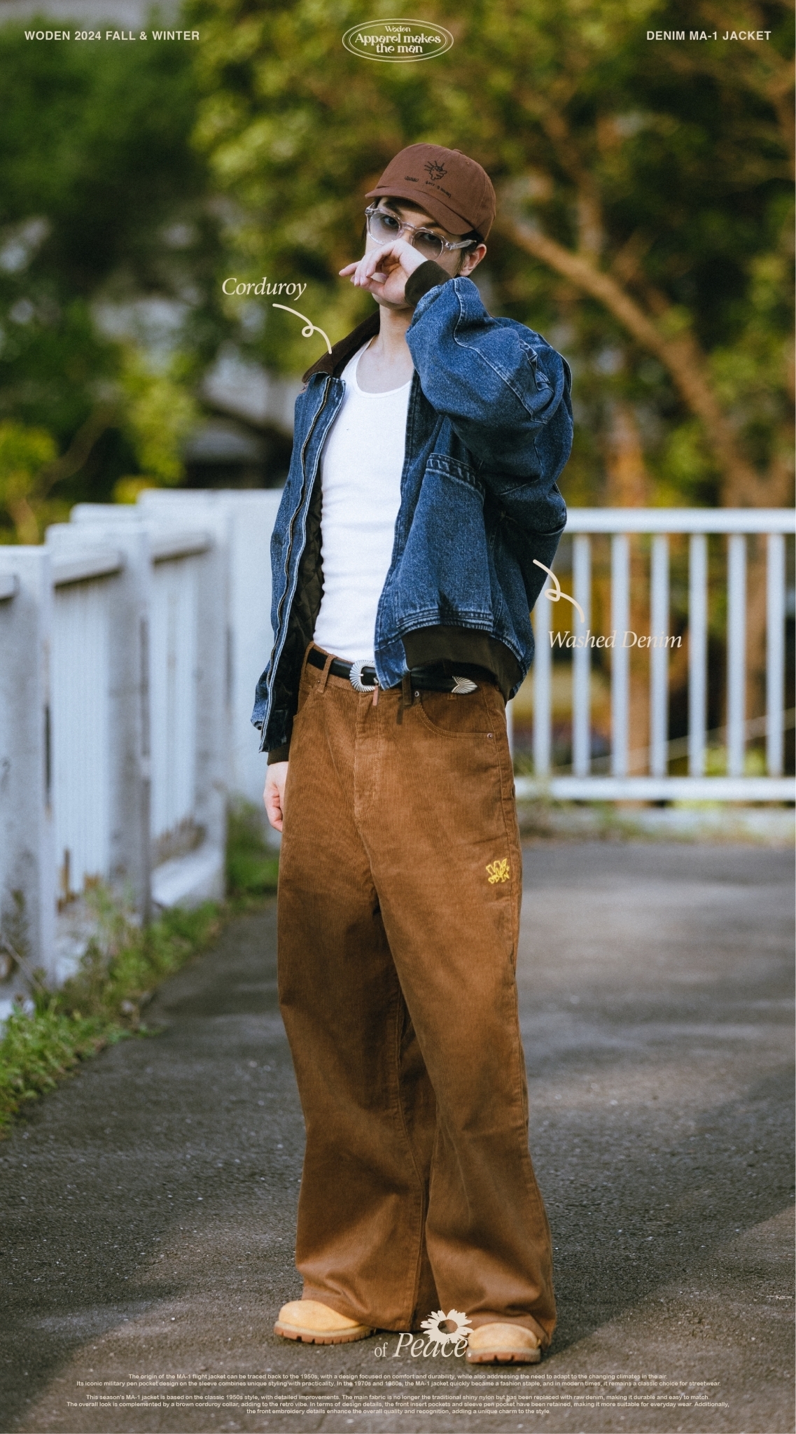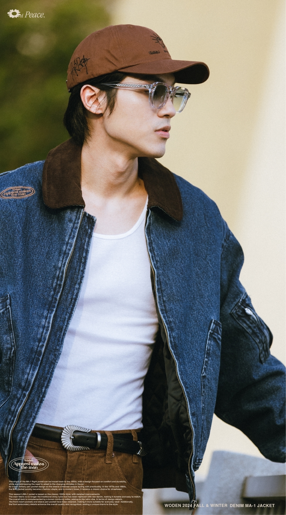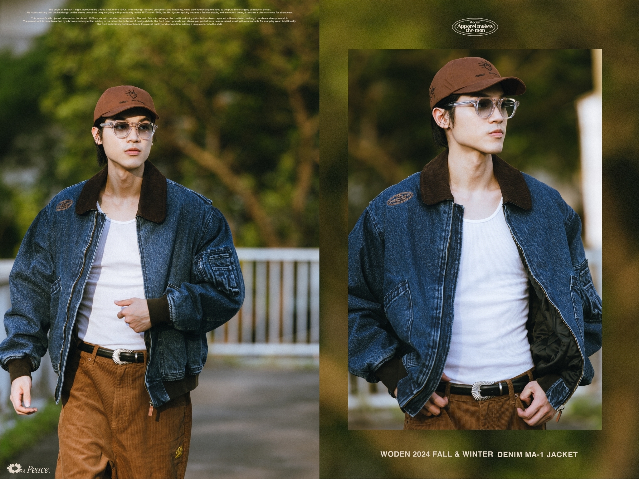 本季的MA-1夾克以經典1950年代經典款式為基礎,進行了細節改良。主布料不再採用傳統的亮面尼龍,而是選用了原色牛仔布,耐穿易搭,整體搭配棕色燈芯絨領子,更增添復古氛圍。細節設計上,保留了正面插袋和袖部筆袋,使其更適合日常穿搭,同時正面電繡細節提升整體質感和辨識度,為造型增添獨特韻味。