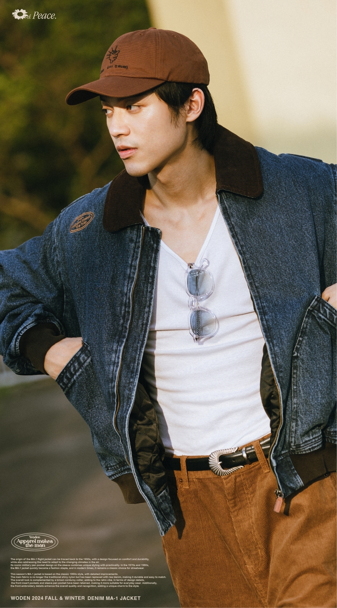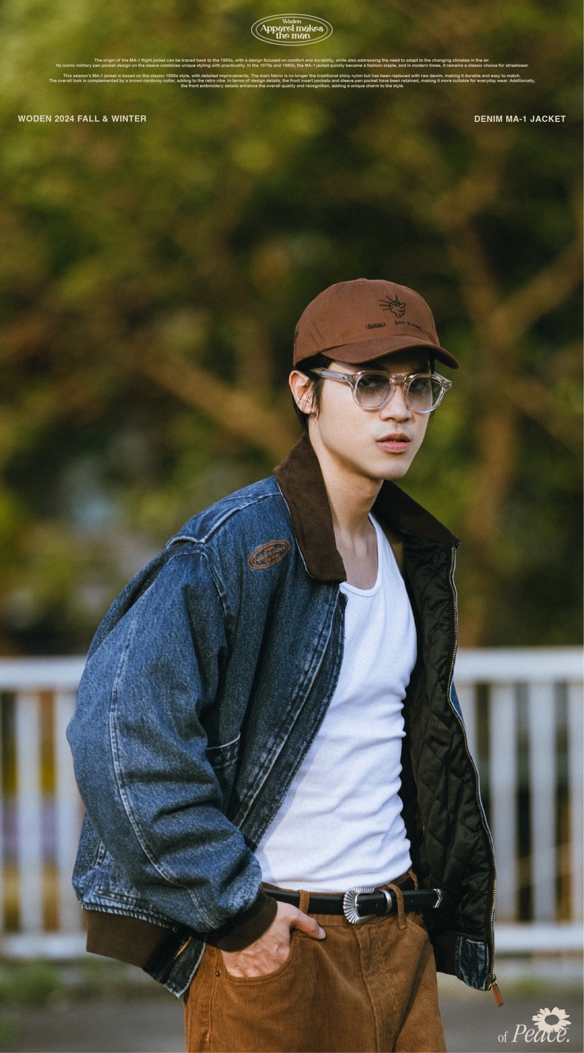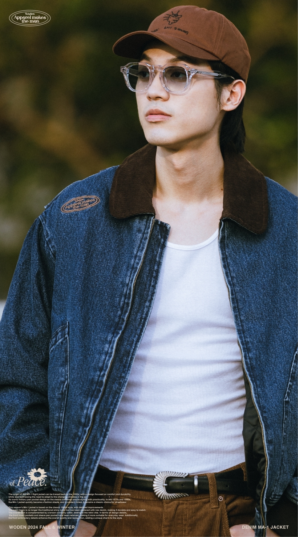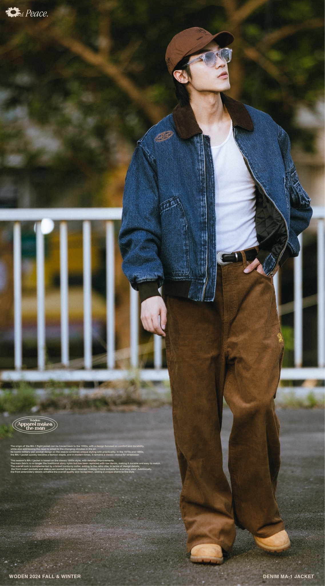 本季的MA-1夾克以經典1950年代經典款式為基礎,進行了細節改良。主布料不再採用傳統的亮面尼龍,而是選用了原色牛仔布,耐穿易搭,整體搭配棕色燈芯絨領子,更增添復古氛圍。細節設計上,保留了正面插袋和袖部筆袋,使其更適合日常穿搭,同時正面電繡細節提升整體質感和辨識度,為造型增添獨特韻味。