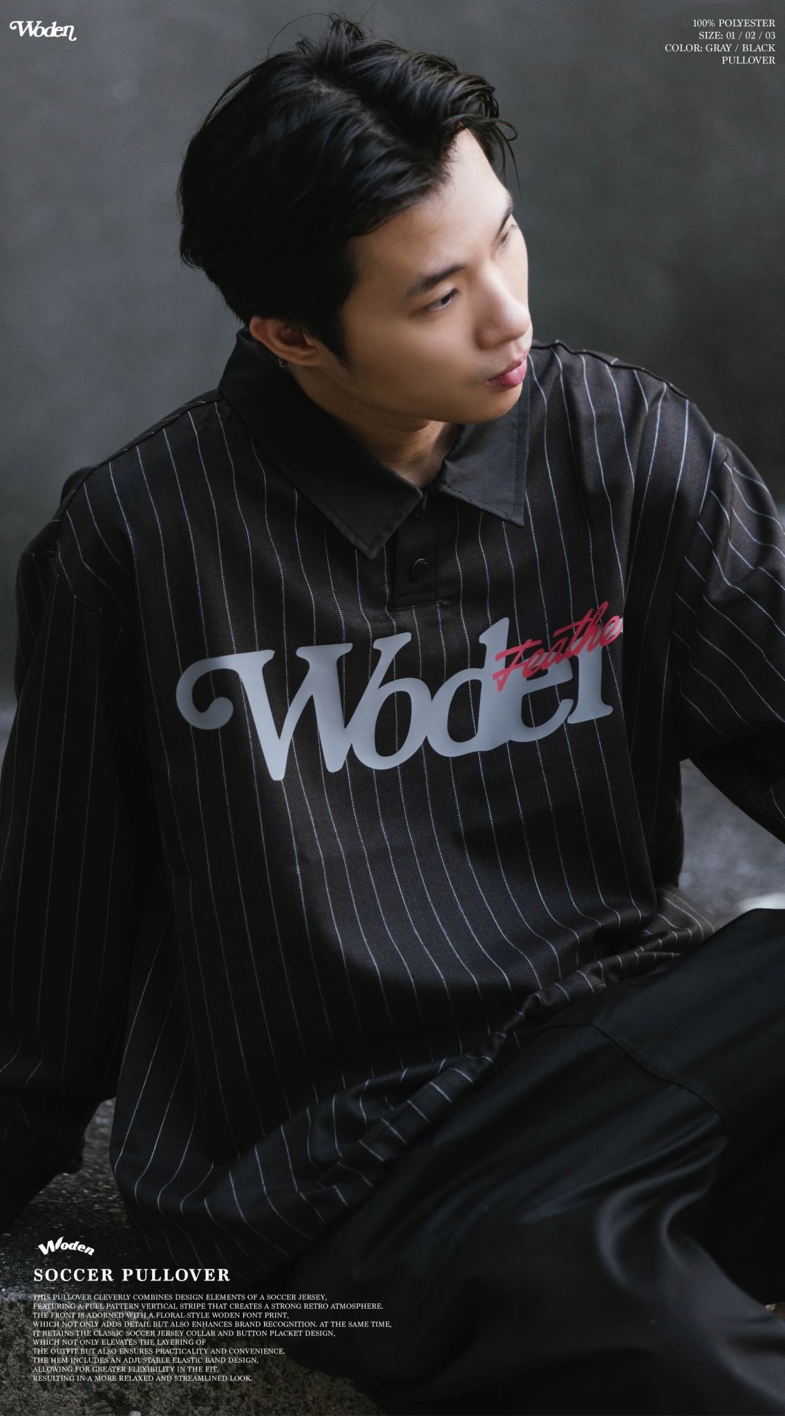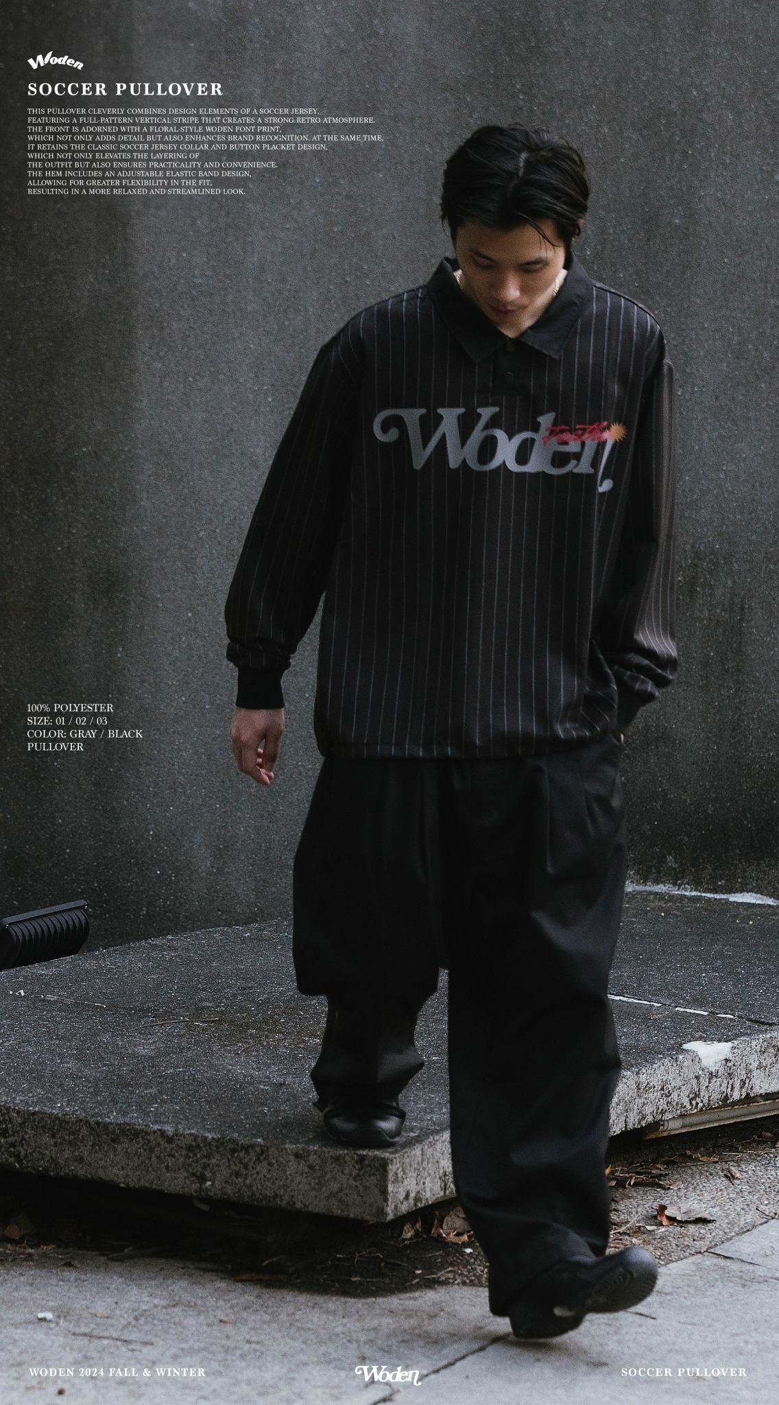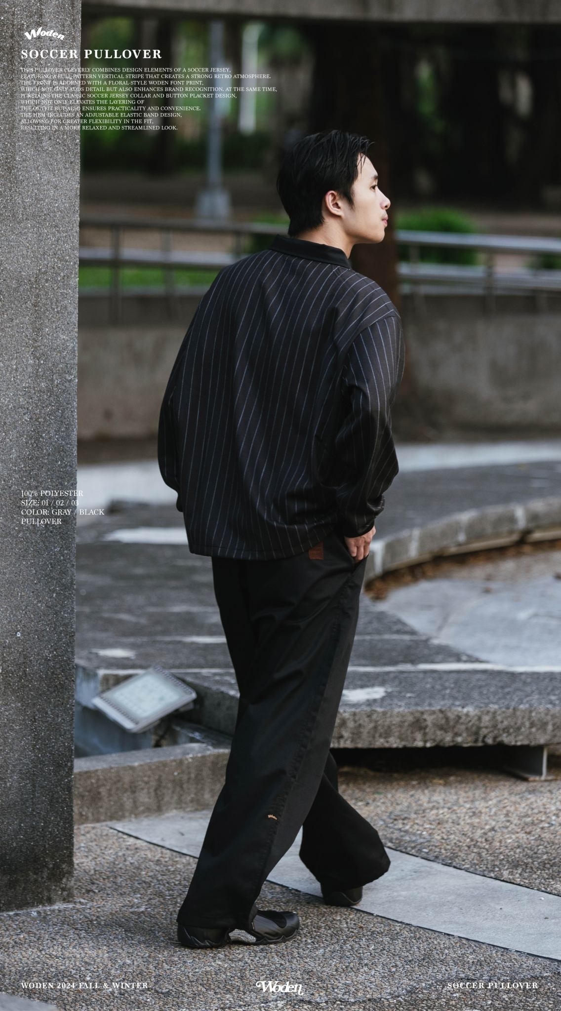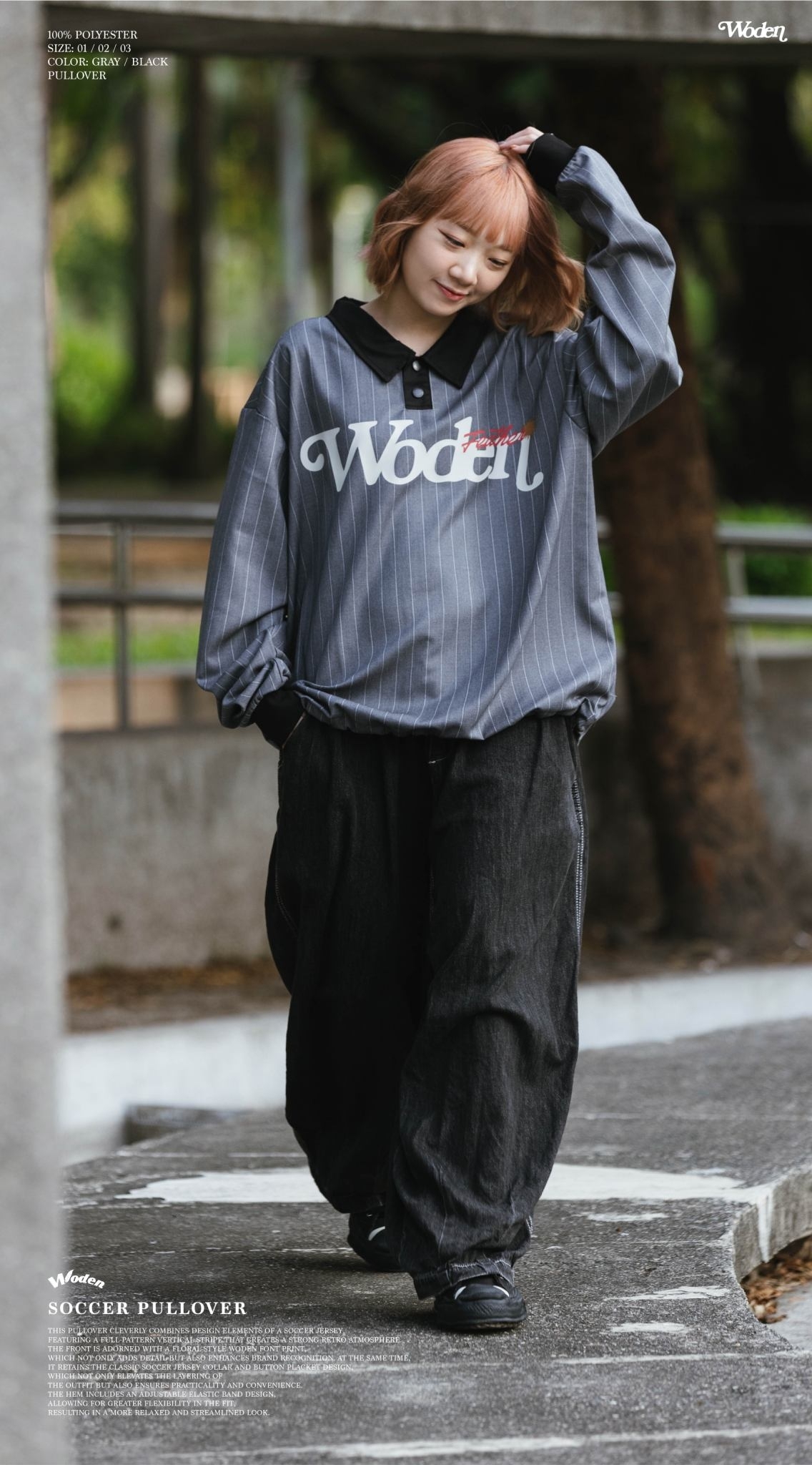 此款罩衫巧妙結合足球衣設計元素,以滿版直條紋呈現,營造濃厚的復古氛圍。正面搭配雕花風格的 WODEN 字體印花,不僅增添細節,也強化品牌辨識度。同時,保留經典的足球衣領與排釦設計,不僅提升穿搭層次感,亦兼具實穿性與方便性。下擺加入可調節鬆緊帶設計,讓版型更具靈活性,穿著效果更加寬鬆俐落。