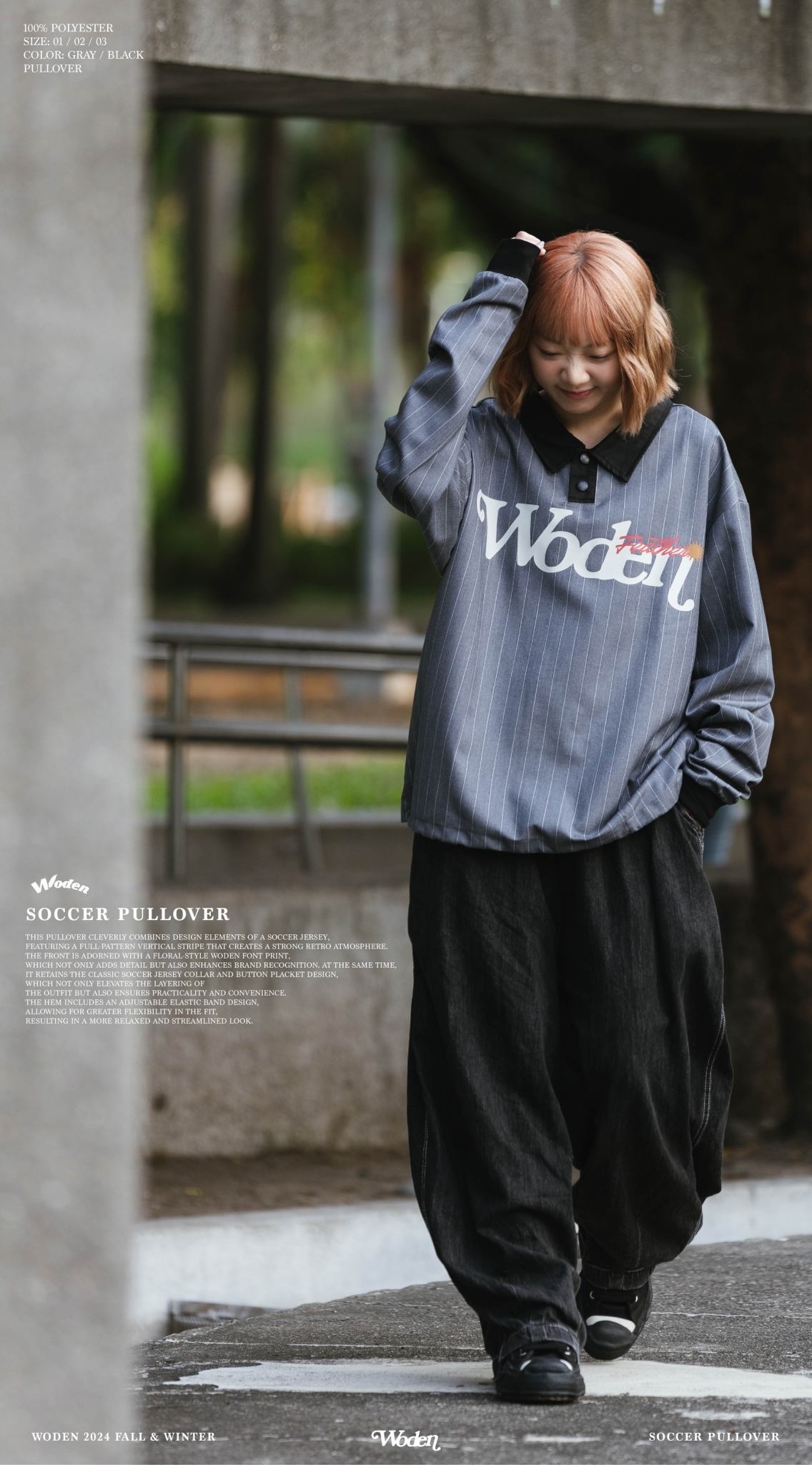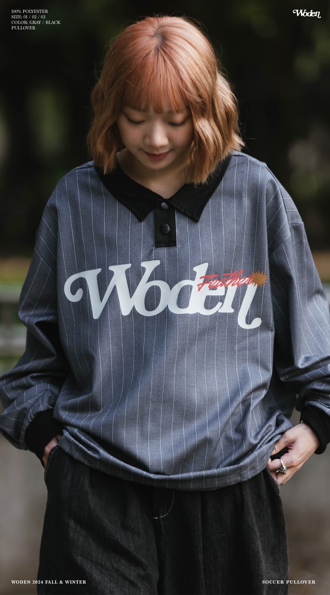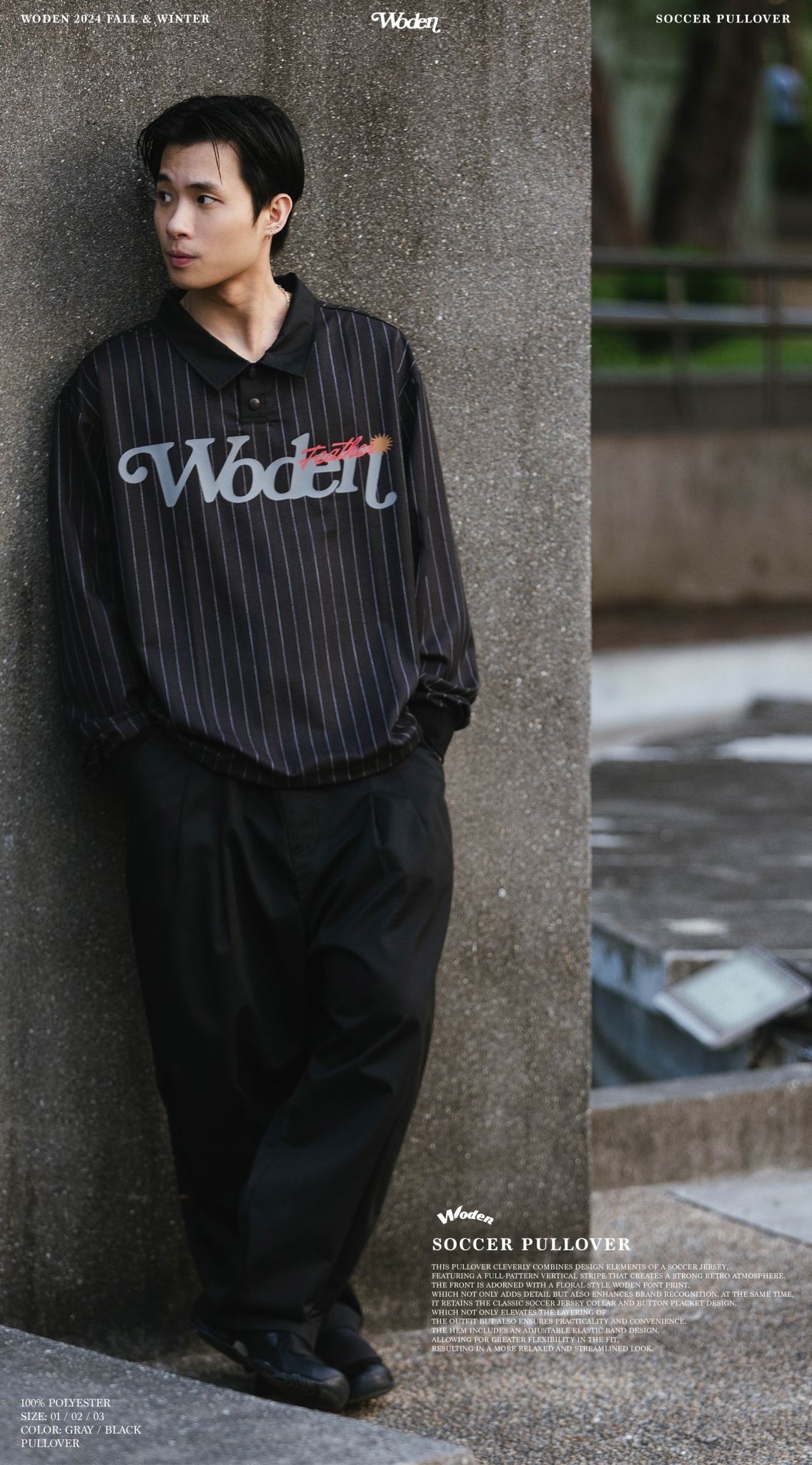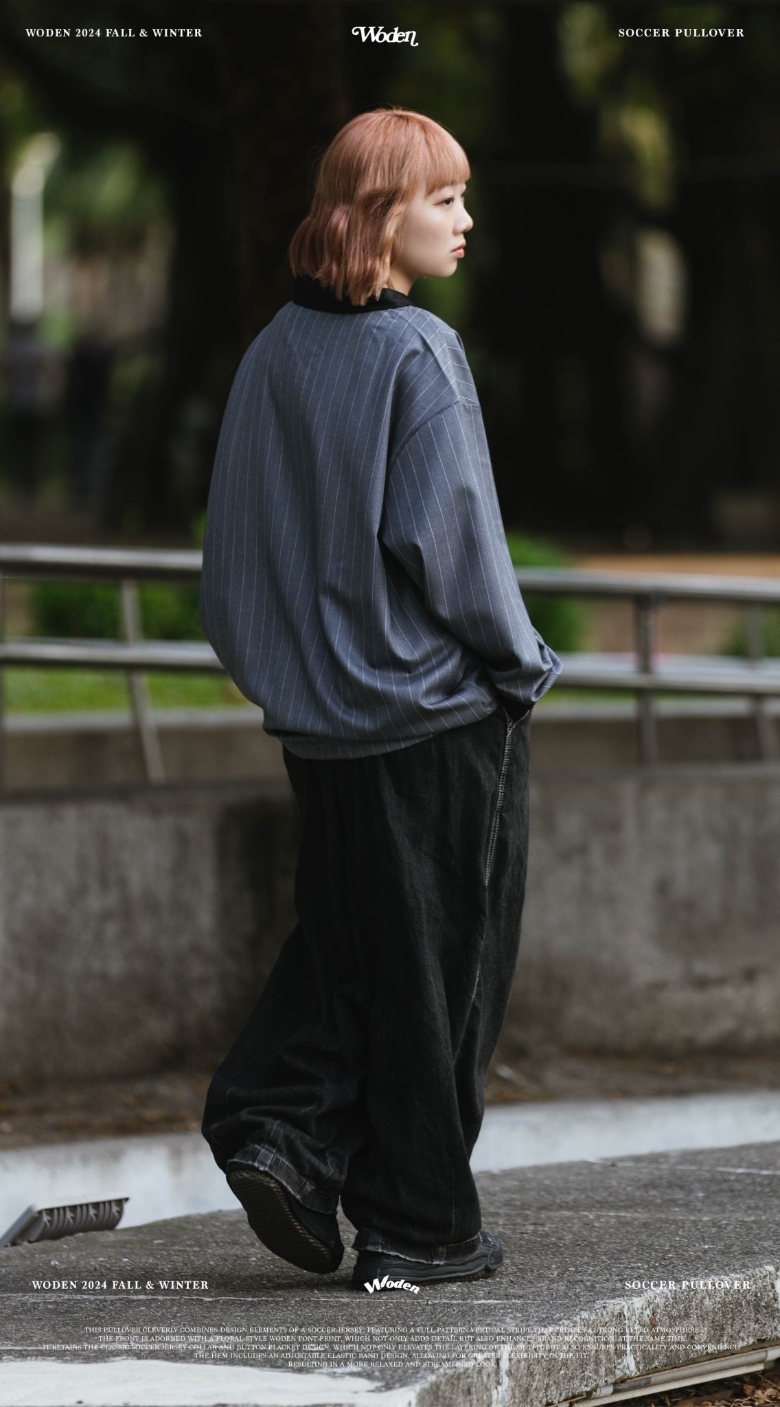 此款罩衫巧妙結合足球衣設計元素,以滿版直條紋呈現,營造濃厚的復古氛圍。正面搭配雕花風格的 WODEN 字體印花,不僅增添細節,也強化品牌辨識度。同時,保留經典的足球衣領與排釦設計,不僅提升穿搭層次感,亦兼具實穿性與方便性。下擺加入可調節鬆緊帶設計,讓版型更具靈活性,穿著效果更加寬鬆俐落。
