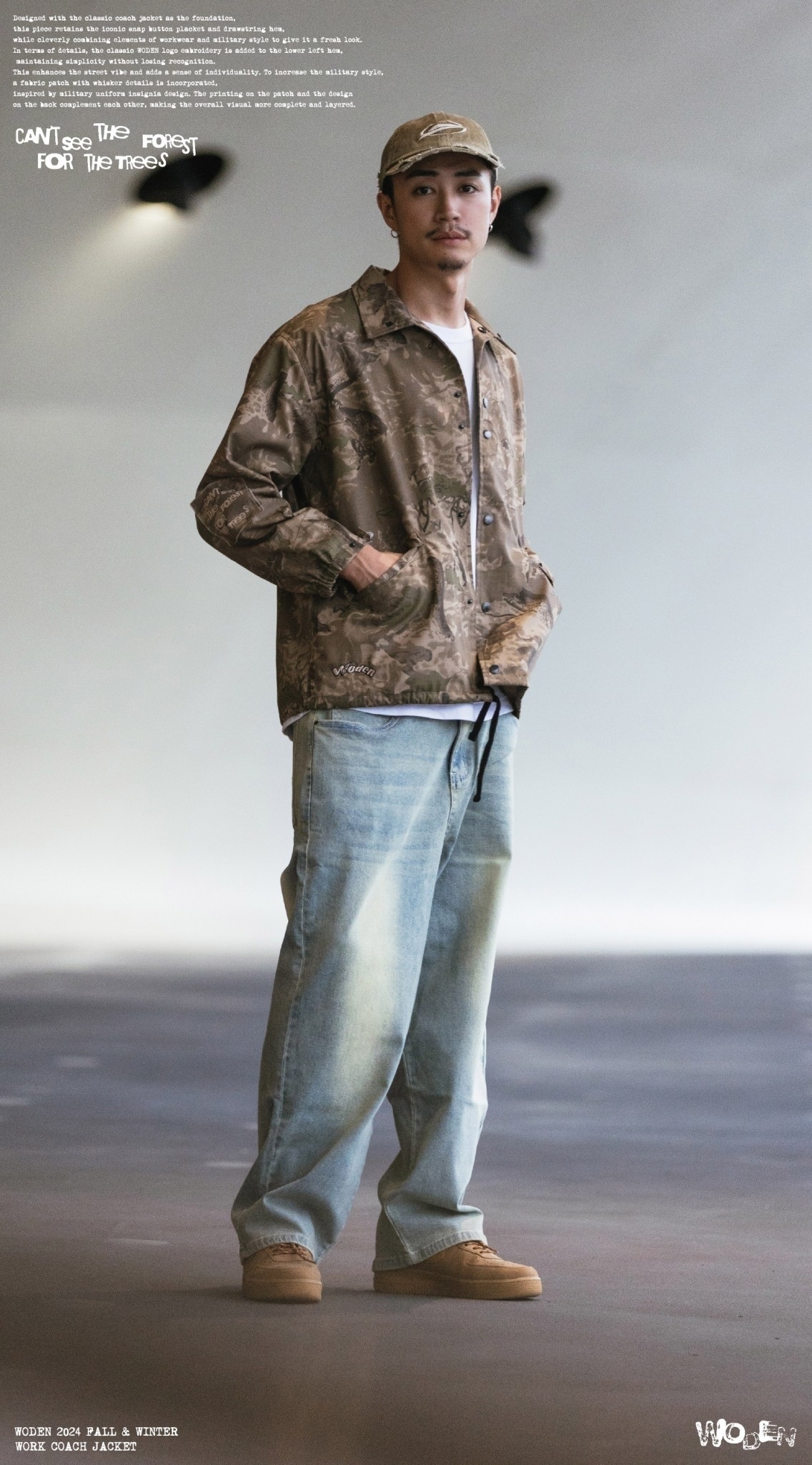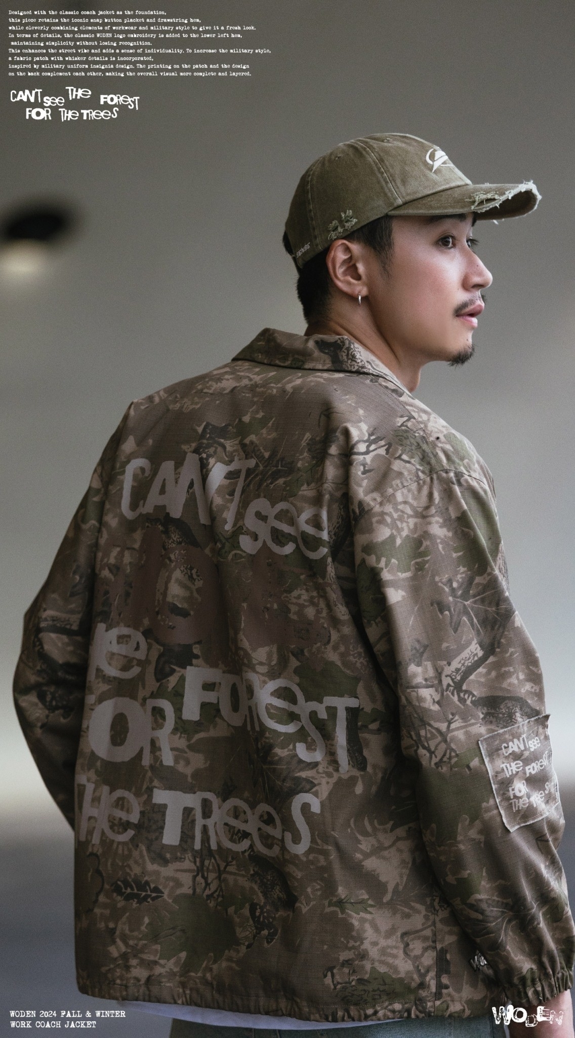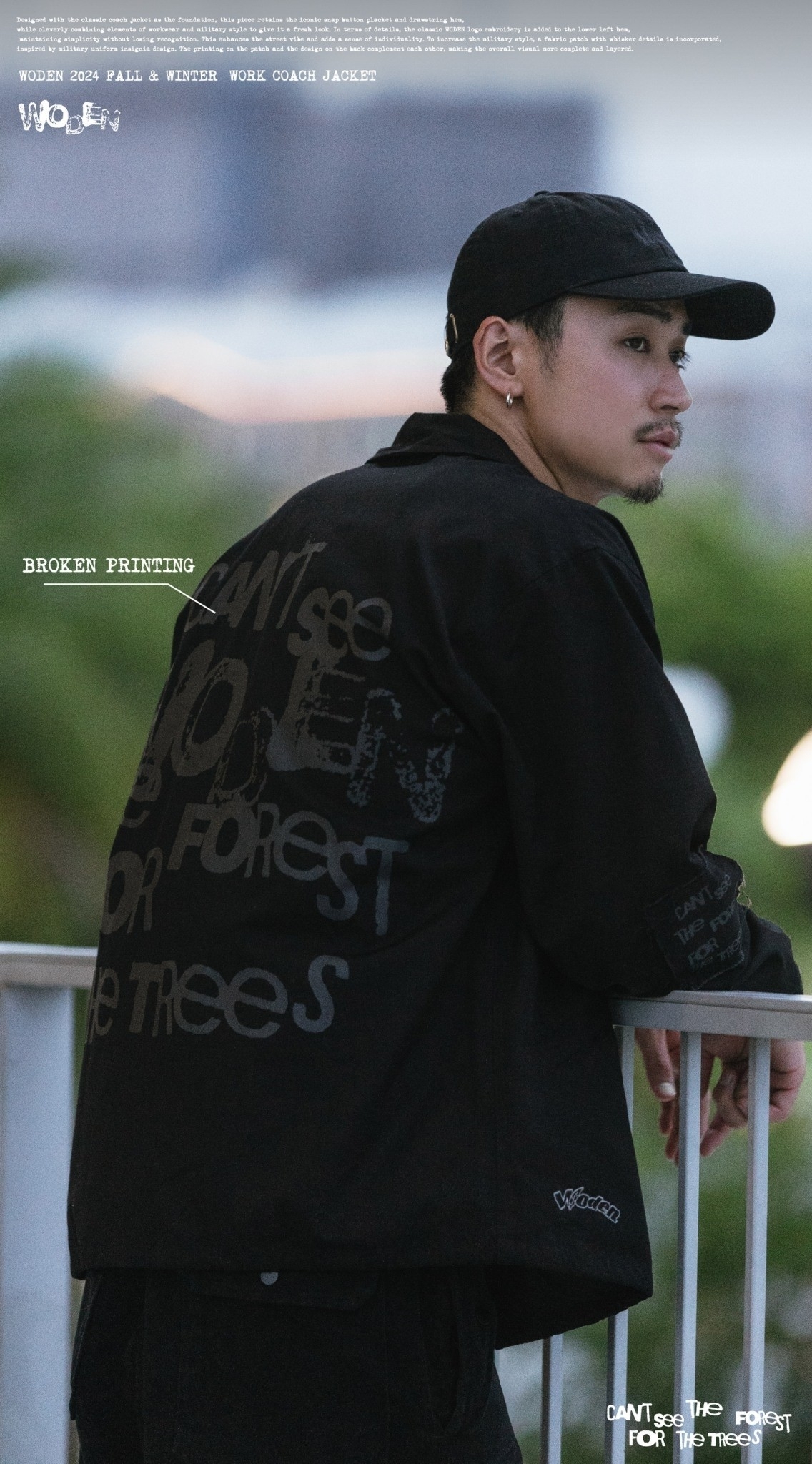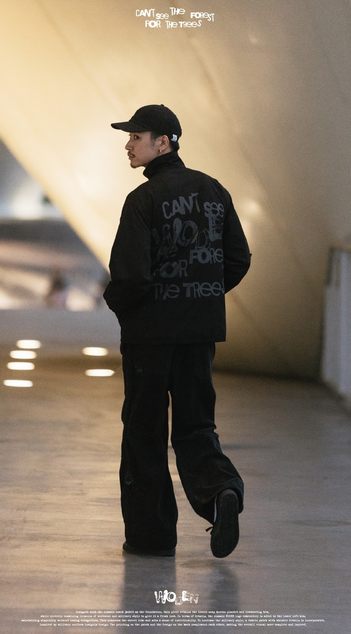 設計以經典教練外套為基底,保留了標誌性的按扣門襟與下擺抽繩,並巧妙結合工作外套與軍裝元素,賦予其全新風貌。細節部分,左下擺加入 WODEN 經典 LOGO 刺繡,簡約而不失辨識度。增添街頭感與個性張力。為了增加軍裝風格,參考軍服臂章設計,加入帶有抽鬚細節的布塊,布塊上的印刷與背面設計相互呼應,使整體視覺更加完整且層次豐富。