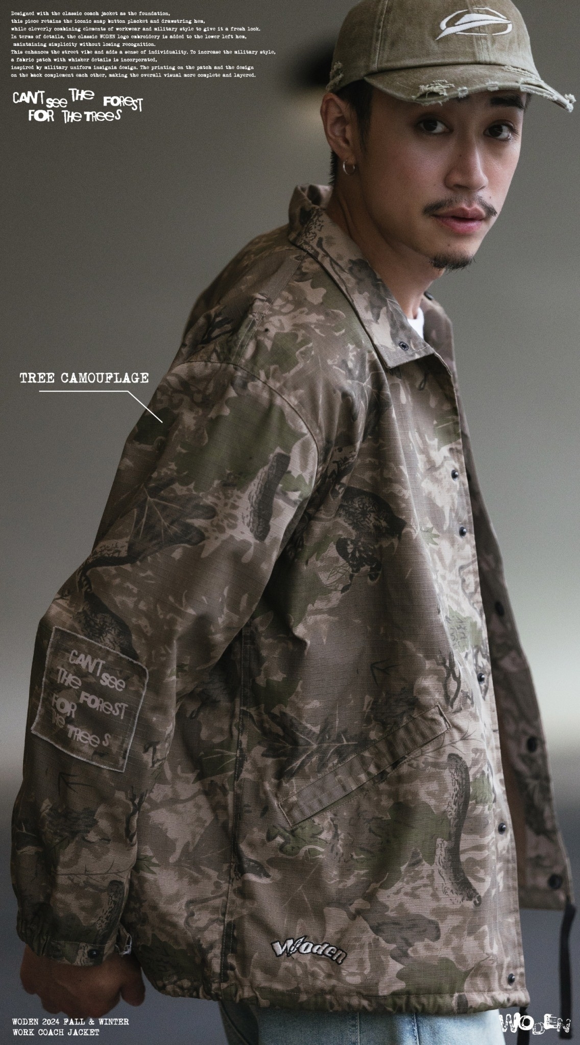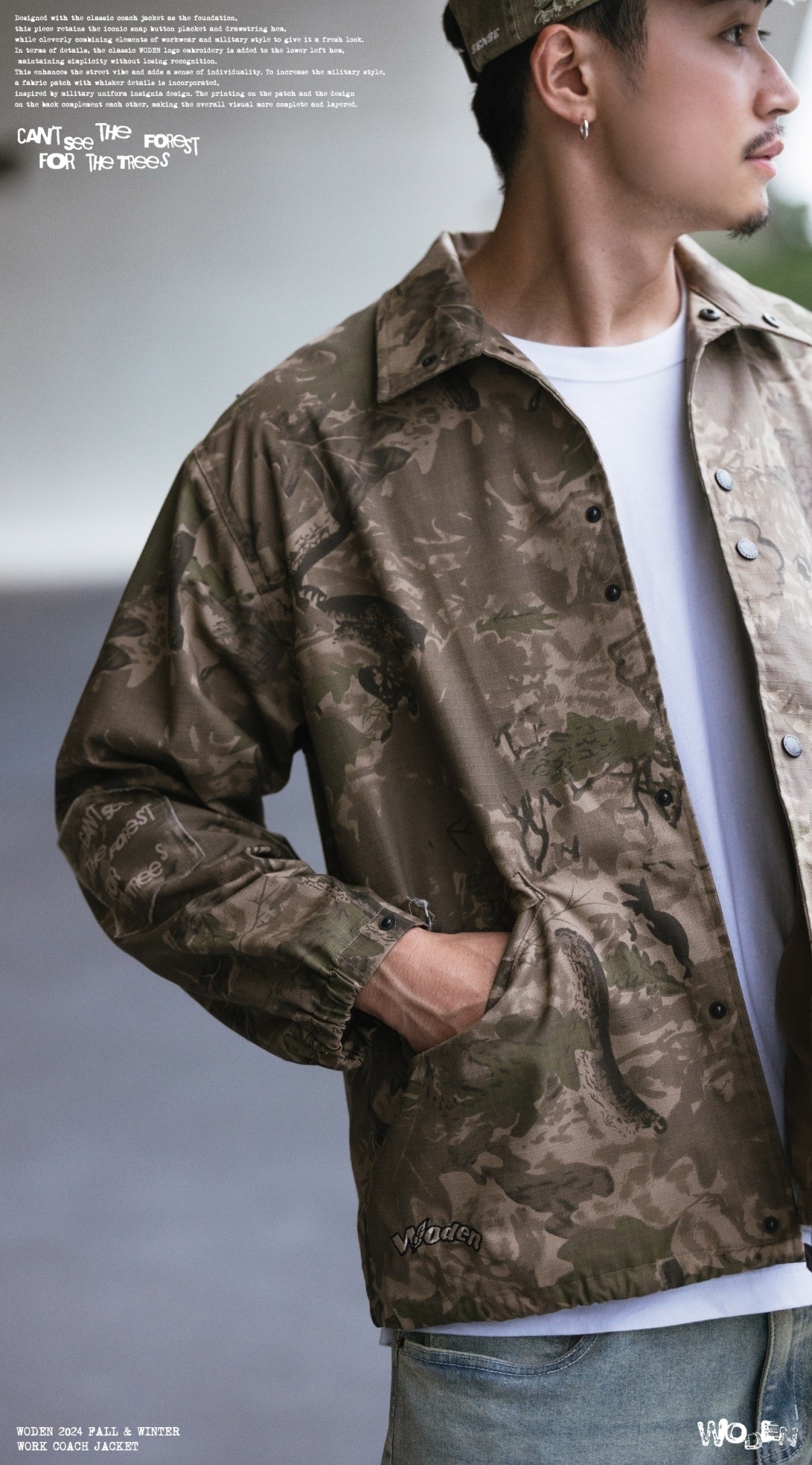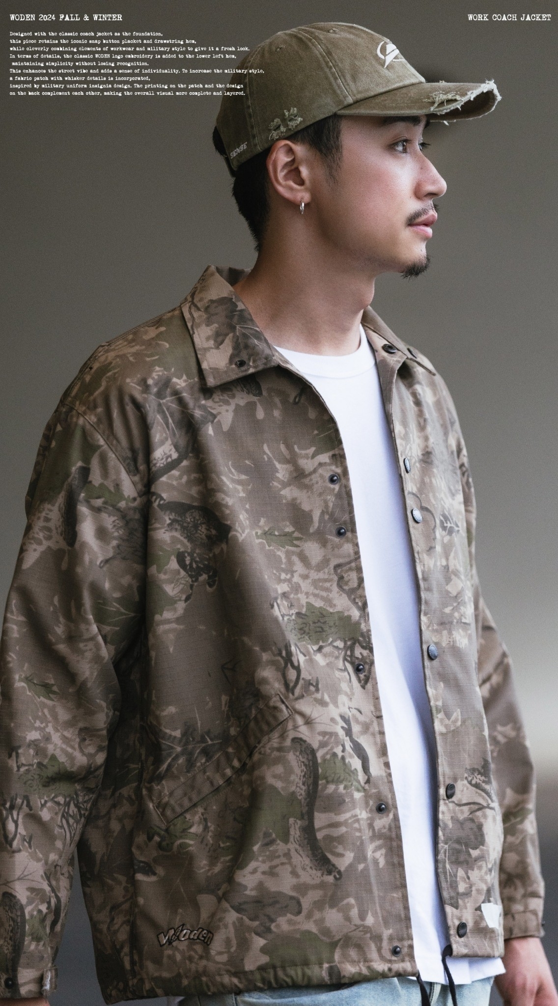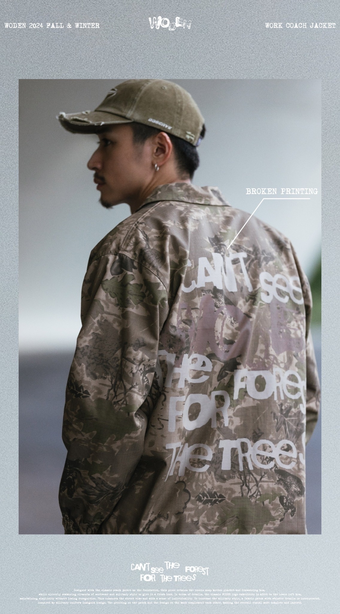 設計以經典教練外套為基底,保留了標誌性的按扣門襟與下擺抽繩,並巧妙結合工作外套與軍裝元素,賦予其全新風貌。細節部分,左下擺加入 WODEN 經典 LOGO 刺繡,簡約而不失辨識度。增添街頭感與個性張力。為了增加軍裝風格,參考軍服臂章設計,加入帶有抽鬚細節的布塊,布塊上的印刷與背面設計相互呼應,使整體視覺更加完整且層次豐富。