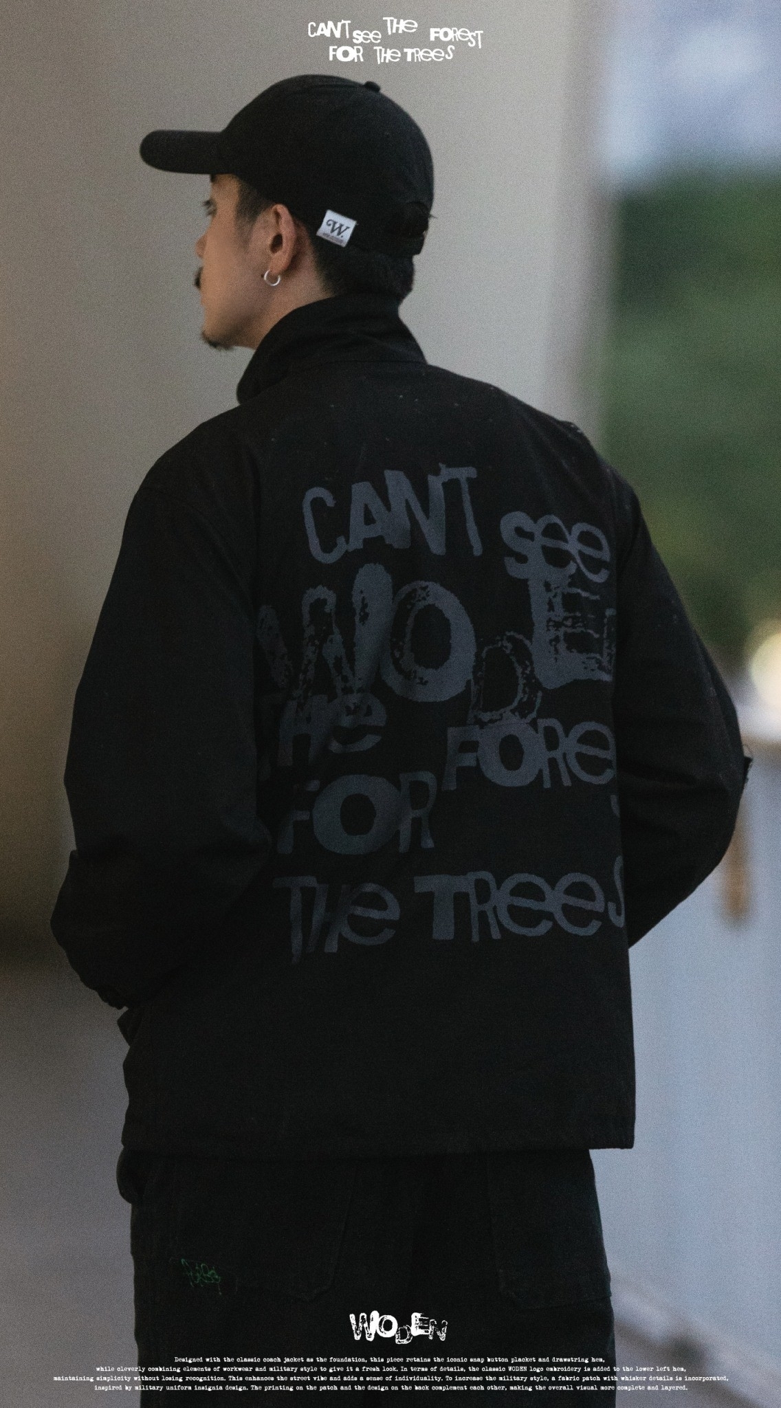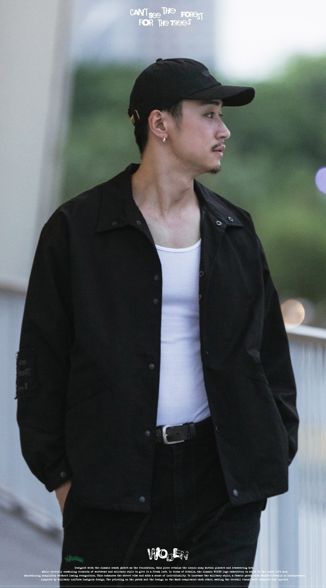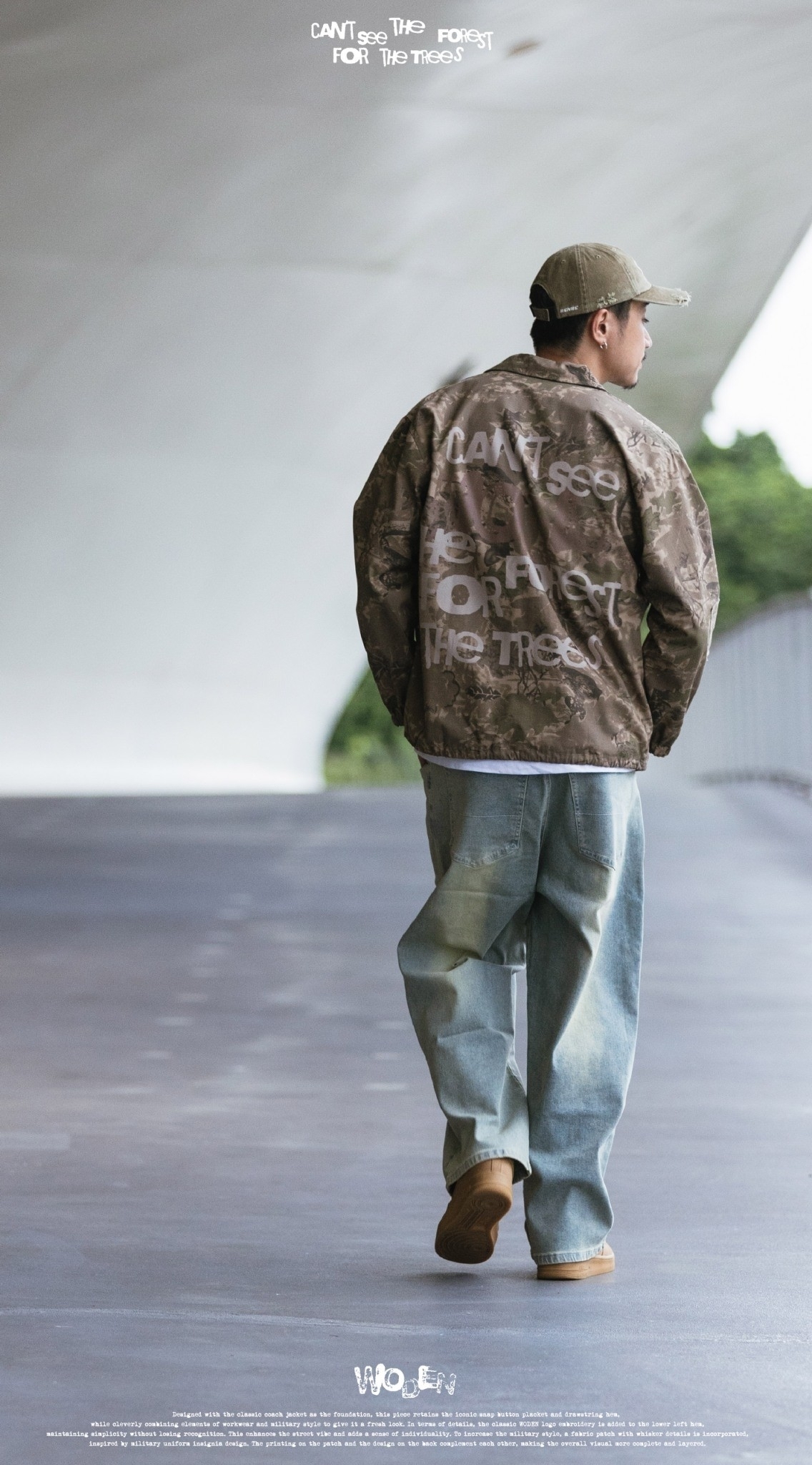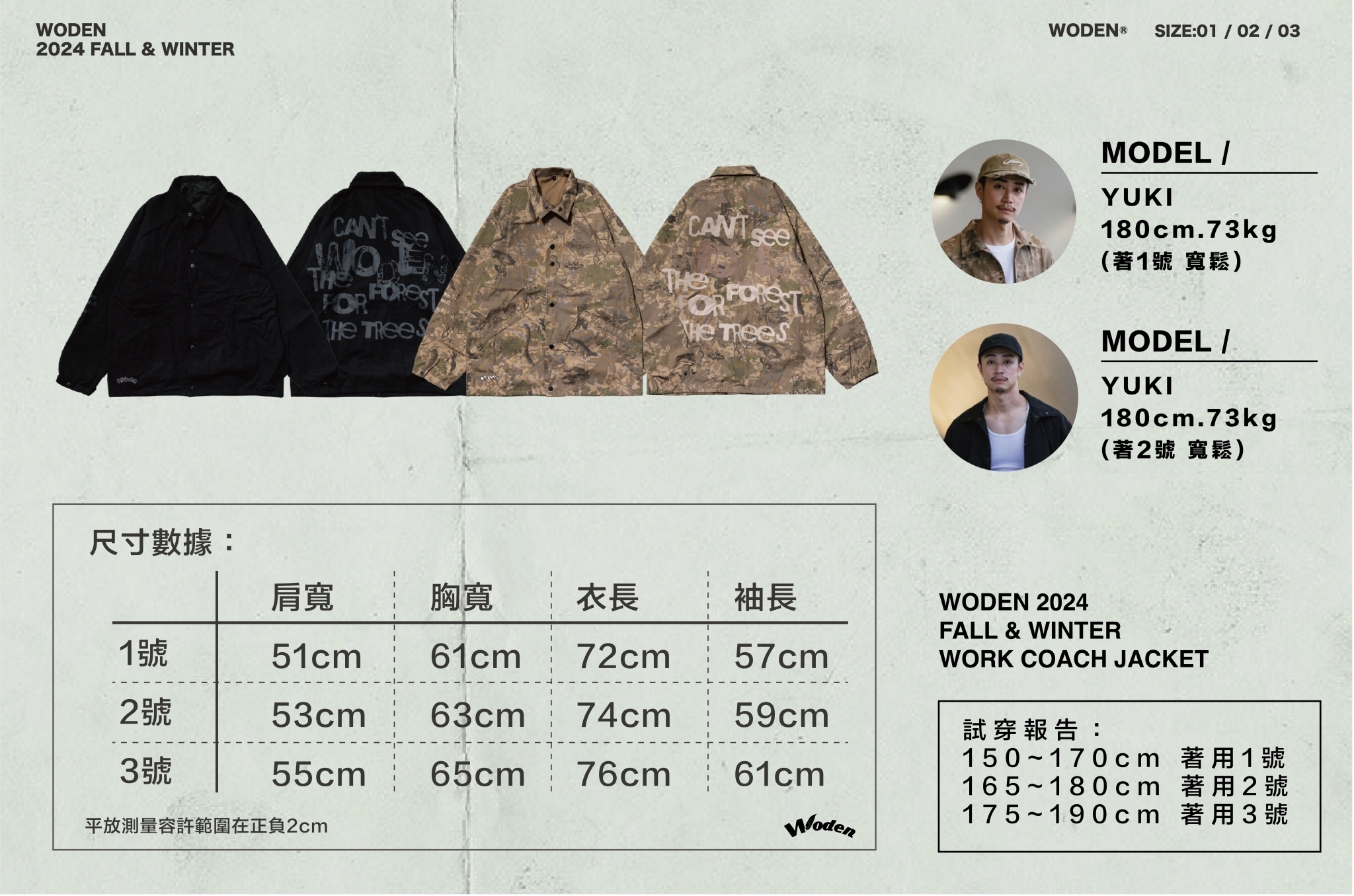 設計以經典教練外套為基底,保留了標誌性的按扣門襟與下擺抽繩,並巧妙結合工作外套與軍裝元素,賦予其全新風貌。細節部分,左下擺加入 WODEN 經典 LOGO 刺繡,簡約而不失辨識度。增添街頭感與個性張力。為了增加軍裝風格,參考軍服臂章設計,加入帶有抽鬚細節的布塊,布塊上的印刷與背面設計相互呼應,使整體視覺更加完整且層次豐富。