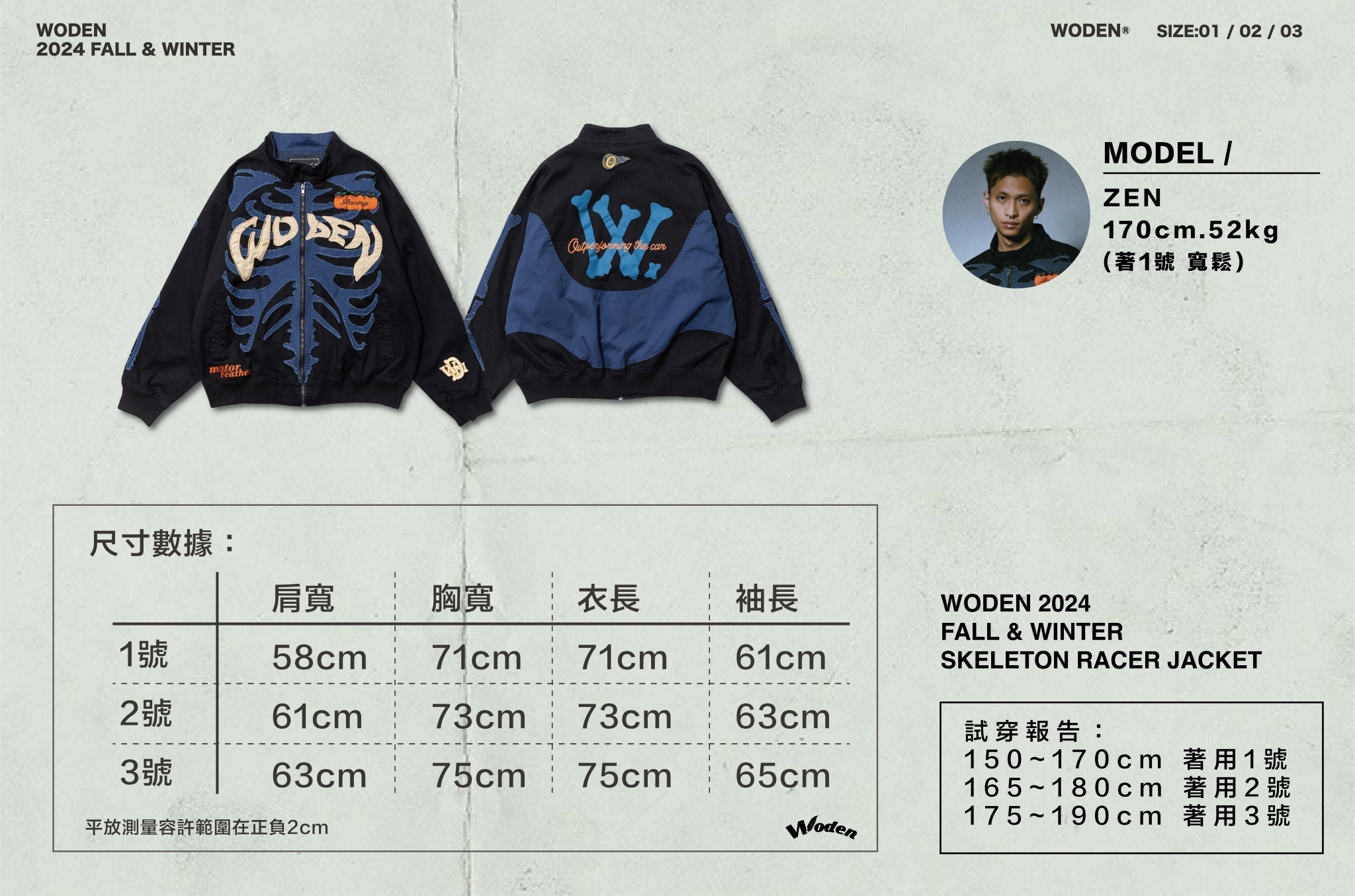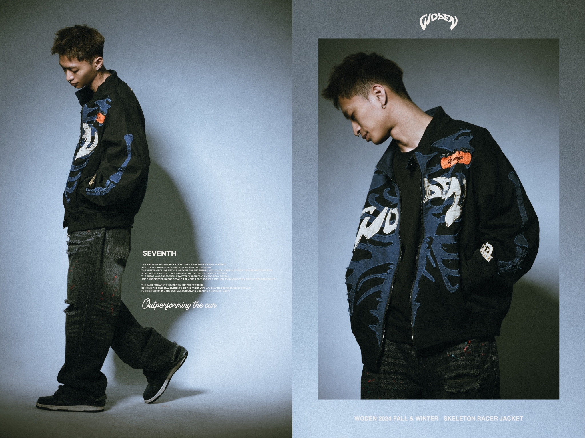 本季賽車外套注入全新骷髏元素,於正面大膽融入骨架設計,袖部則加入骨頭排列細節,並採用雷射割型貼布工藝,呈現層次分明的立體效果。細節部分,胸前搭配扭曲的 WODEN 字體電繡設計,並於胸口與下擺加入電繡徽章細節,賦予外套更高的辨識度。