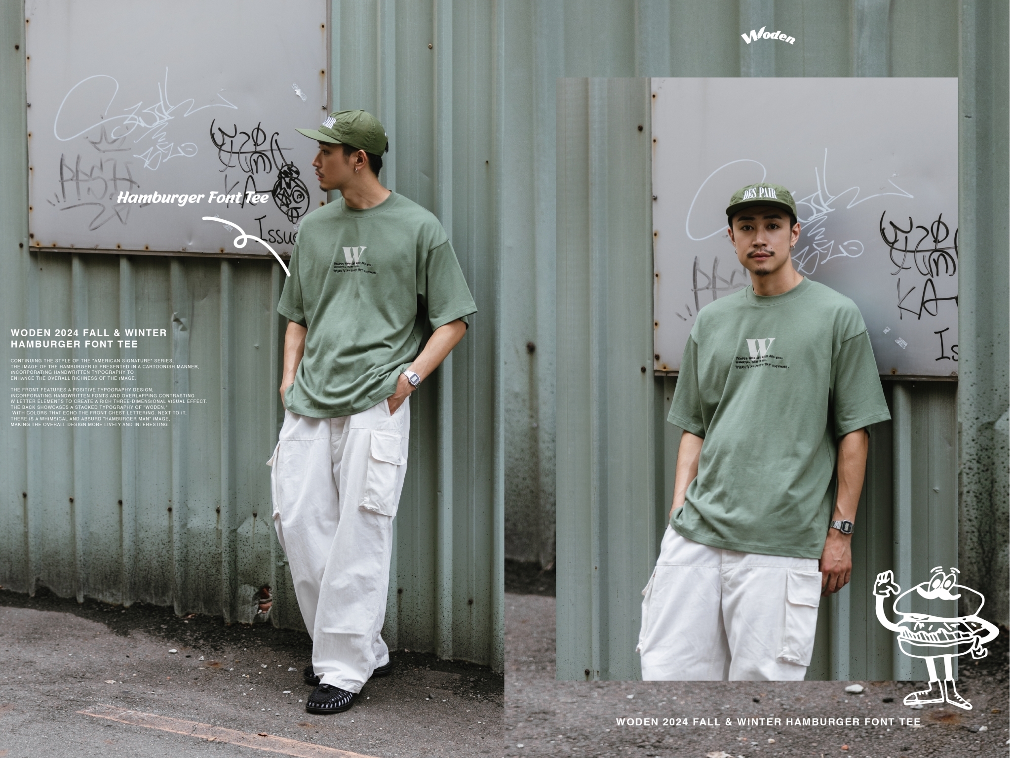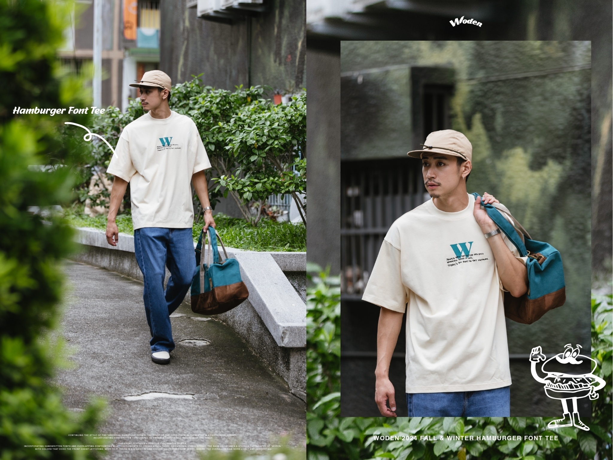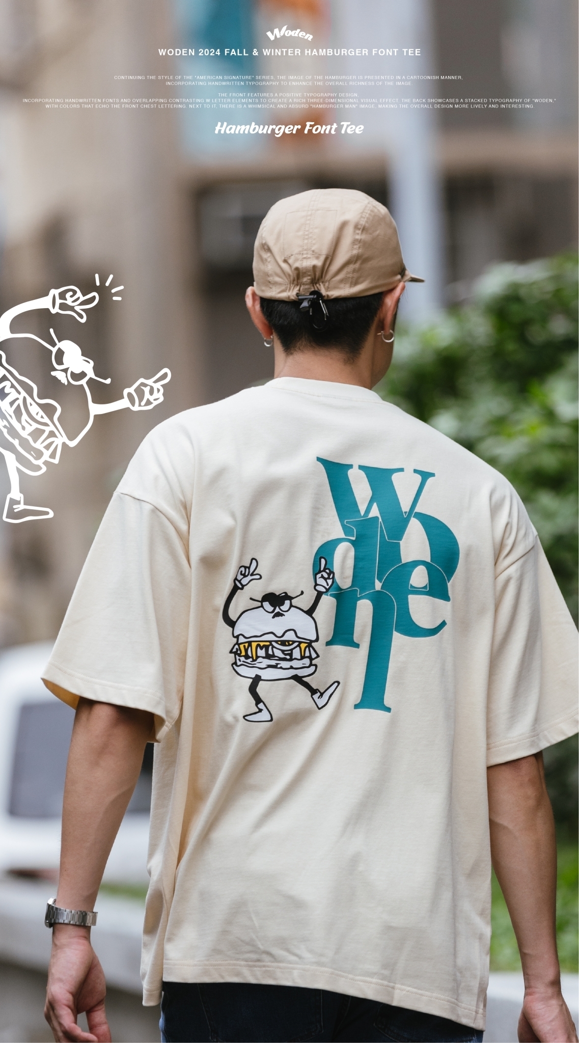 正面採用字體排版設計,胸前加入手寫字體並疊加撞色的W字元素,營造出豐富的立體視覺效果。背面則以WODEN堆疊字體排版呈現,配色與正面胸口字體互相呼應,旁邊則搭配風趣又無厘頭的『漢堡人』圖像,讓整體更加生動有趣。