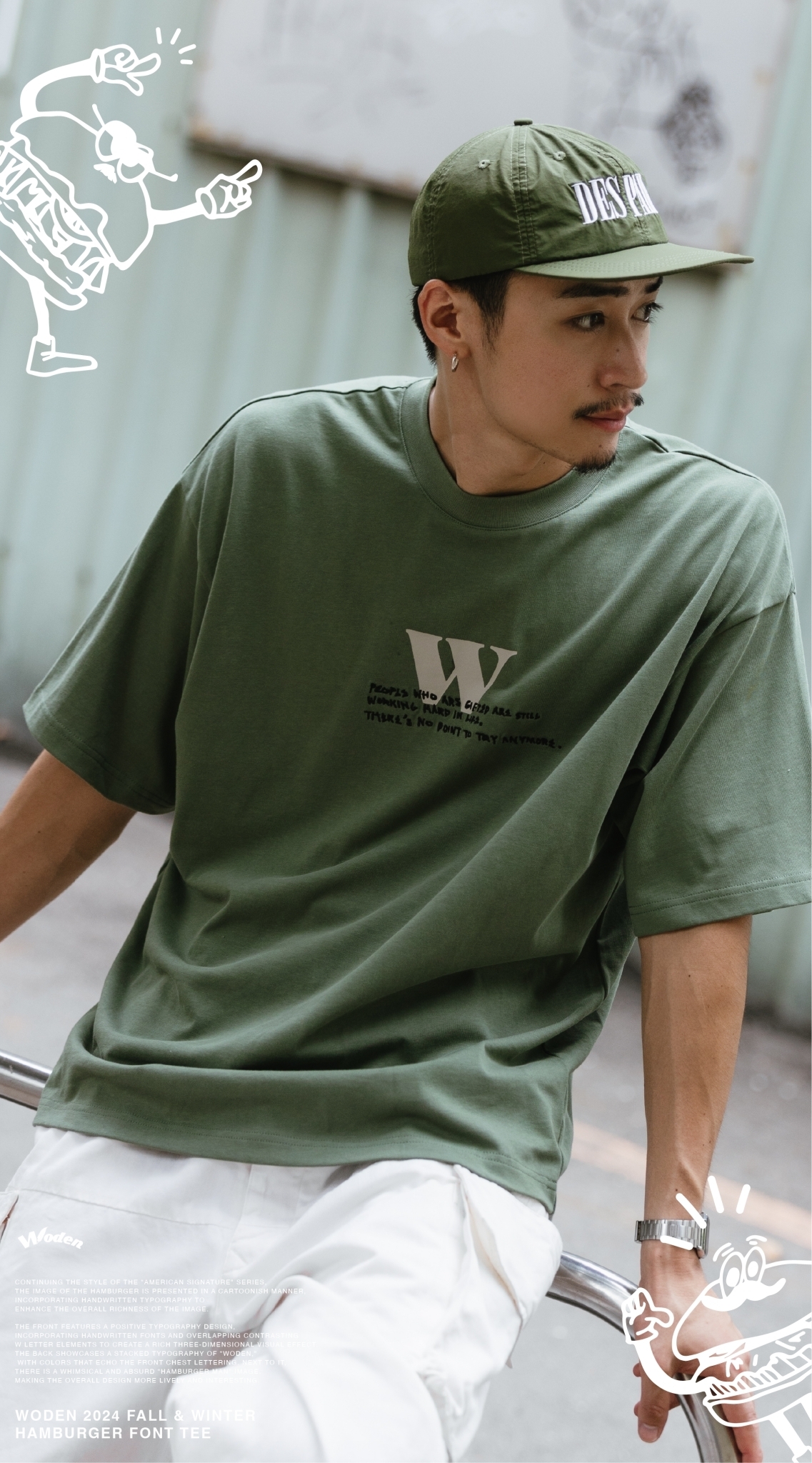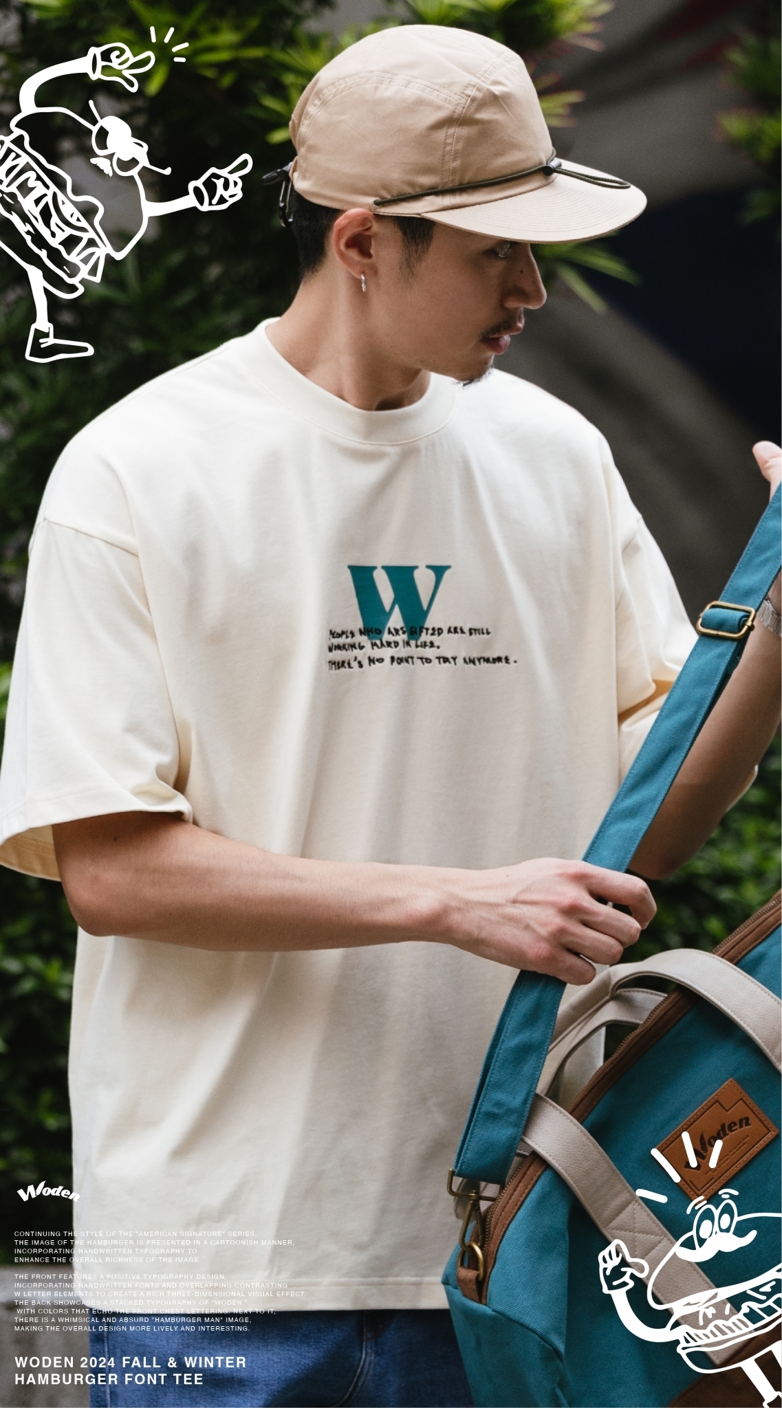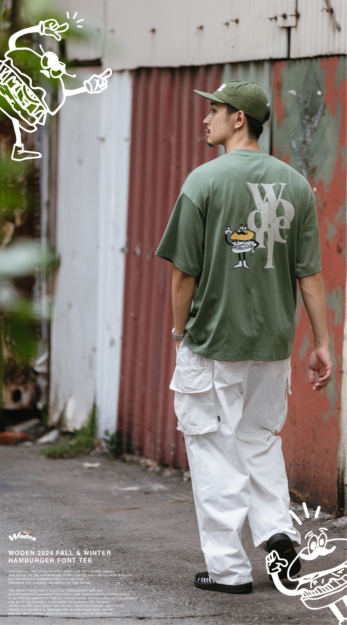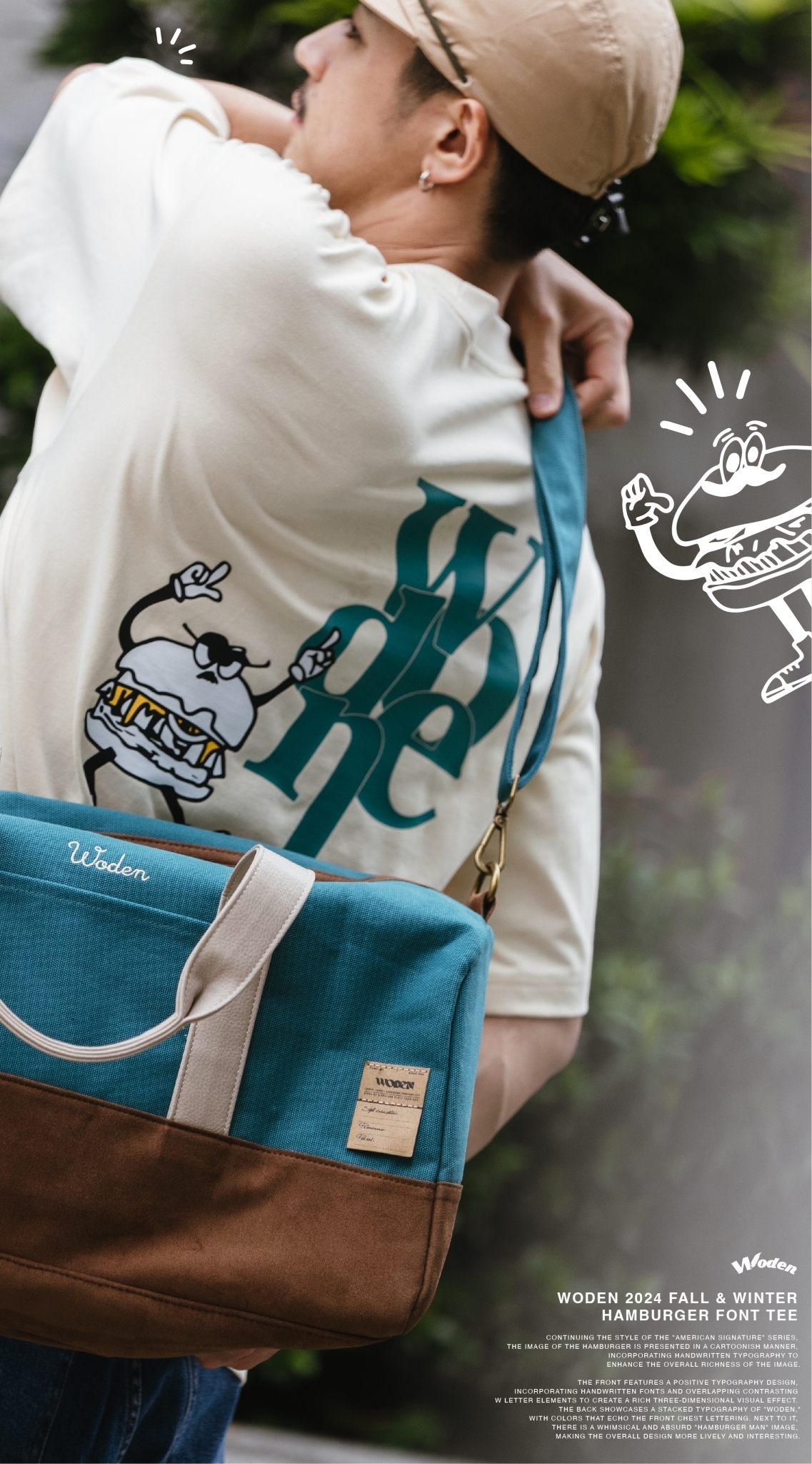 正面採用字體排版設計,胸前加入手寫字體並疊加撞色的W字元素,營造出豐富的立體視覺效果。背面則以WODEN堆疊字體排版呈現,配色與正面胸口字體互相呼應,旁邊則搭配風趣又無厘頭的『漢堡人』圖像,讓整體更加生動有趣。