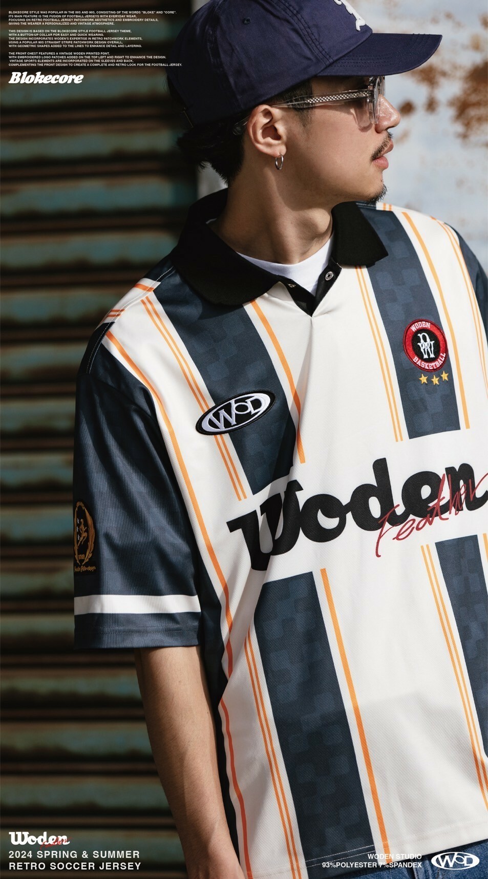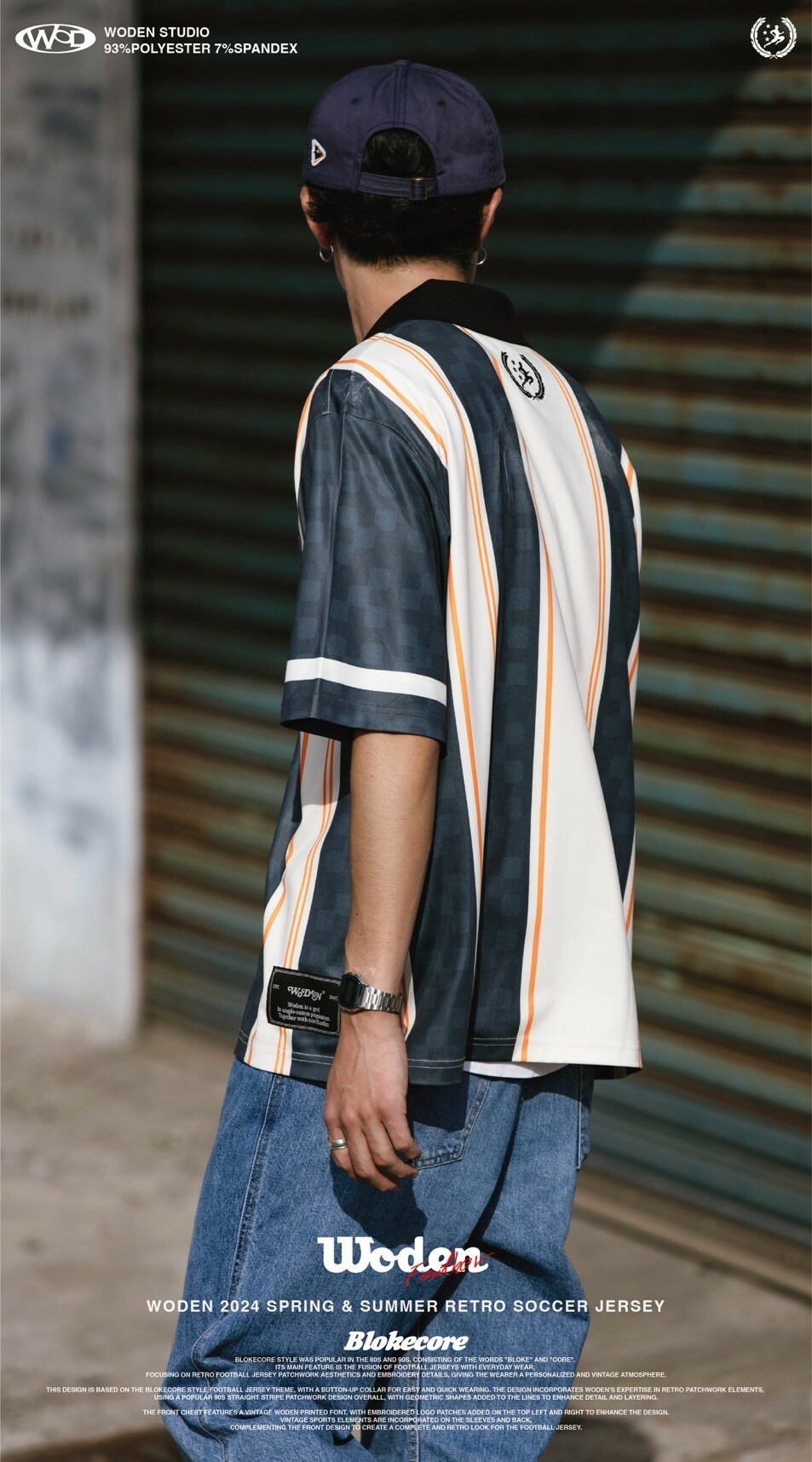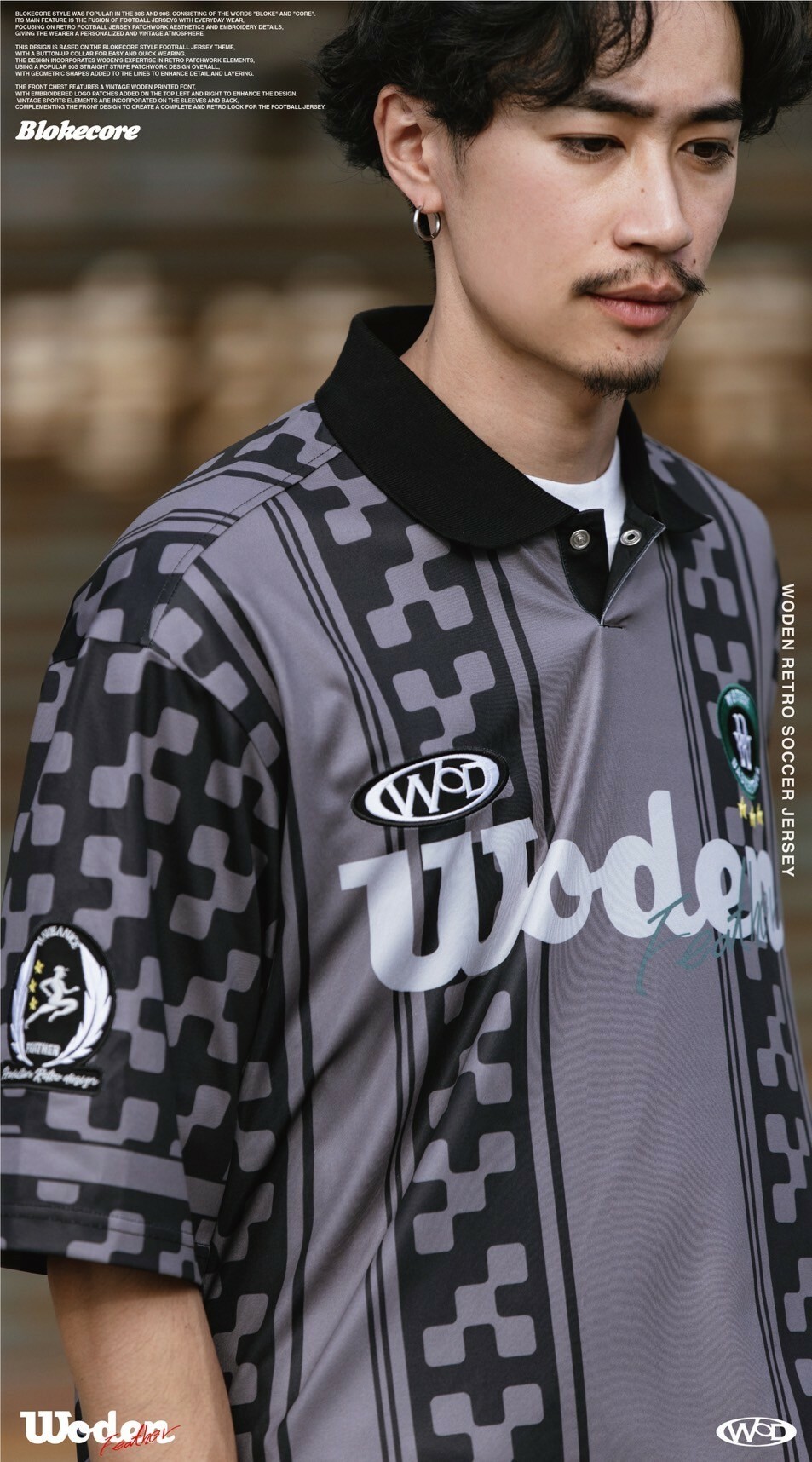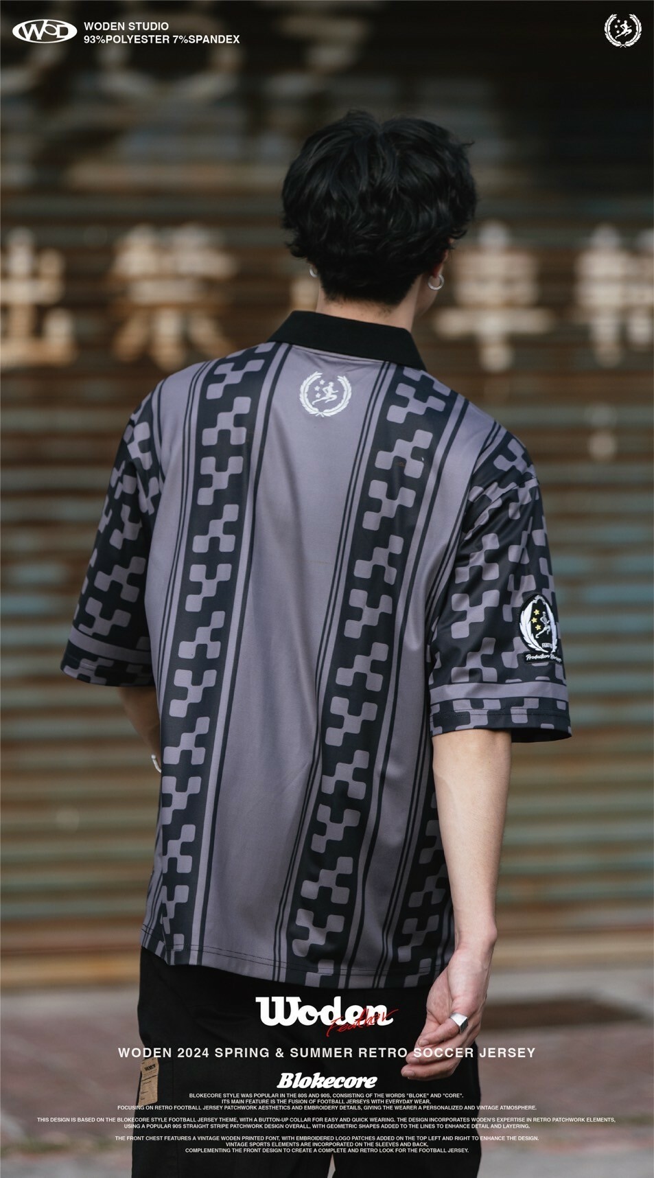 本次設計以Blokecore風格足球衫為主題,足球衫領子開襟採用單扣設計,穿脫更加方便快捷。設計部分融合WODEN擅長的復古拼接元素,整體採用了90年代流行的直條紋拼接設計,線條內加入幾何圖形以增添細節層次感。
