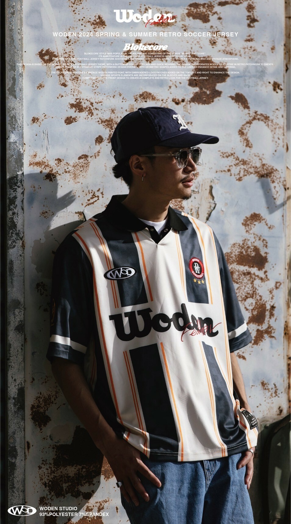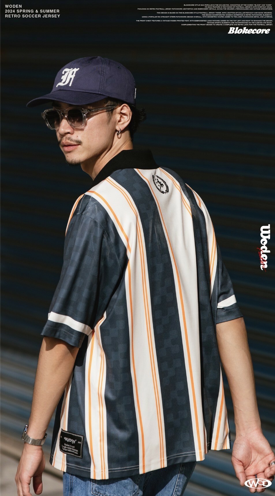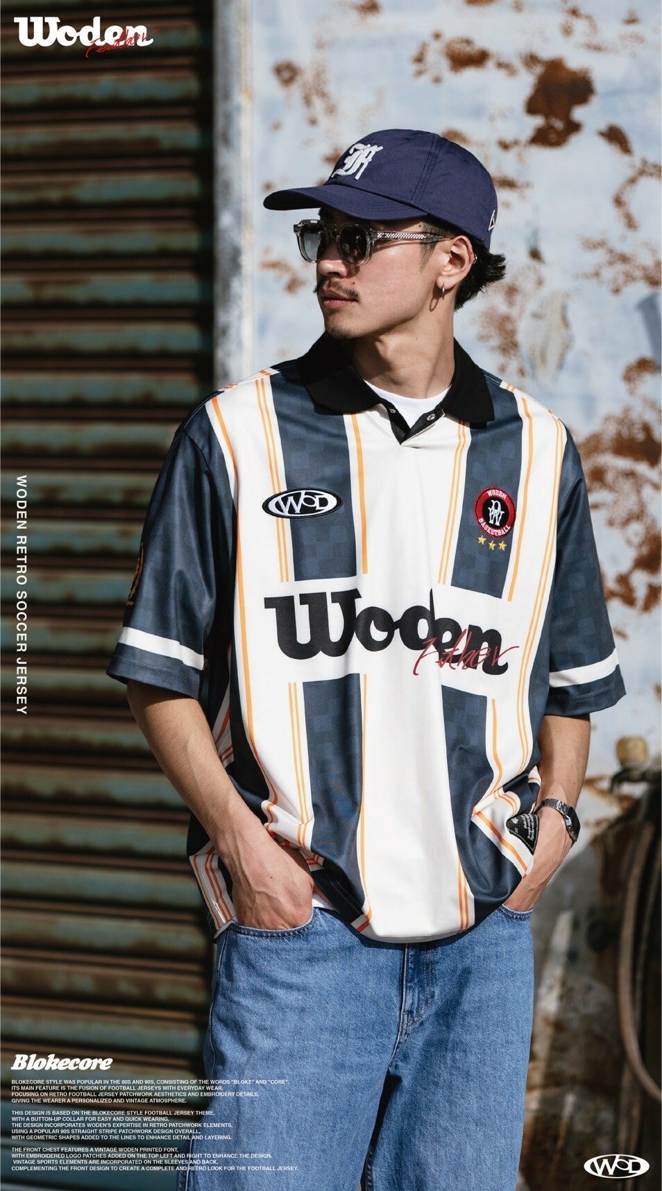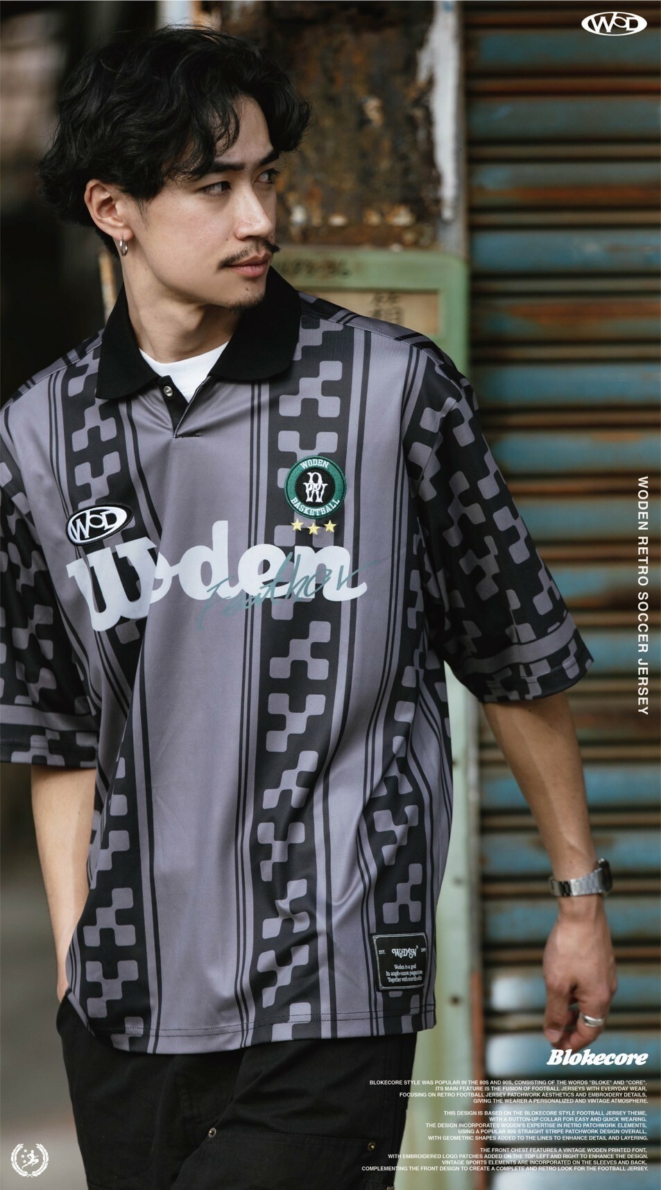 本次設計以Blokecore風格足球衫為主題,足球衫領子開襟採用單扣設計,穿脫更加方便快捷。設計部分融合WODEN擅長的復古拼接元素,整體採用了90年代流行的直條紋拼接設計,線條內加入幾何圖形以增添細節層次感。