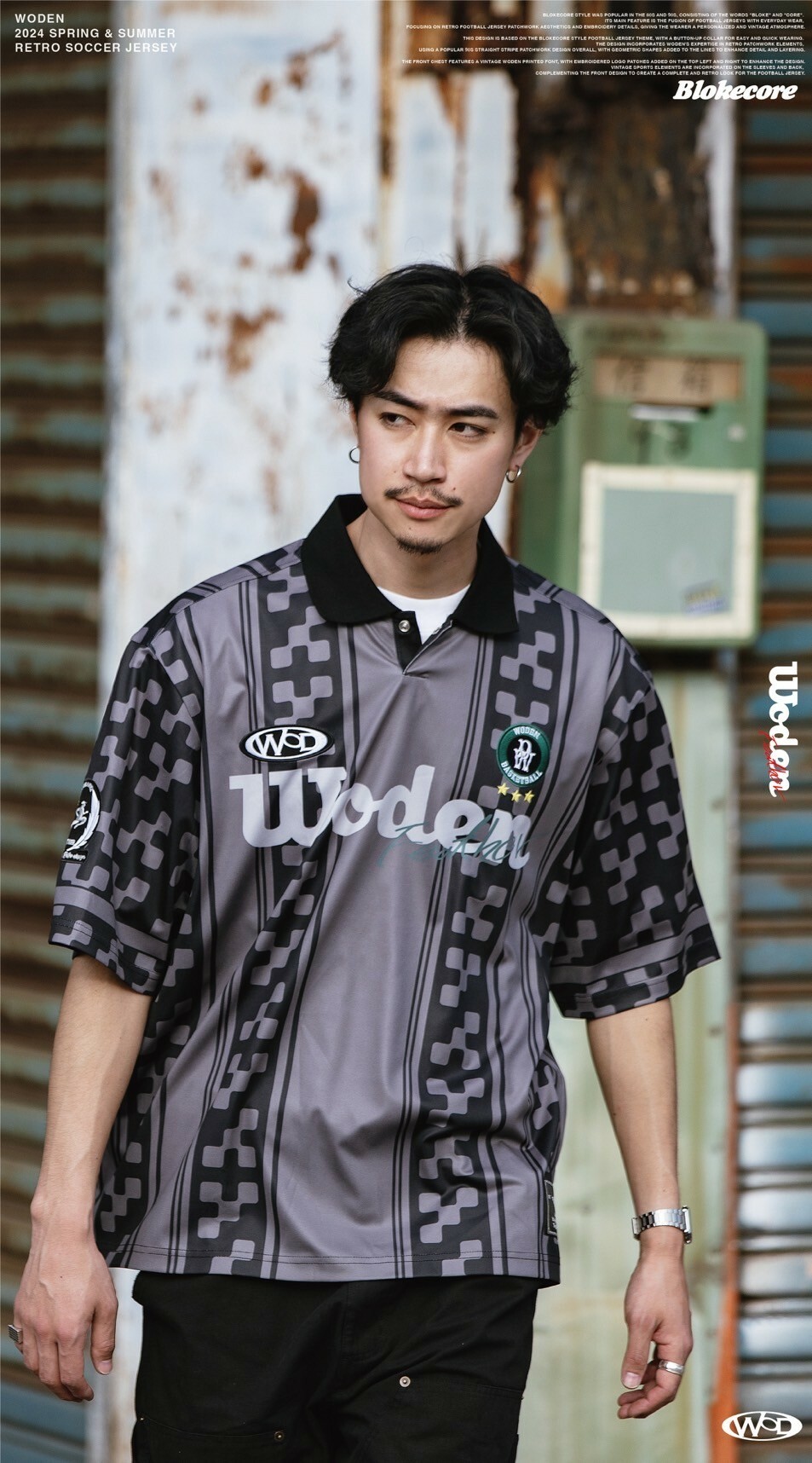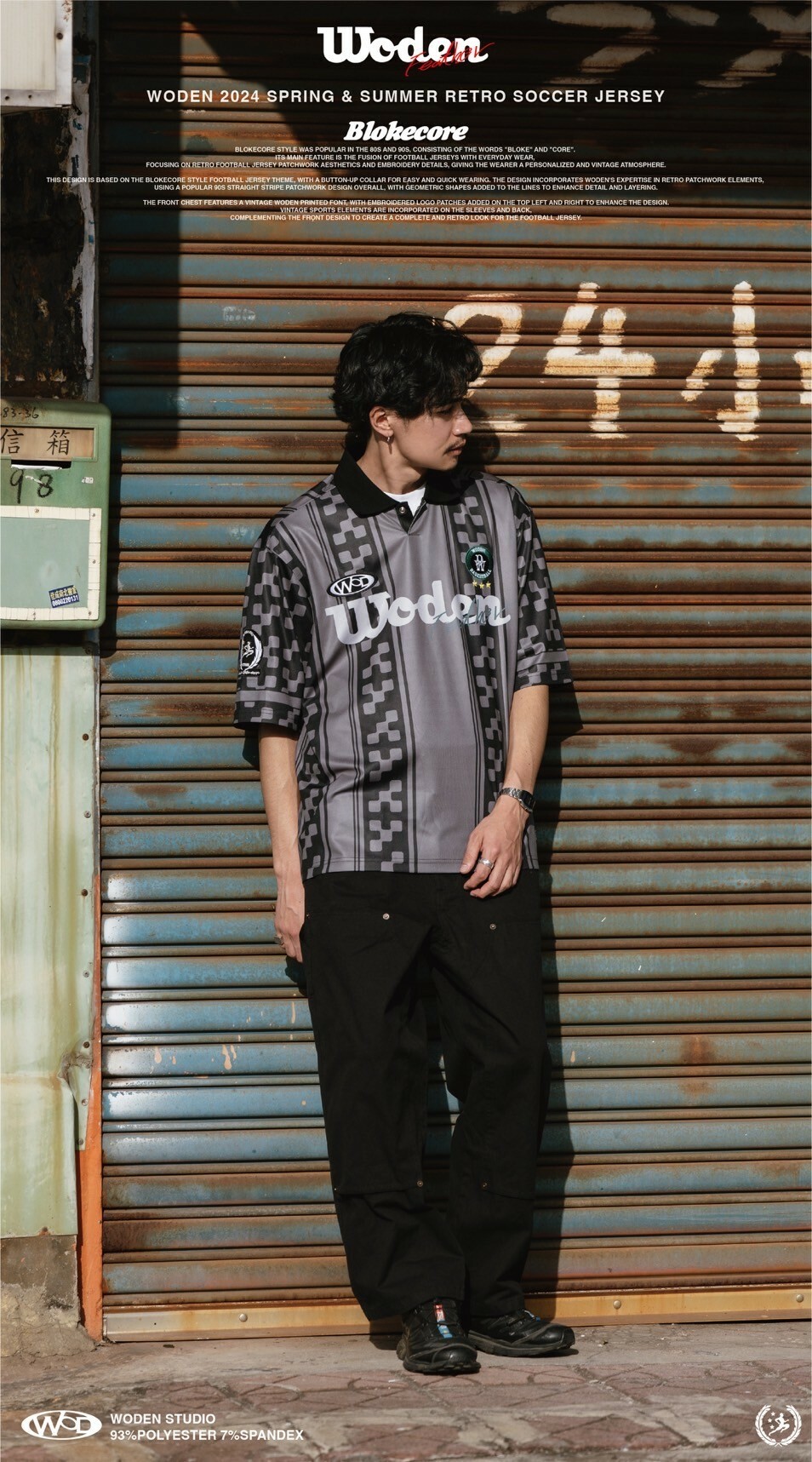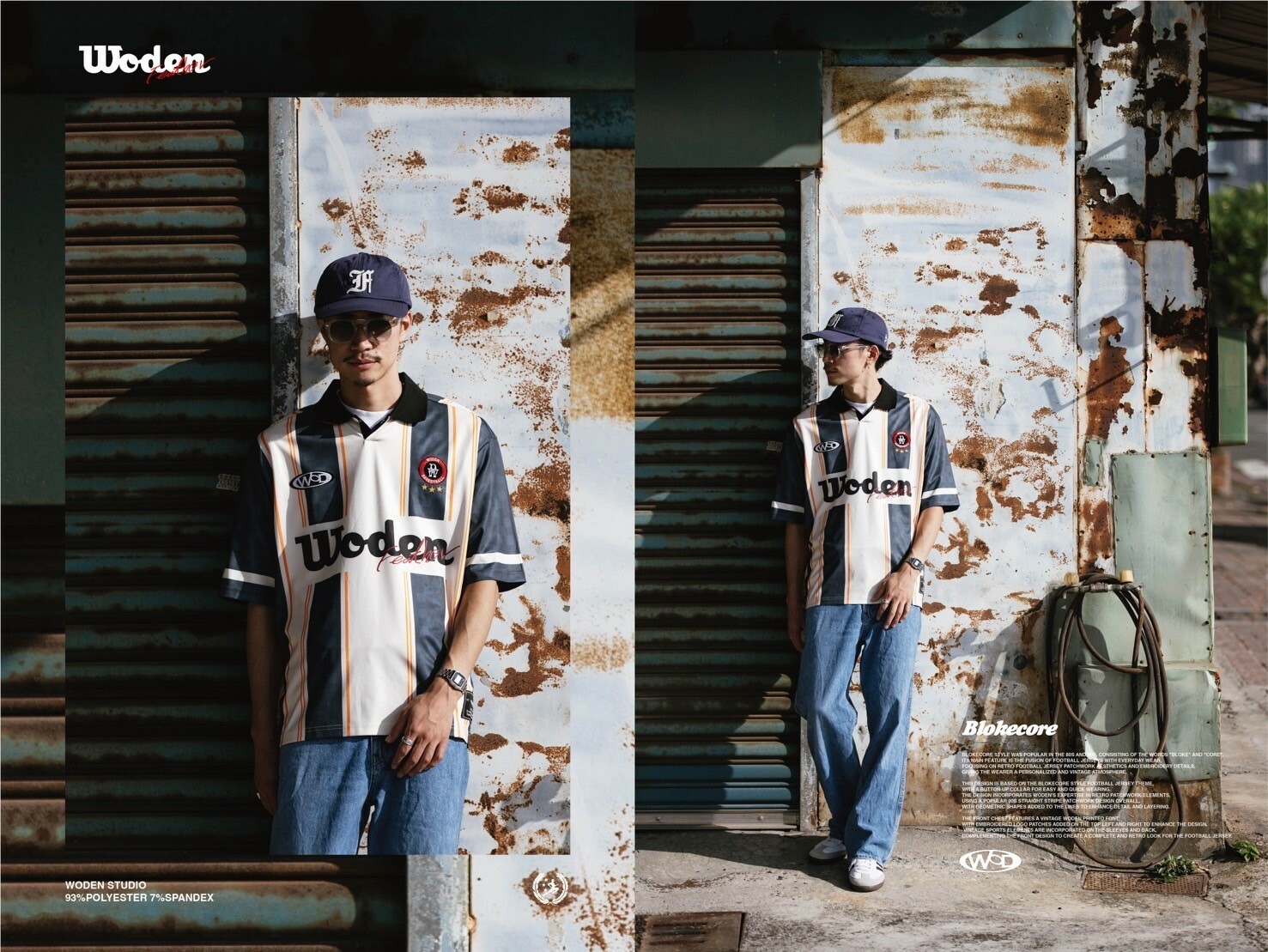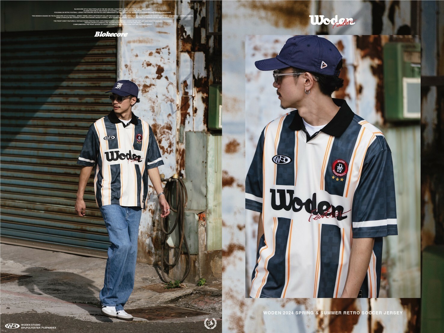 本次設計以Blokecore風格足球衫為主題,足球衫領子開襟採用單扣設計,穿脫更加方便快捷。設計部分融合WODEN擅長的復古拼接元素,整體採用了90年代流行的直條紋拼接設計,線條內加入幾何圖形以增添細節層次感。