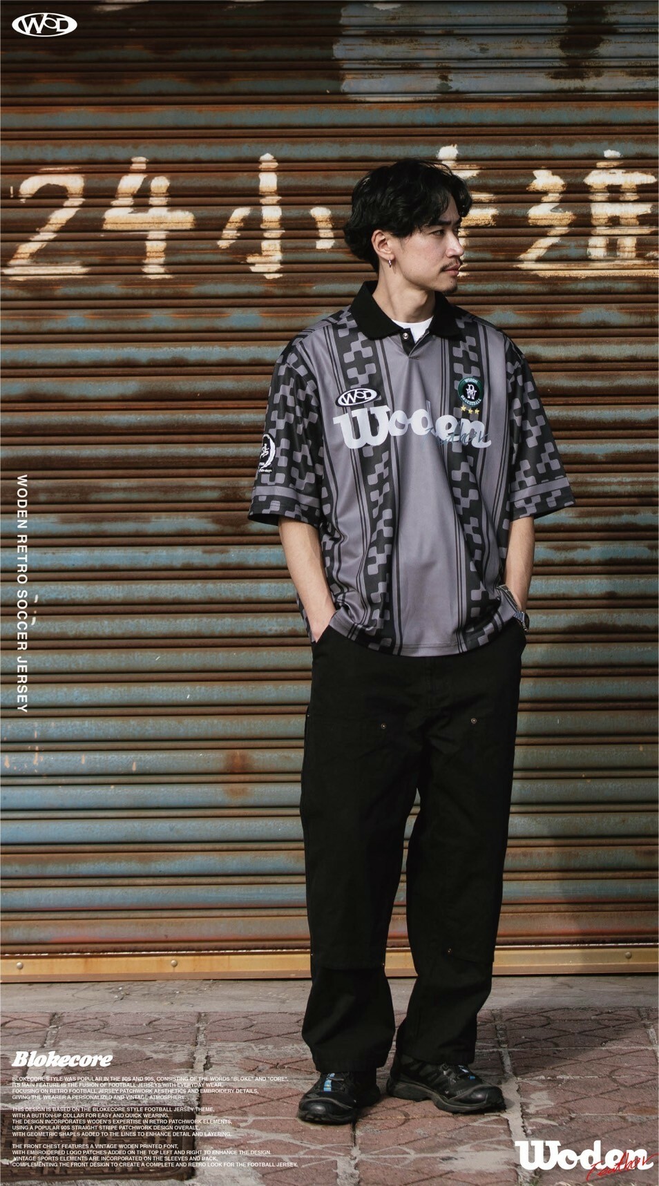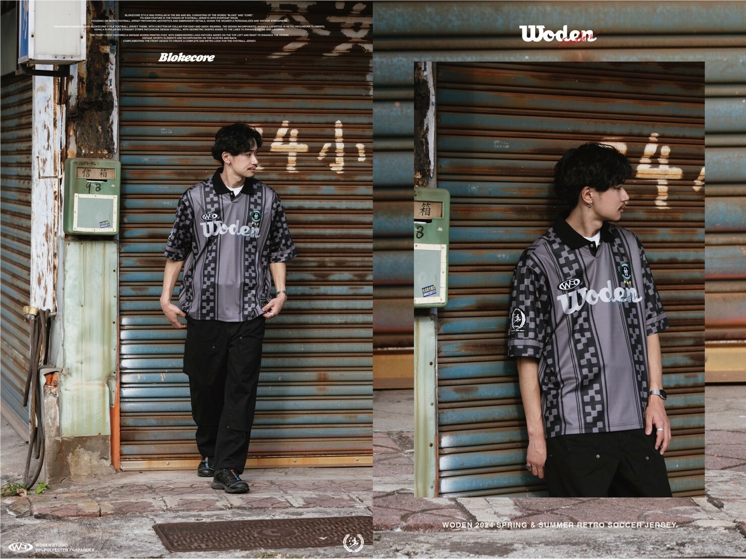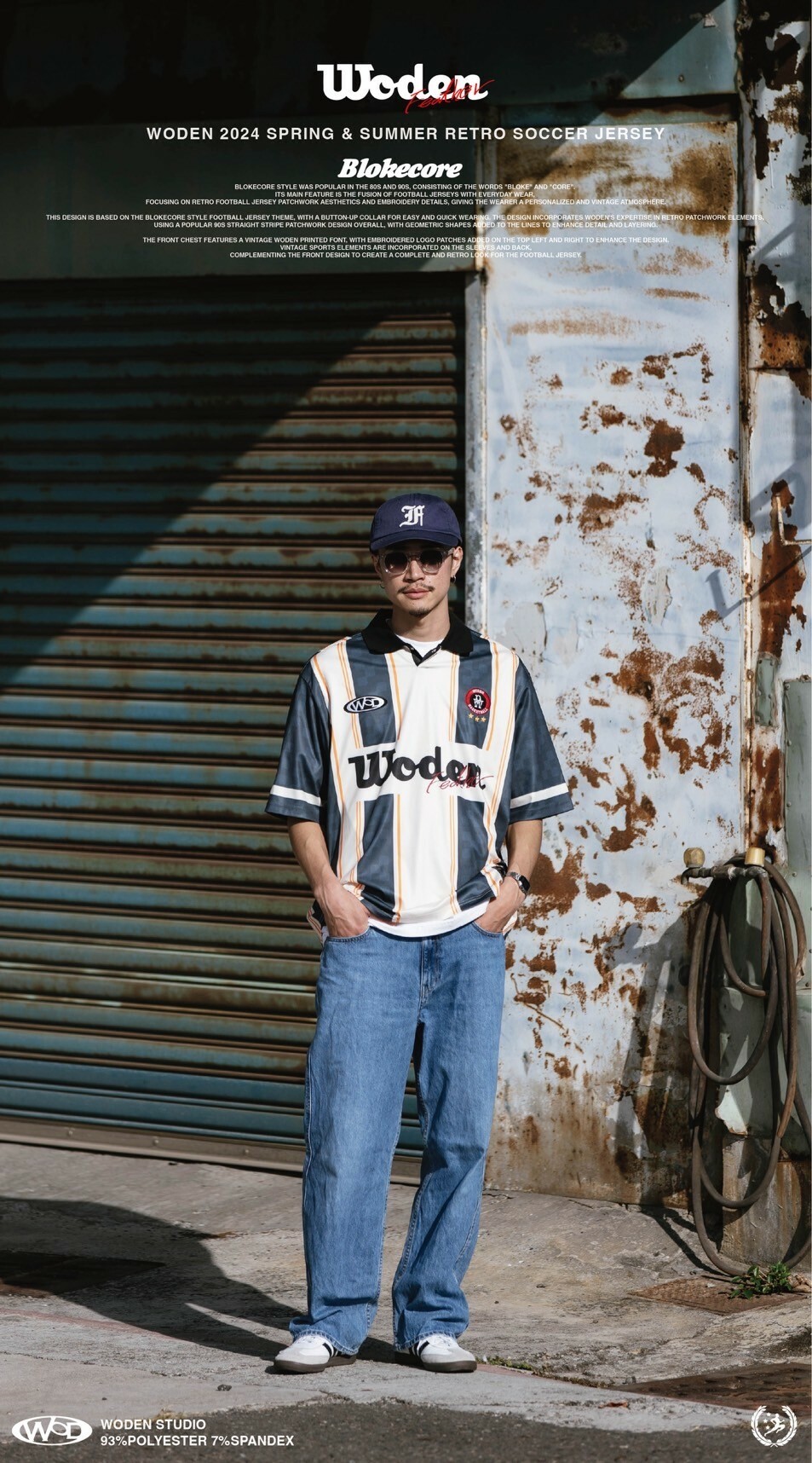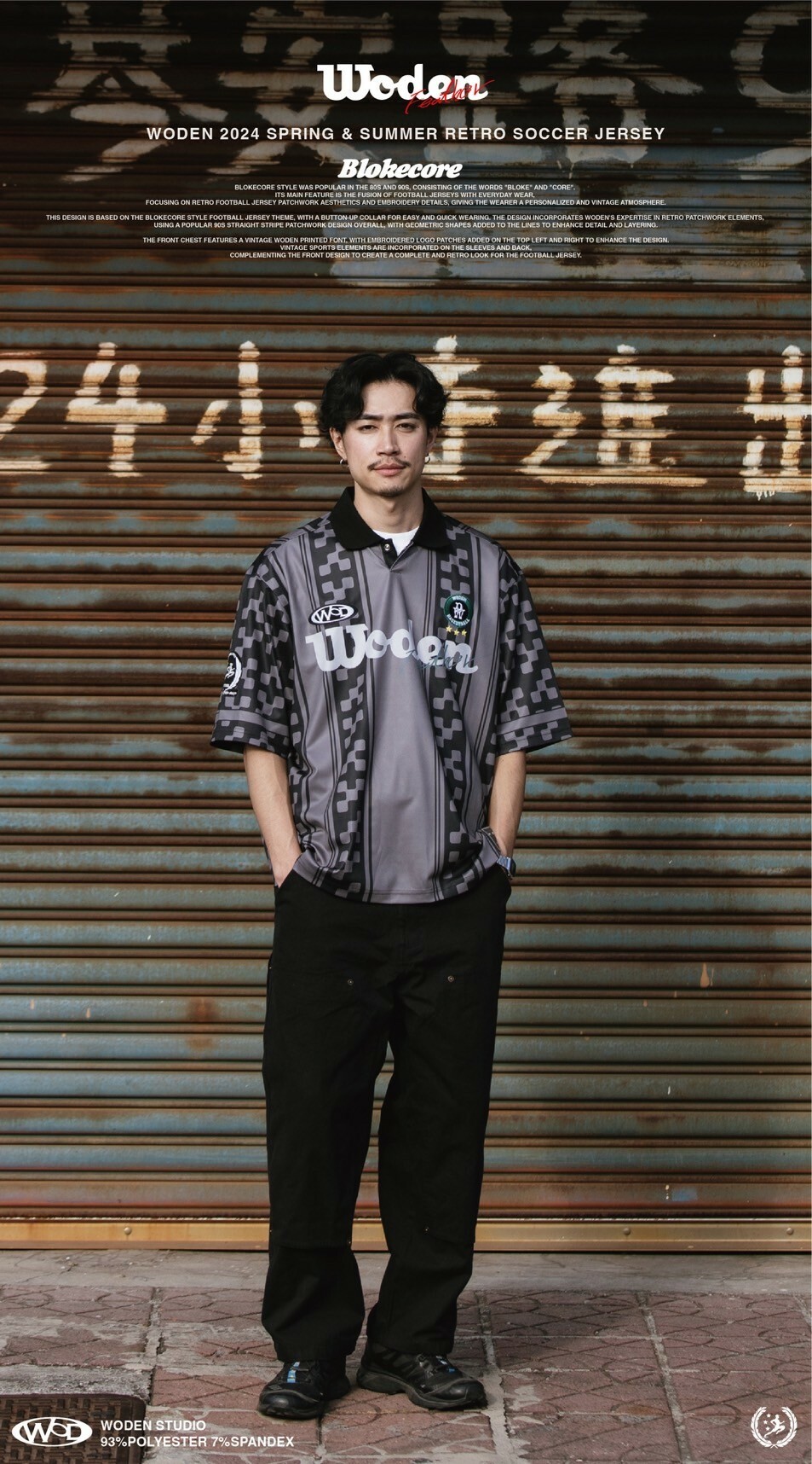 本次設計以Blokecore風格足球衫為主題,足球衫領子開襟採用單扣設計,穿脫更加方便快捷。設計部分融合WODEN擅長的復古拼接元素,整體採用了90年代流行的直條紋拼接設計,線條內加入幾何圖形以增添細節層次感。