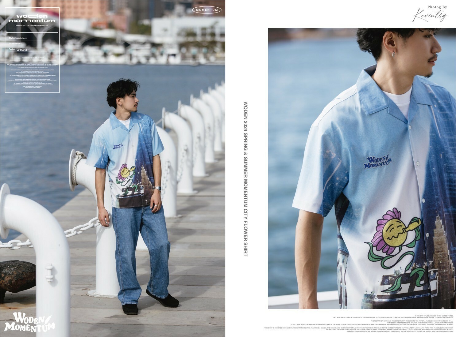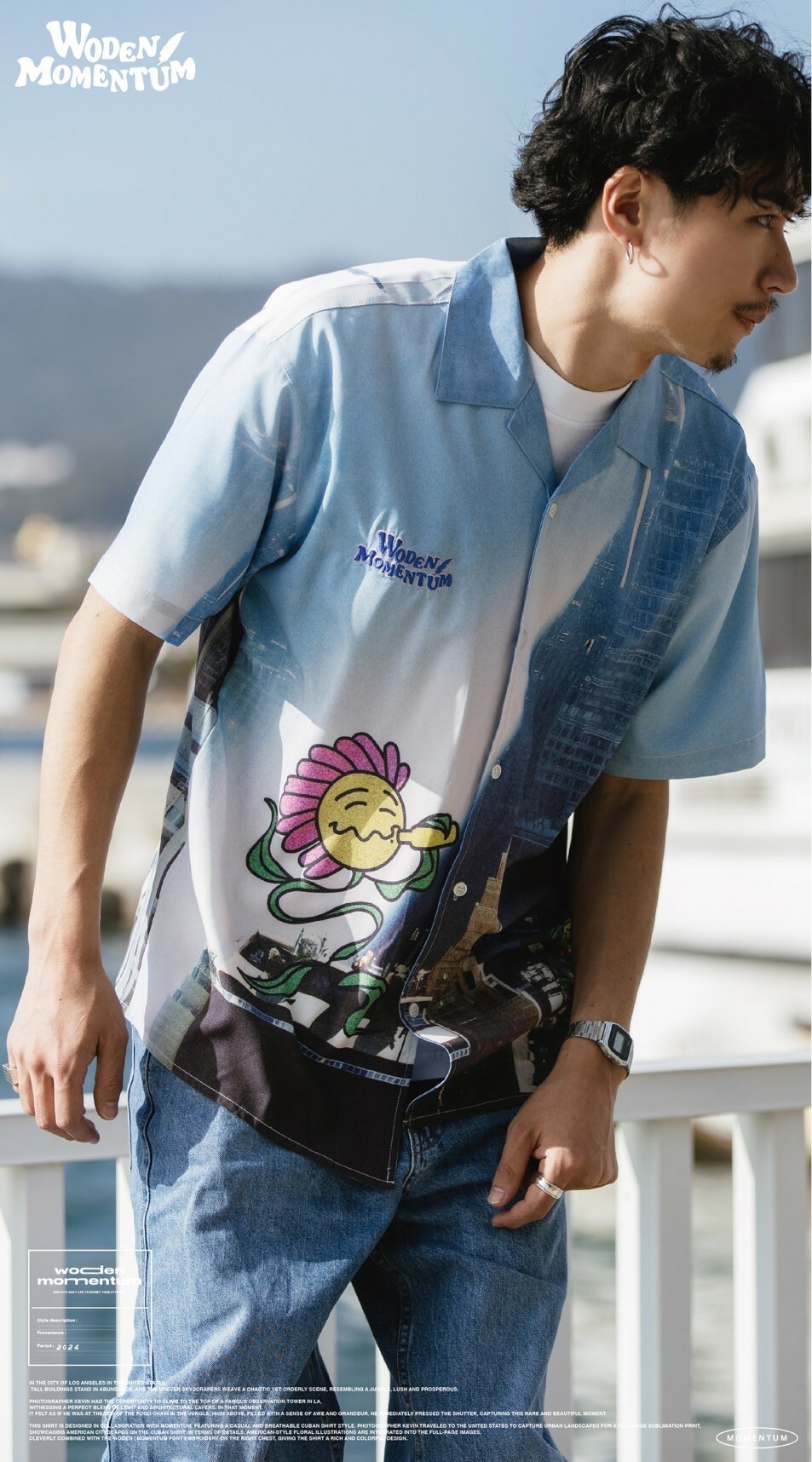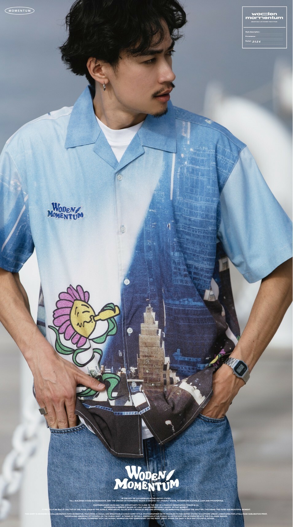 將美國城市風光呈現在古巴襯衫上。細節部分,將美式花朵插畫融合在滿版圖片中,與右胸口WODEN / Momentum字體電繡的巧妙結合,賦予整件襯衫豐富多彩的設計感。