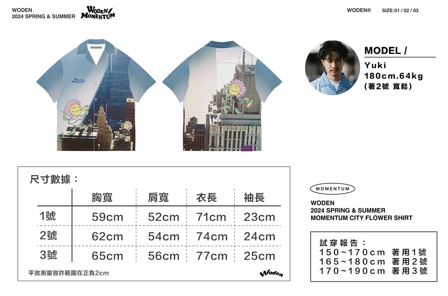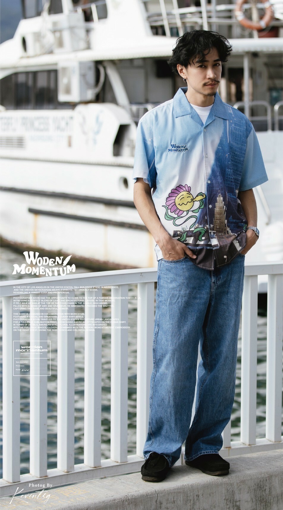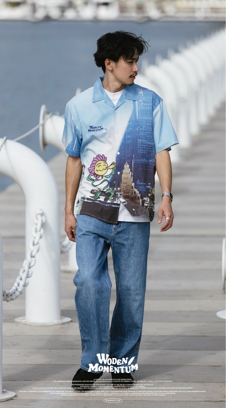 將美國城市風光呈現在古巴襯衫上。細節部分,將美式花朵插畫融合在滿版圖片中,與右胸口WODEN / Momentum字體電繡的巧妙結合,賦予整件襯衫豐富多彩的設計感。