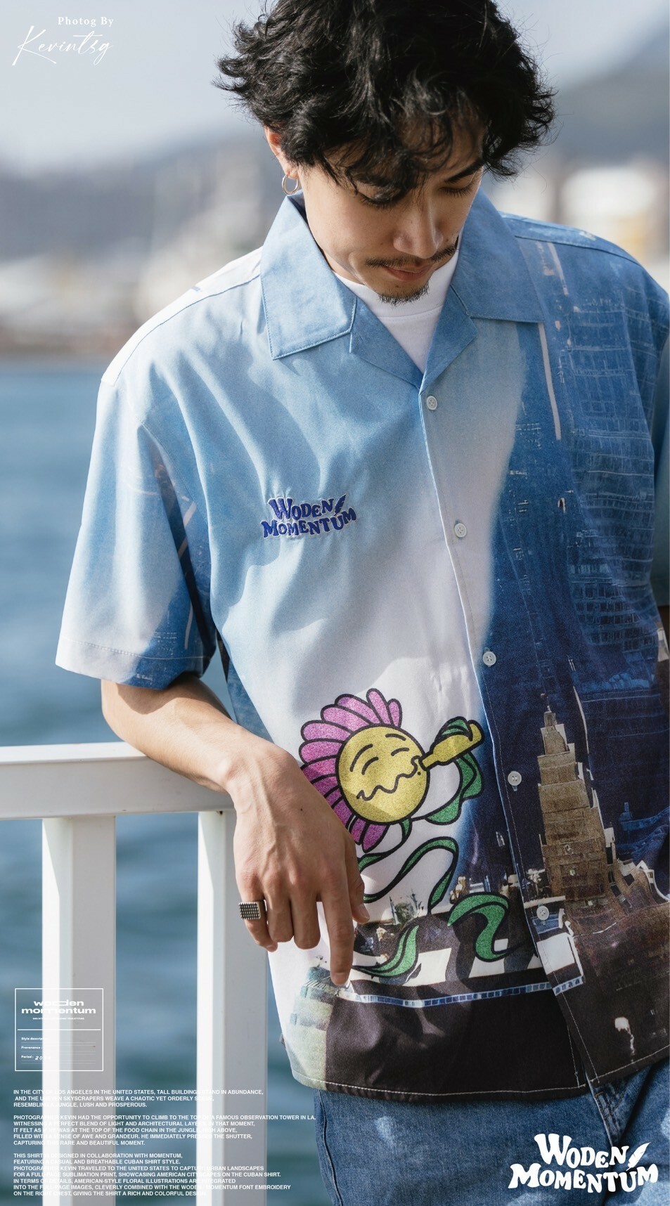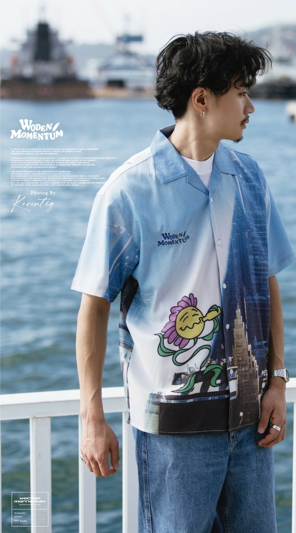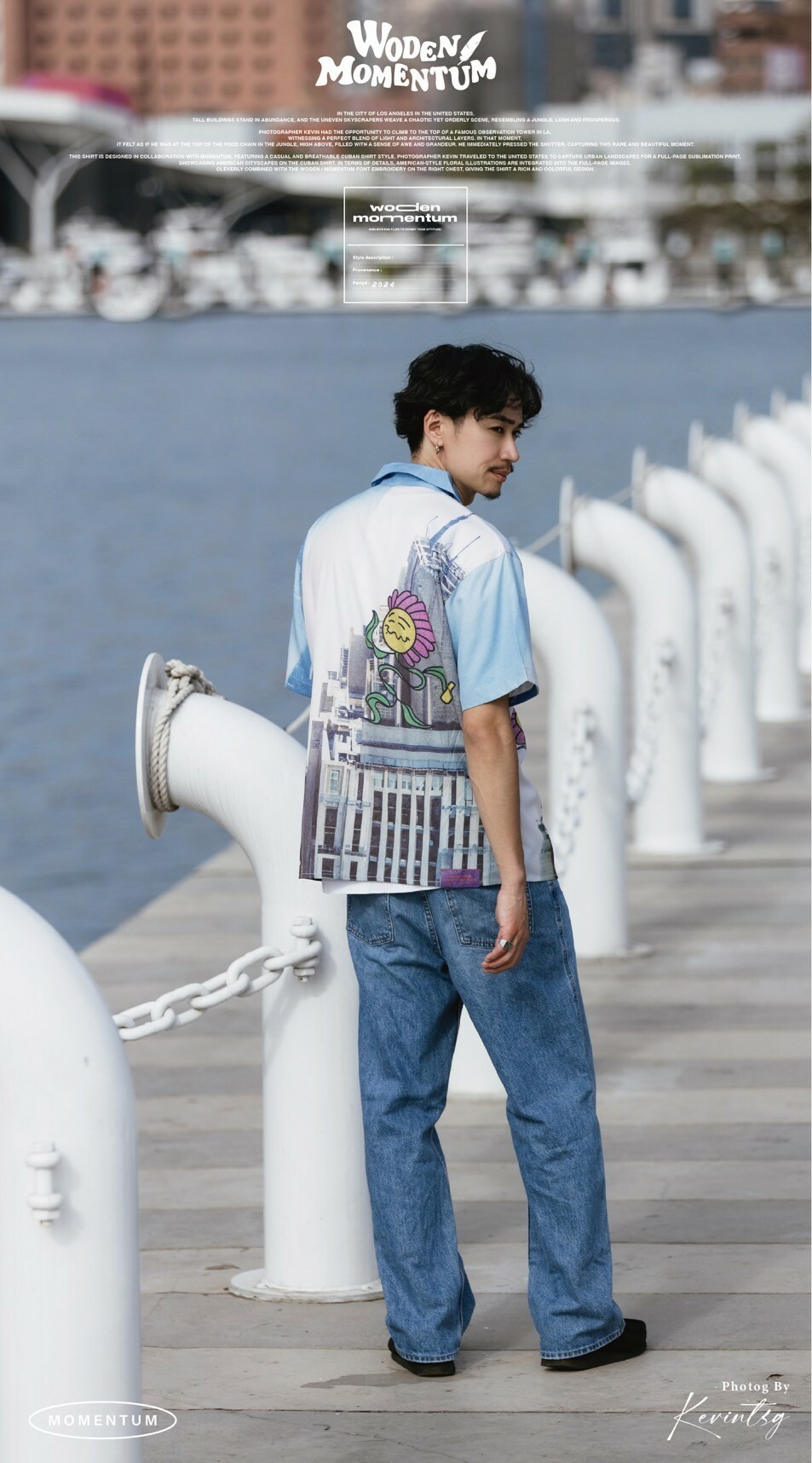本次襯衫與Momentum合作設計,選擇休閒透氣的古巴襯衫版型,並以攝影師Kevin赴美國捕捉城市景致進行滿版昇華印花,