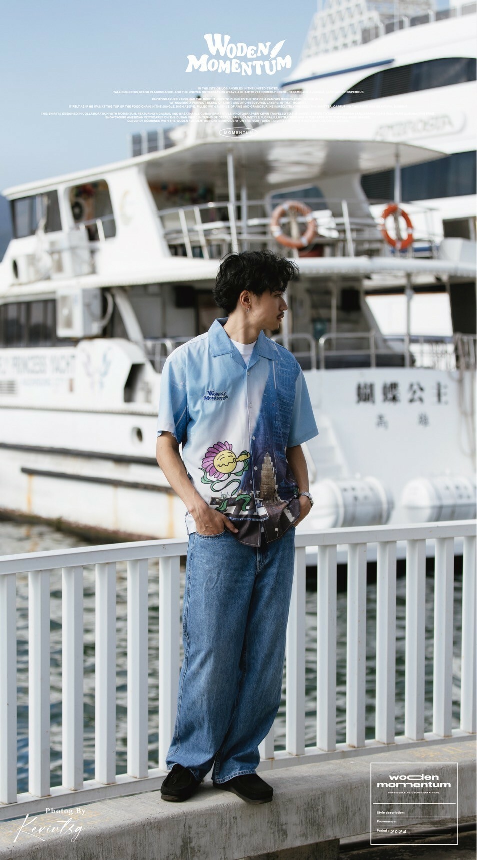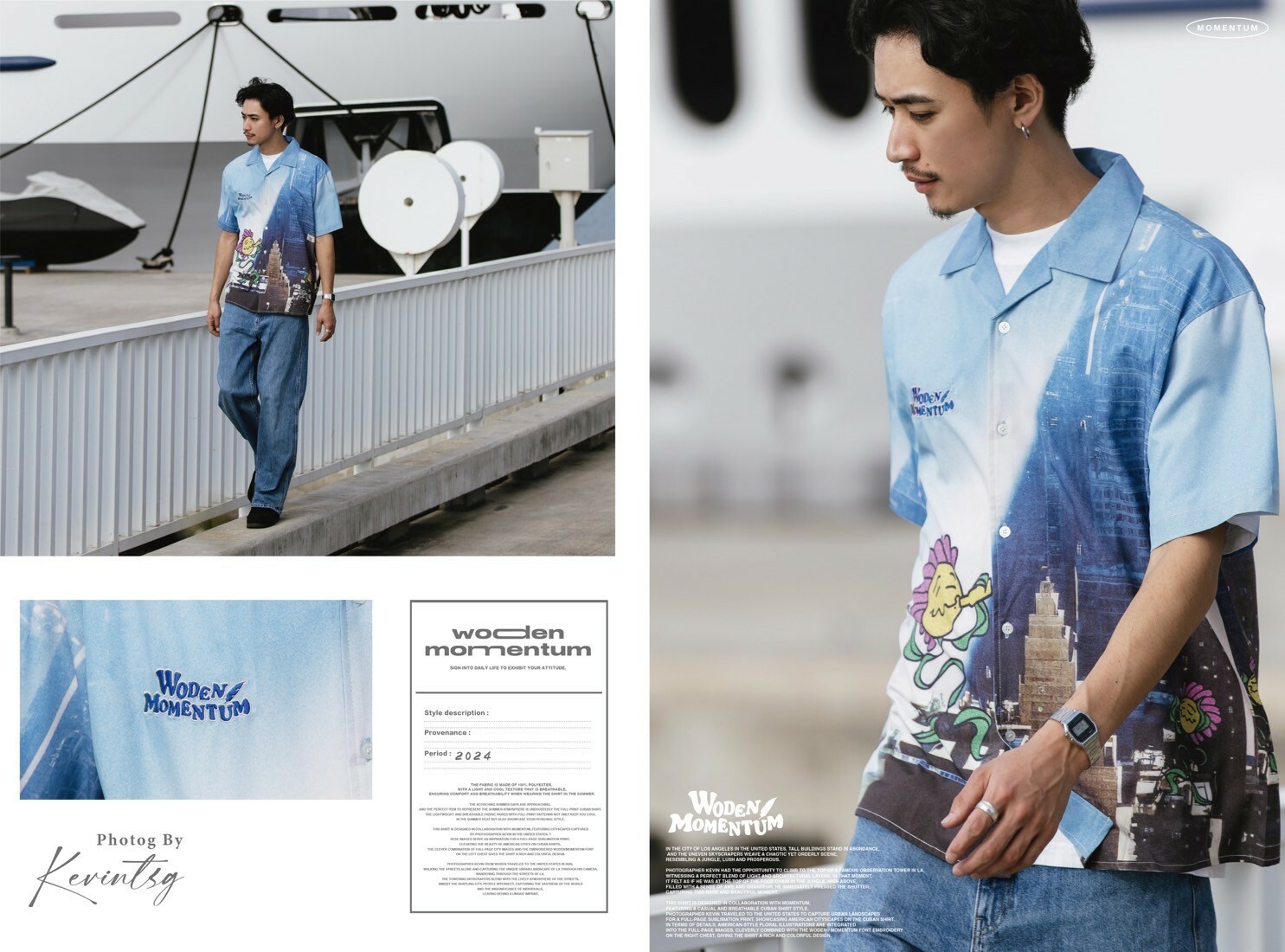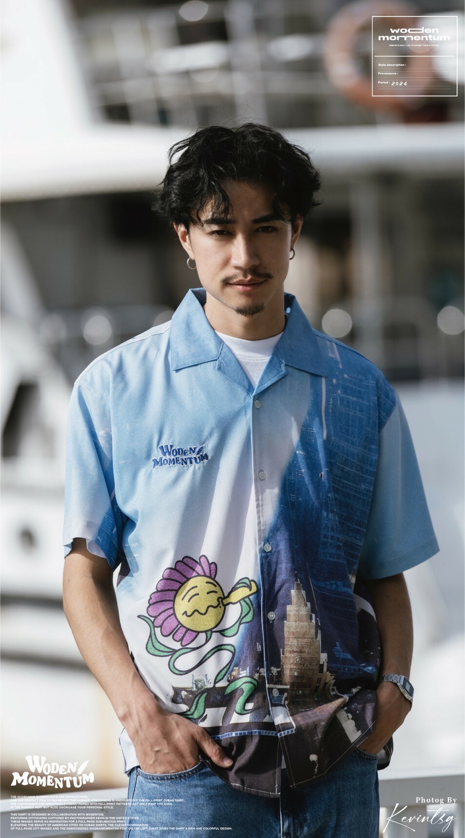 本次襯衫與Momentum合作設計,選擇休閒透氣的古巴襯衫版型,並以攝影師Kevin赴美國捕捉城市景致進行滿版昇華印花,