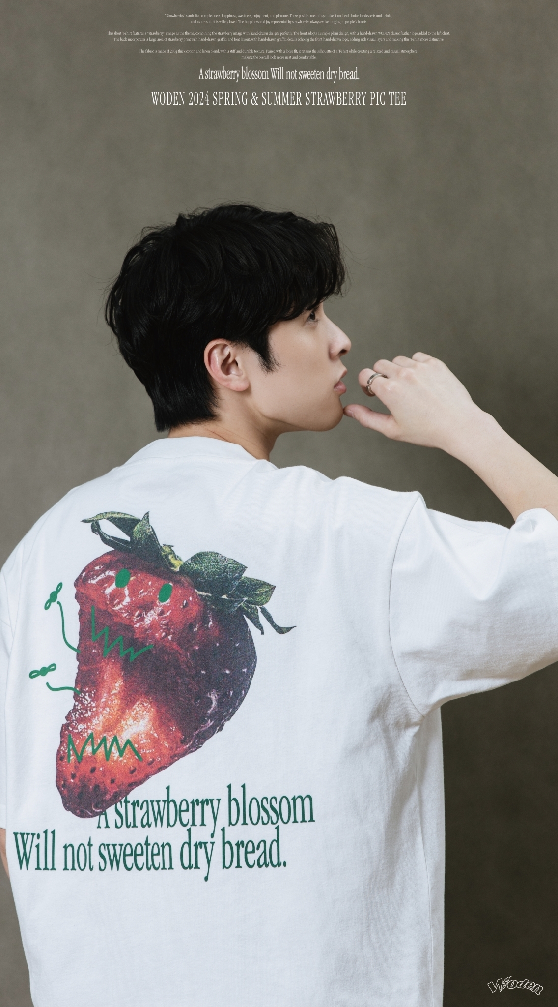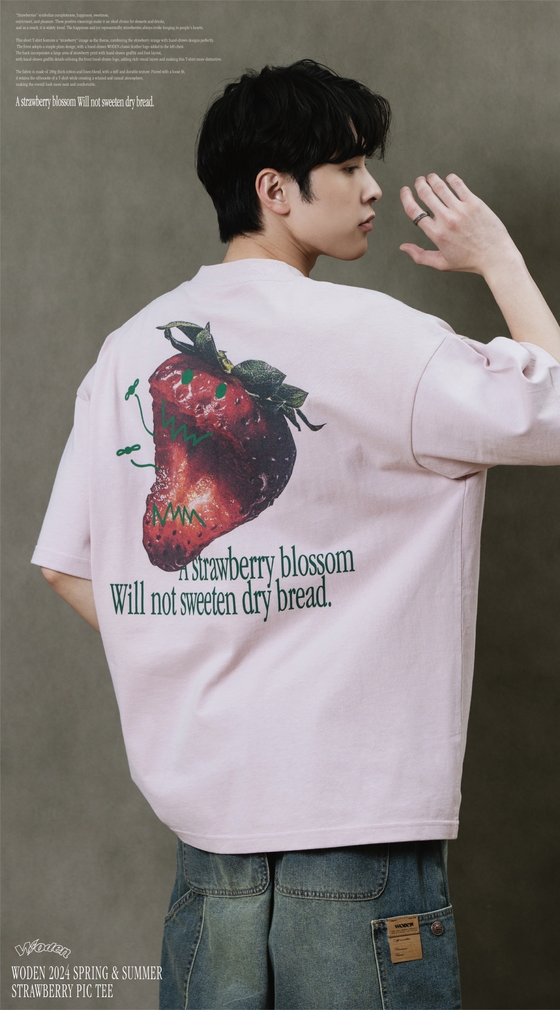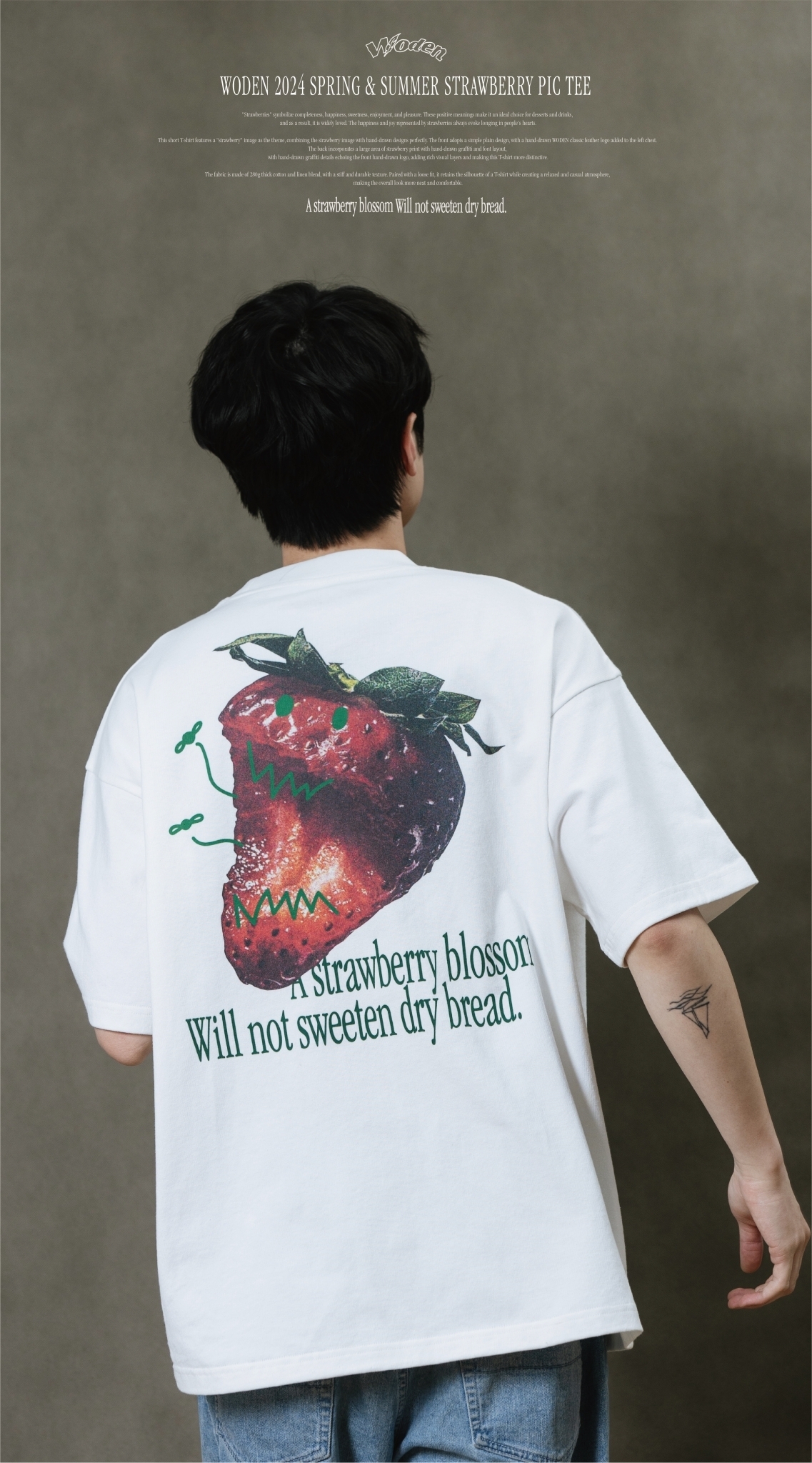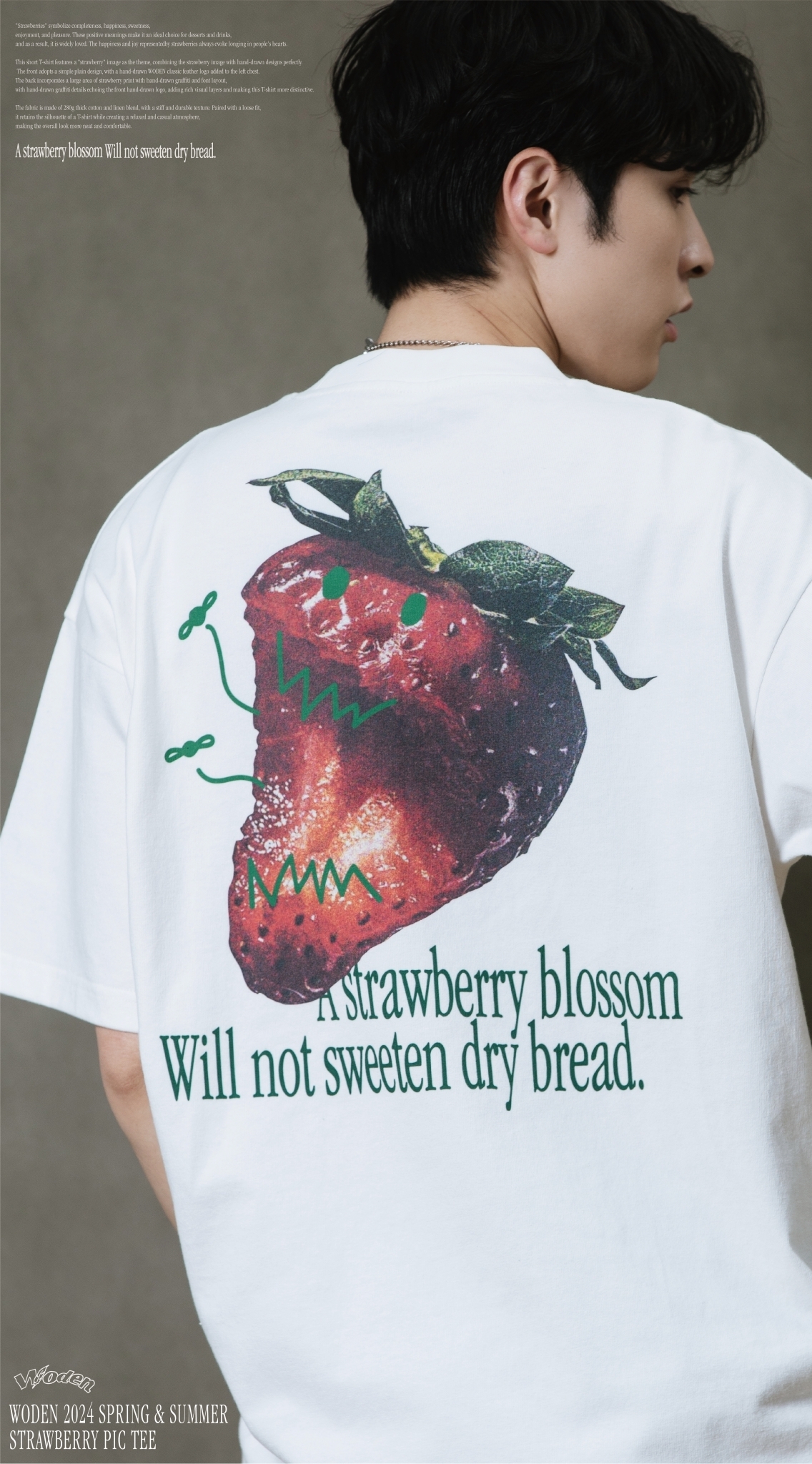 此款短T恤以『草莓』圖像作為主題,將草莓圖像與手繪設計完美結合。正面採用簡約素面設計,於左胸口添加手繪WODEN經典羽毛LOGO,背面則以大面積草莓印花融入手繪塗鴉和字體排版,手繪塗鴉細節與正面手繪LOGO相互呼應,增添豐富視覺層次,使這件T恤更具特色。