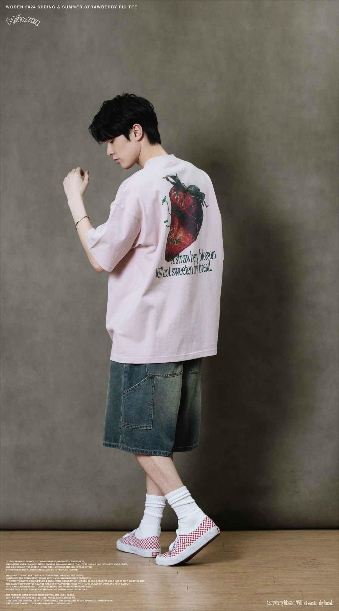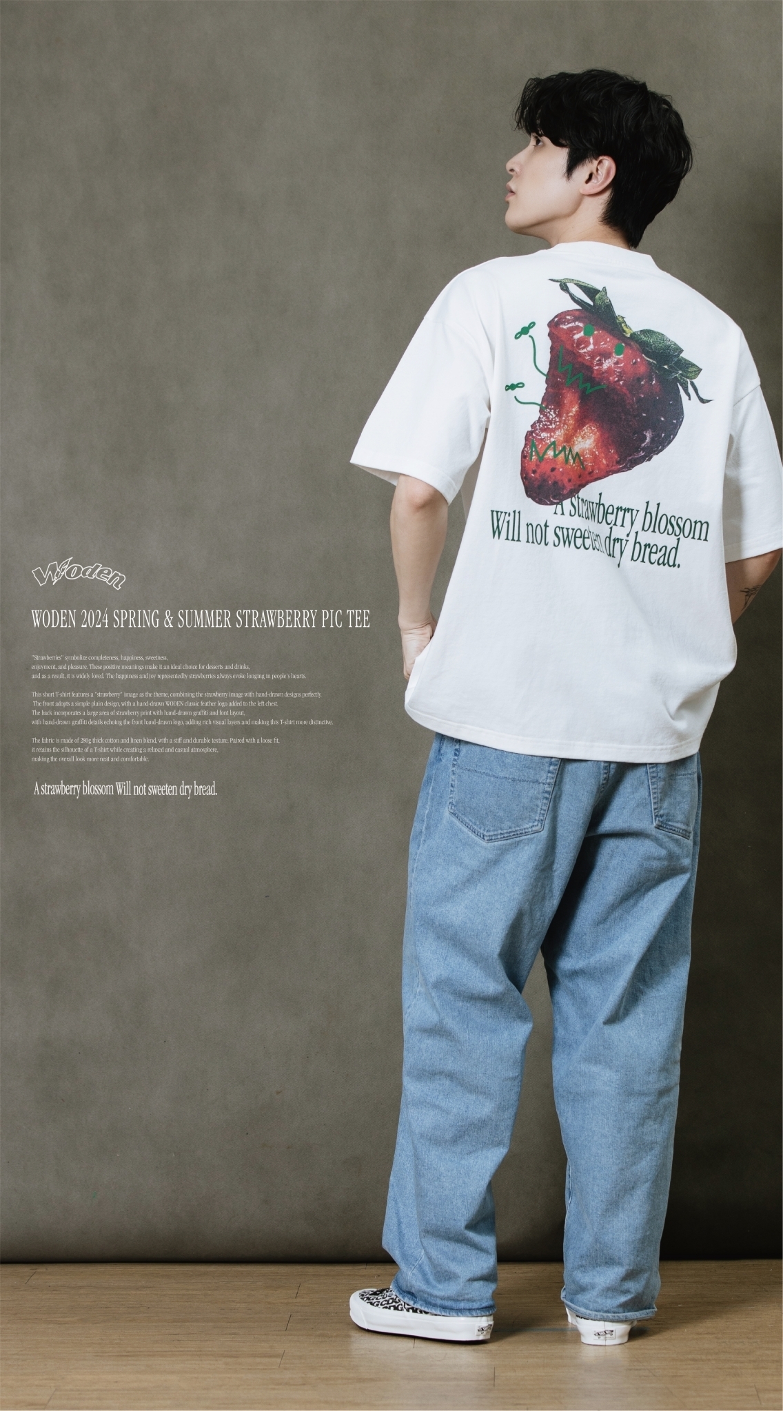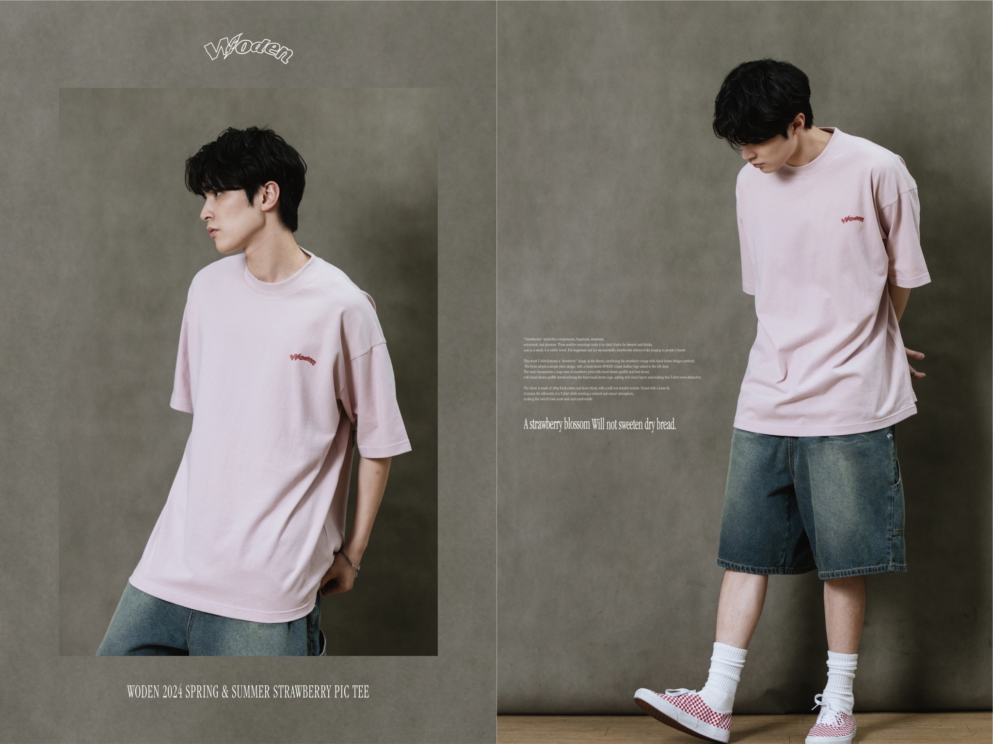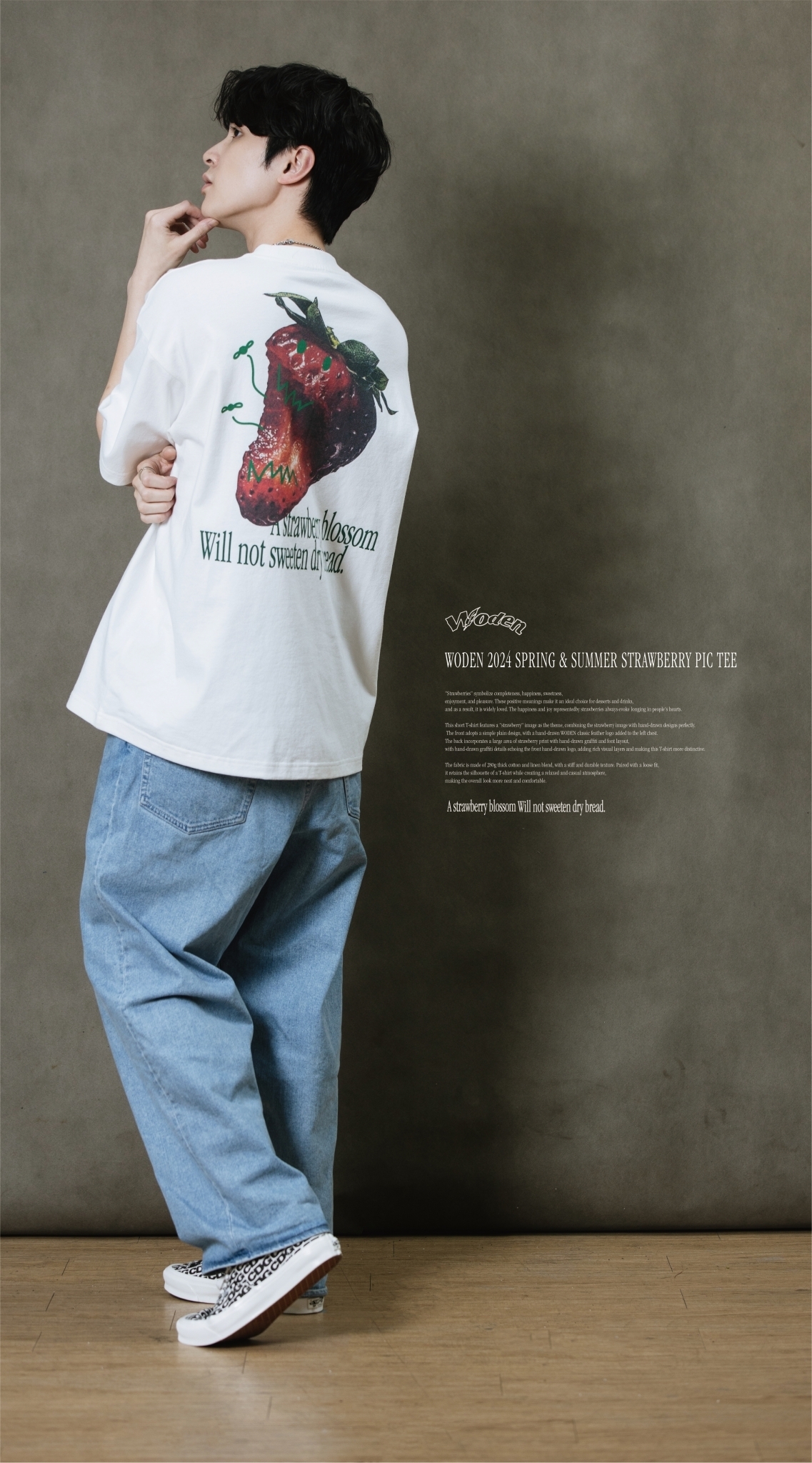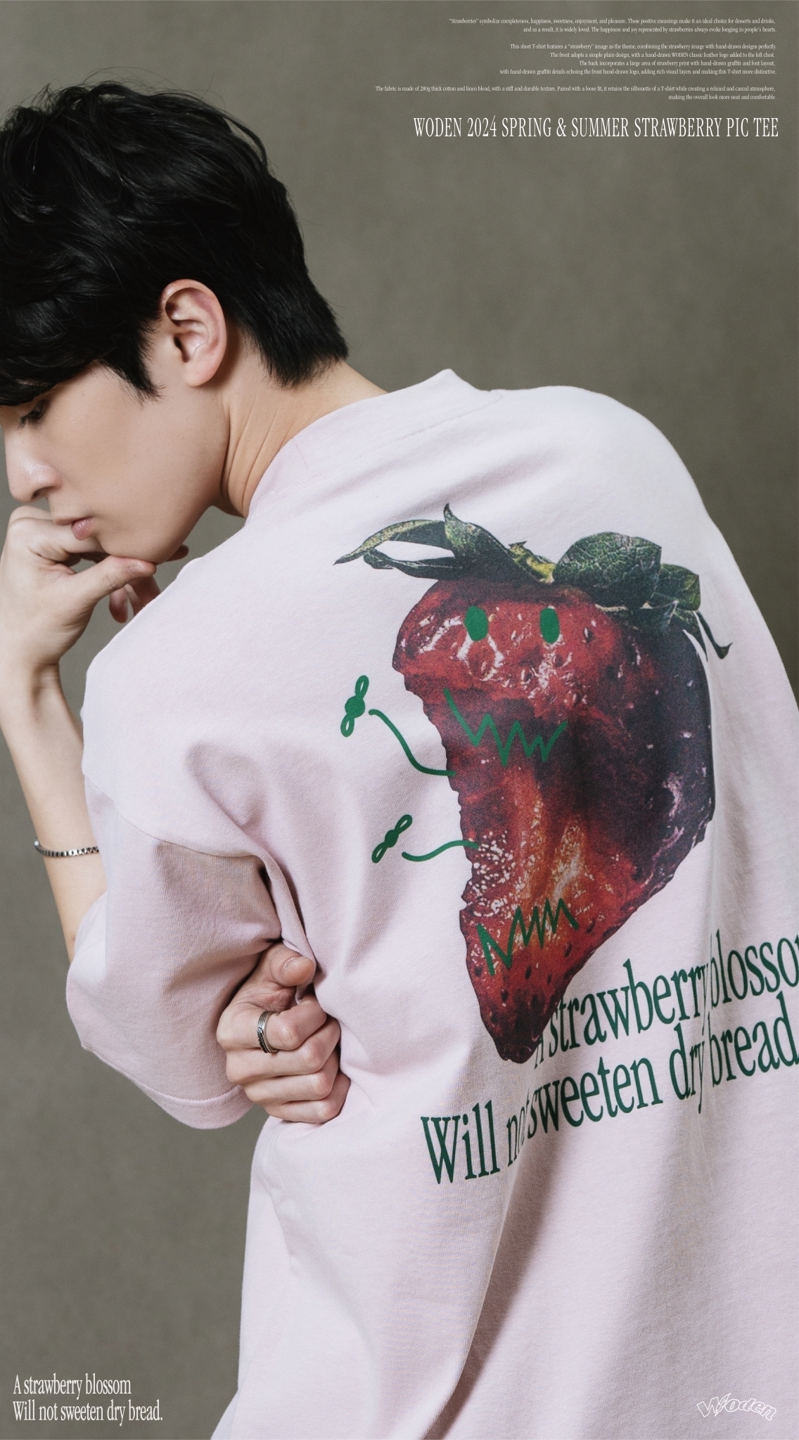 此款短T恤以『草莓』圖像作為主題,將草莓圖像與手繪設計完美結合。正面採用簡約素面設計,於左胸口添加手繪WODEN經典羽毛LOGO,背面則以大面積草莓印花融入手繪塗鴉和字體排版,手繪塗鴉細節與正面手繪LOGO相互呼應,增添豐富視覺層次,使這件T恤更具特色。
