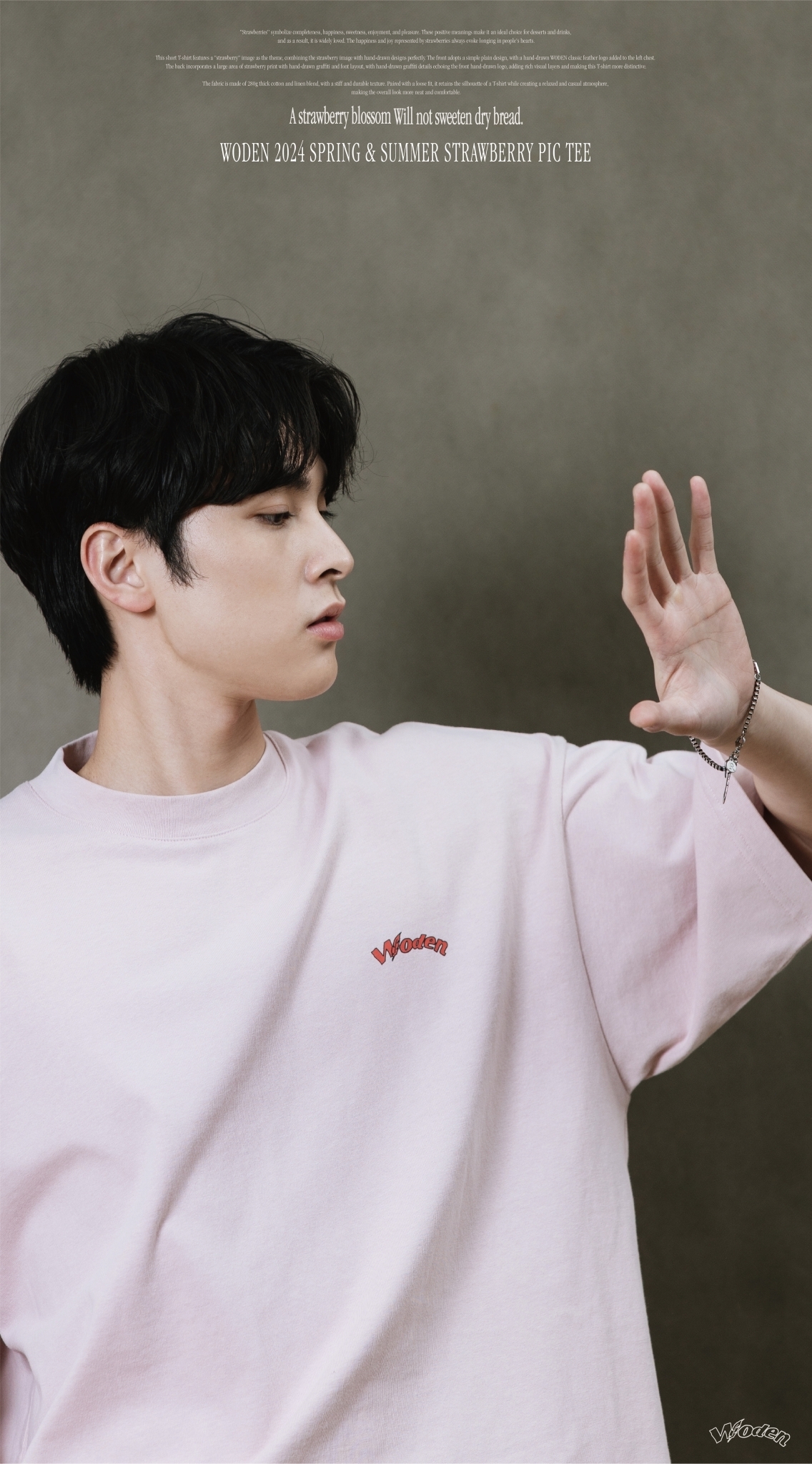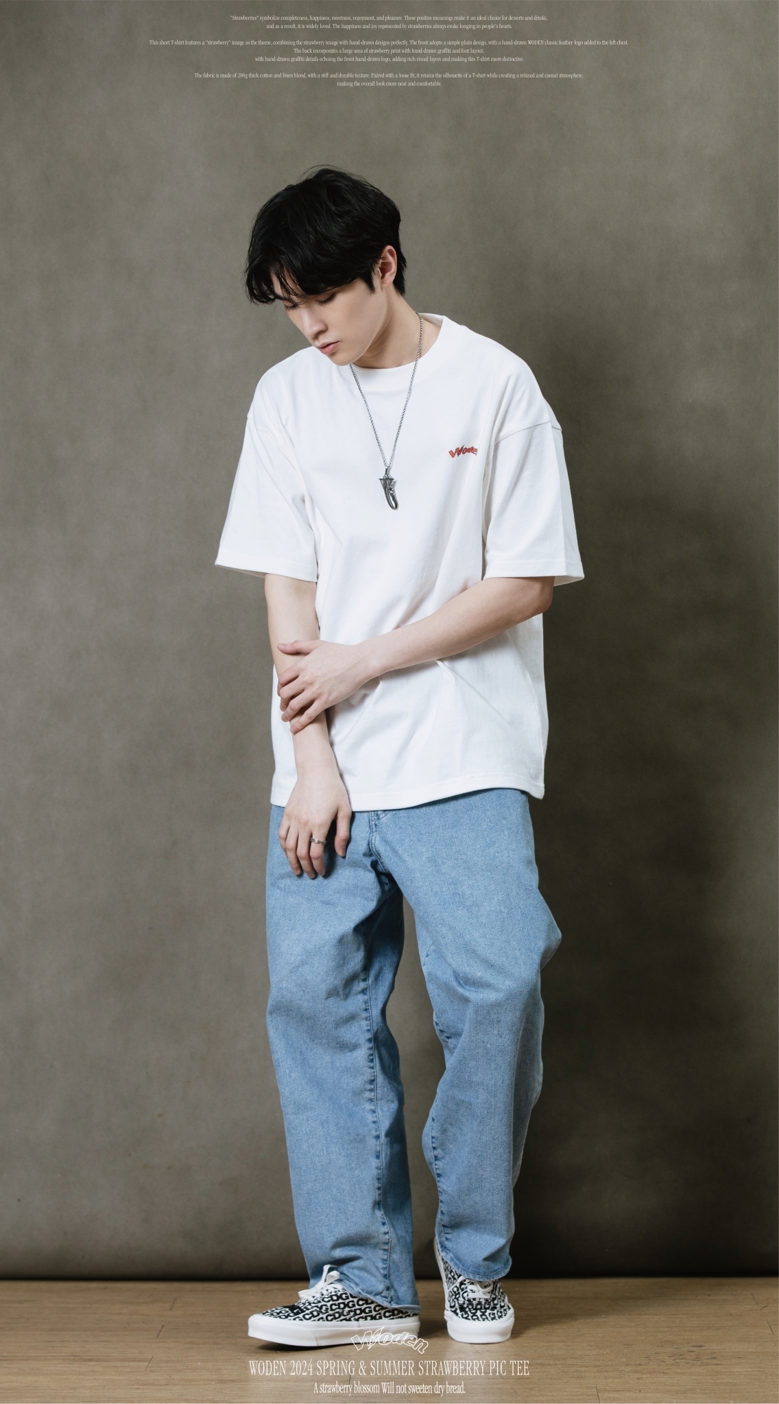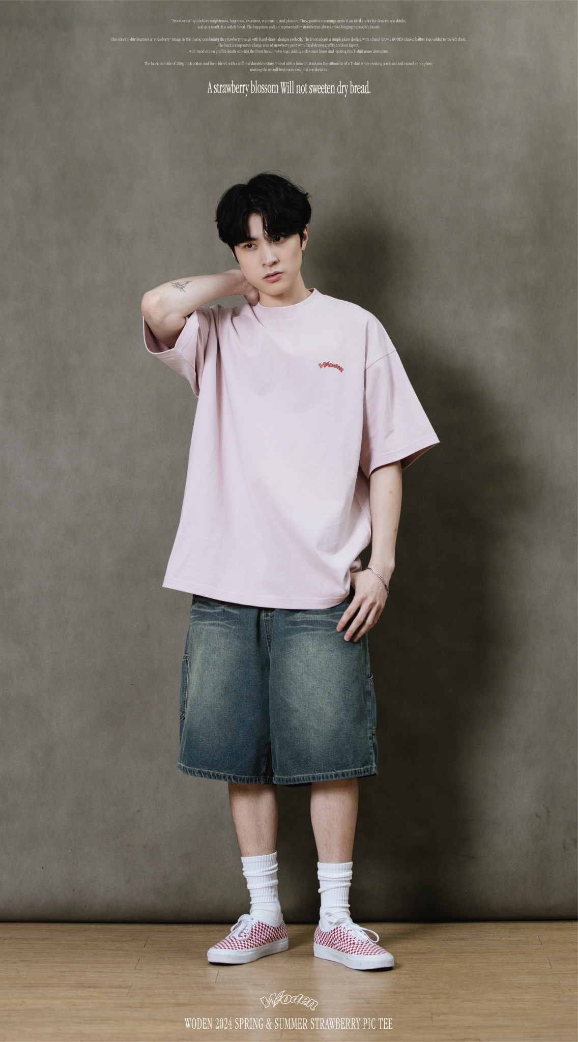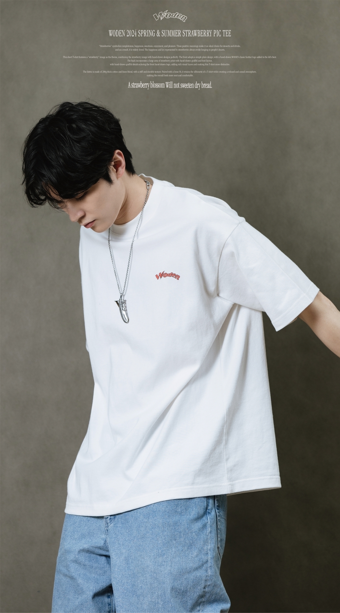 此款短T恤以『草莓』圖像作為主題,將草莓圖像與手繪設計完美結合。正面採用簡約素面設計,於左胸口添加手繪WODEN經典羽毛LOGO,背面則以大面積草莓印花融入手繪塗鴉和字體排版,手繪塗鴉細節與正面手繪LOGO相互呼應,增添豐富視覺層次,使這件T恤更具特色。
