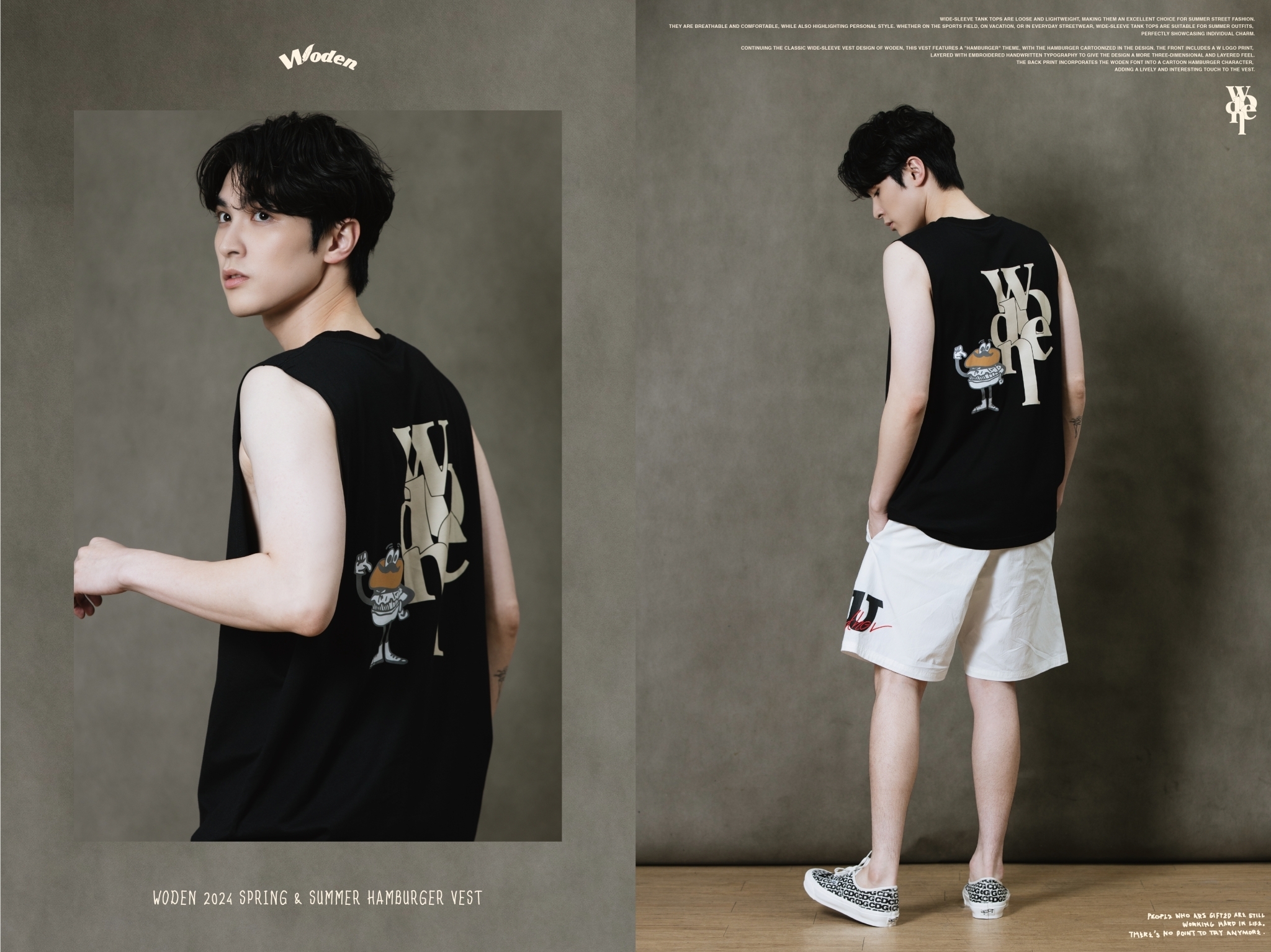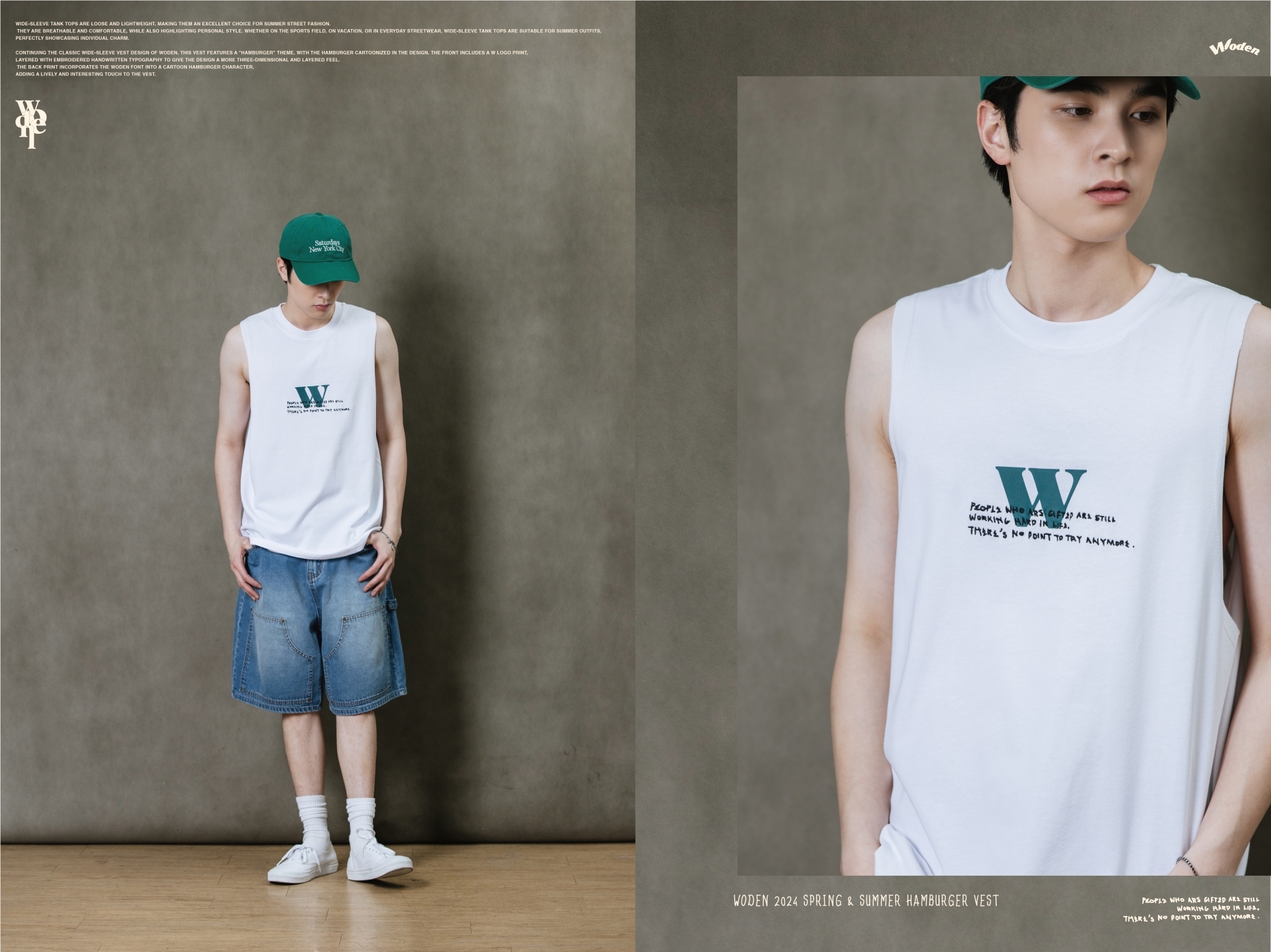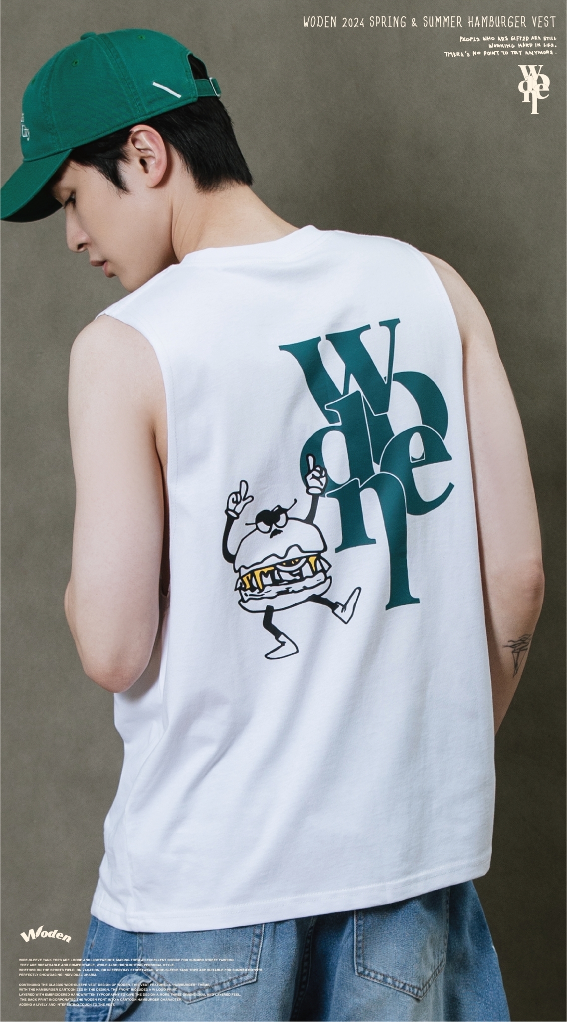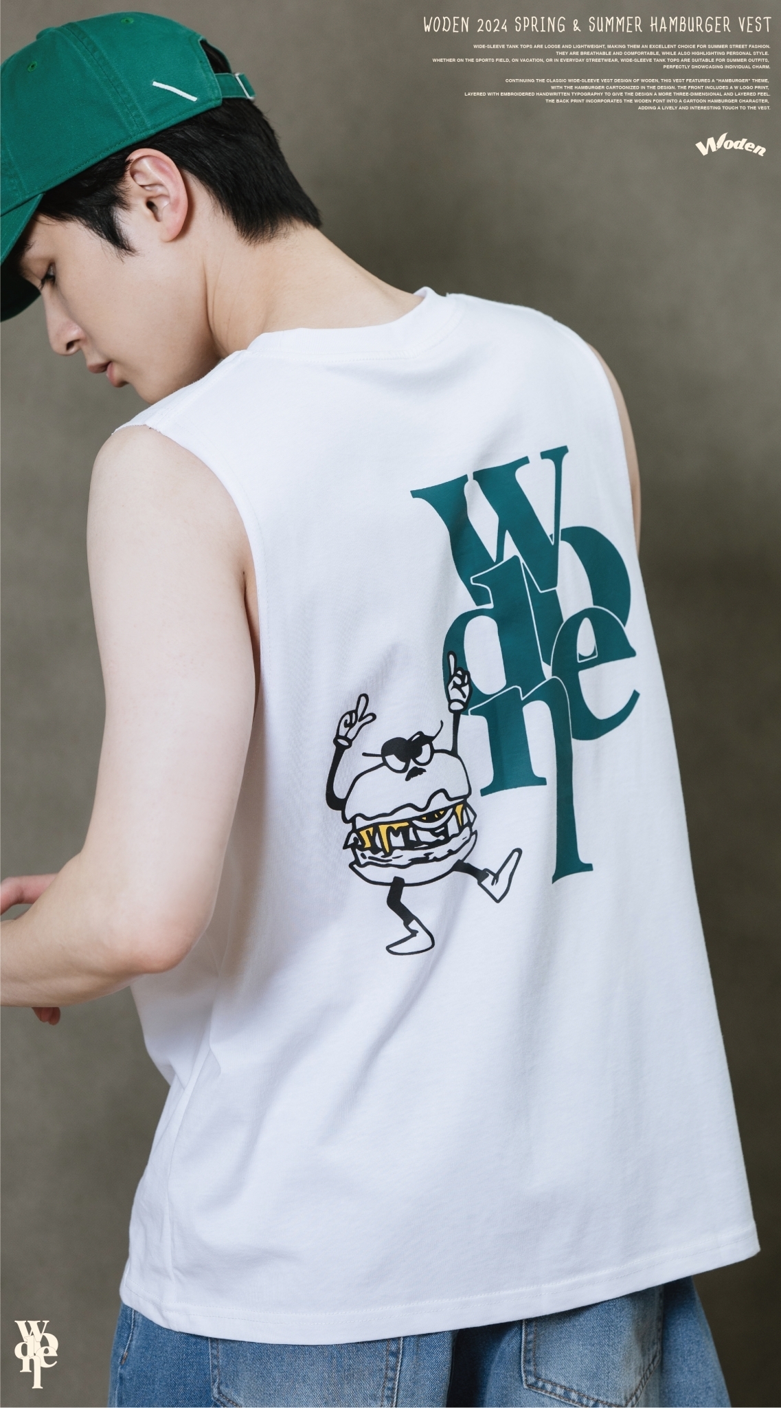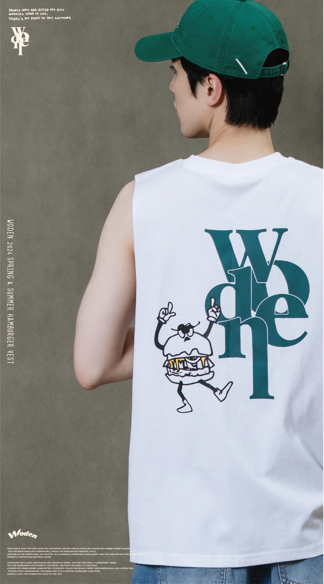 延續WODEN經典寬袖背心版型,此款背心圖像以『漢堡』為主題設計,將漢堡卡通化呈現。正面加入W LOGO印花,並疊上電繡手寫字體排版,使圖案更加立體有層次感。背面印花則以WODEN字體排版融入卡通漢堡人形象,生動有趣的漢堡人為背心增添了豐富的趣味。