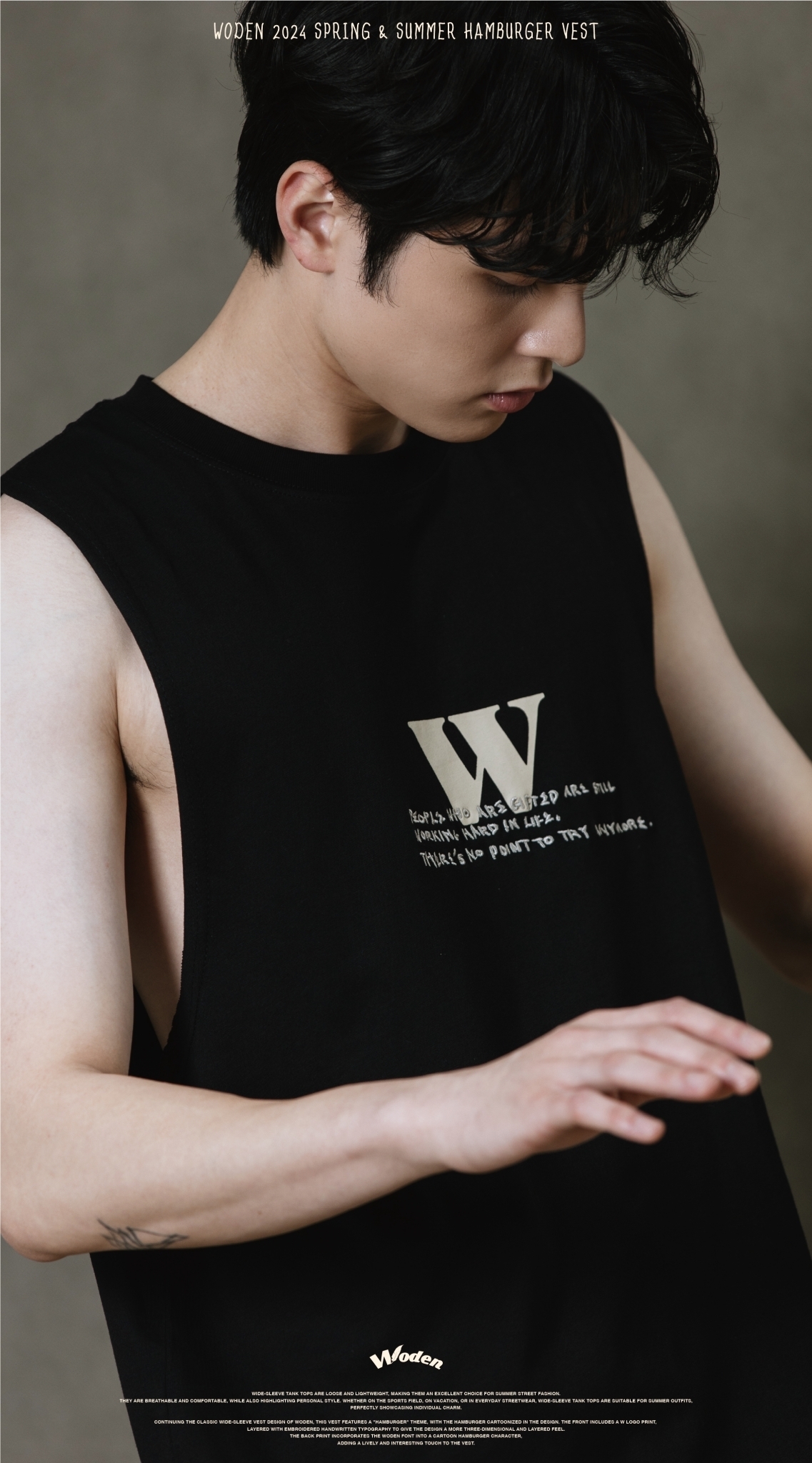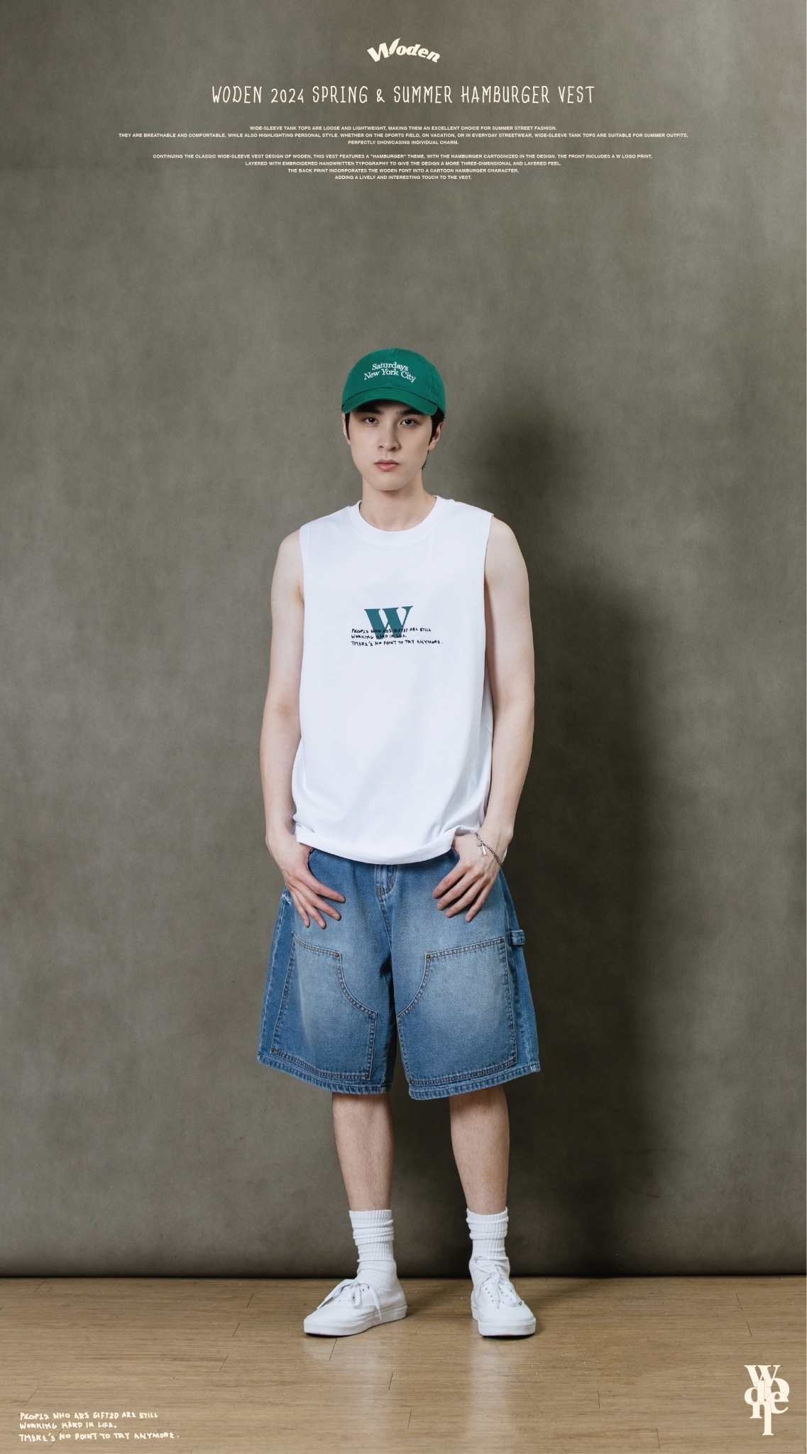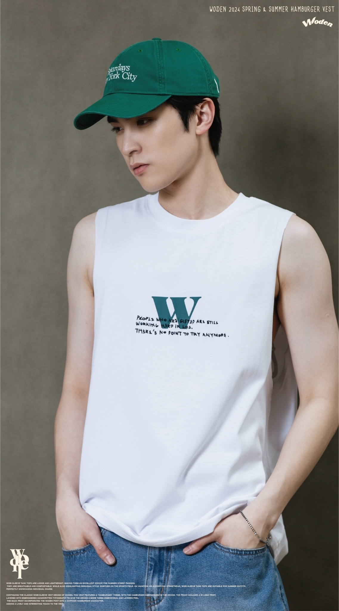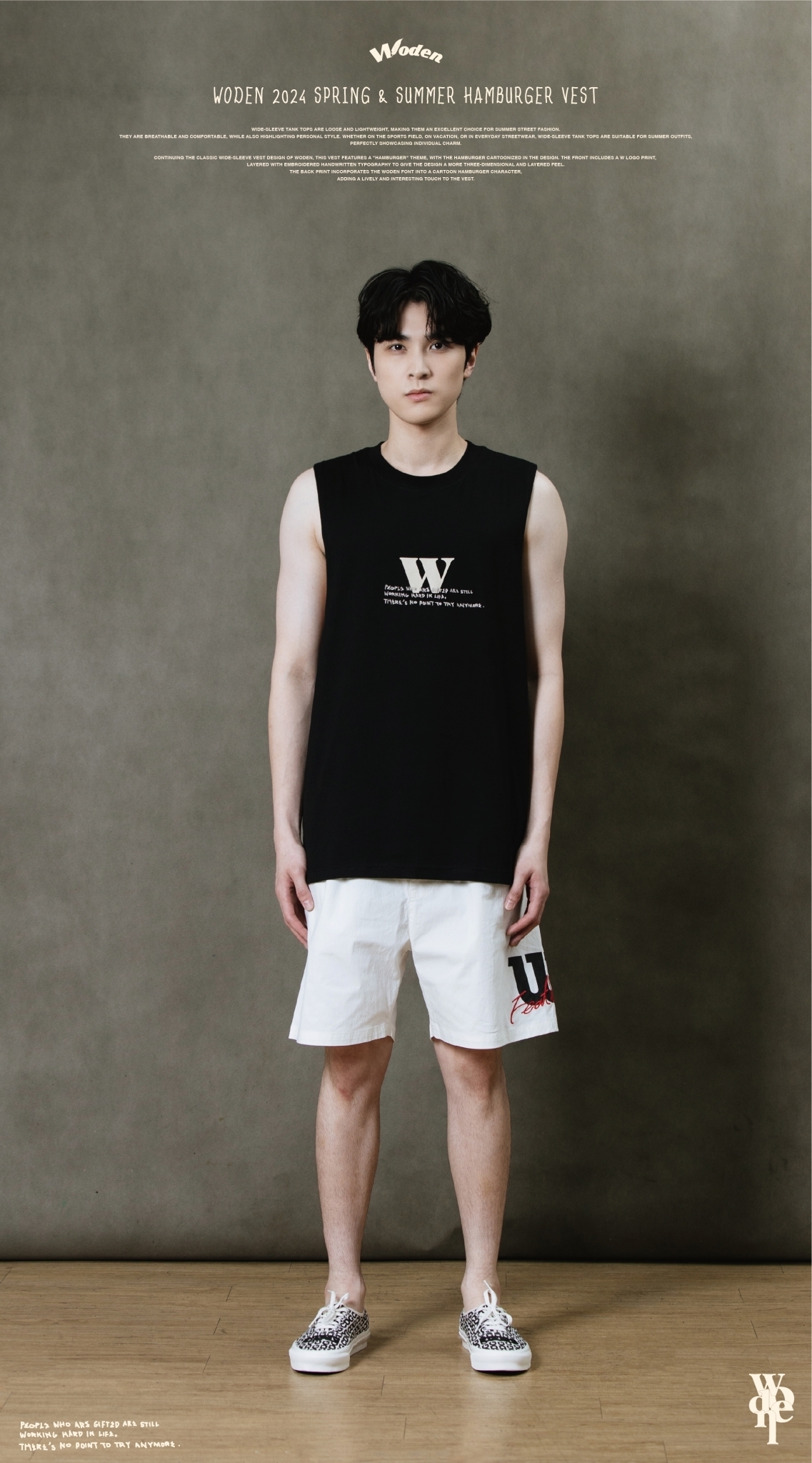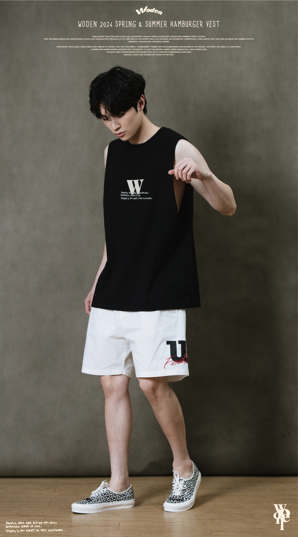 延續WODEN經典寬袖背心版型,此款背心圖像以『漢堡』為主題設計,將漢堡卡通化呈現。正面加入W LOGO印花,並疊上電繡手寫字體排版,使圖案更加立體有層次感。背面印花則以WODEN字體排版融入卡通漢堡人形象,生動有趣的漢堡人為背心增添了豐富的趣味。