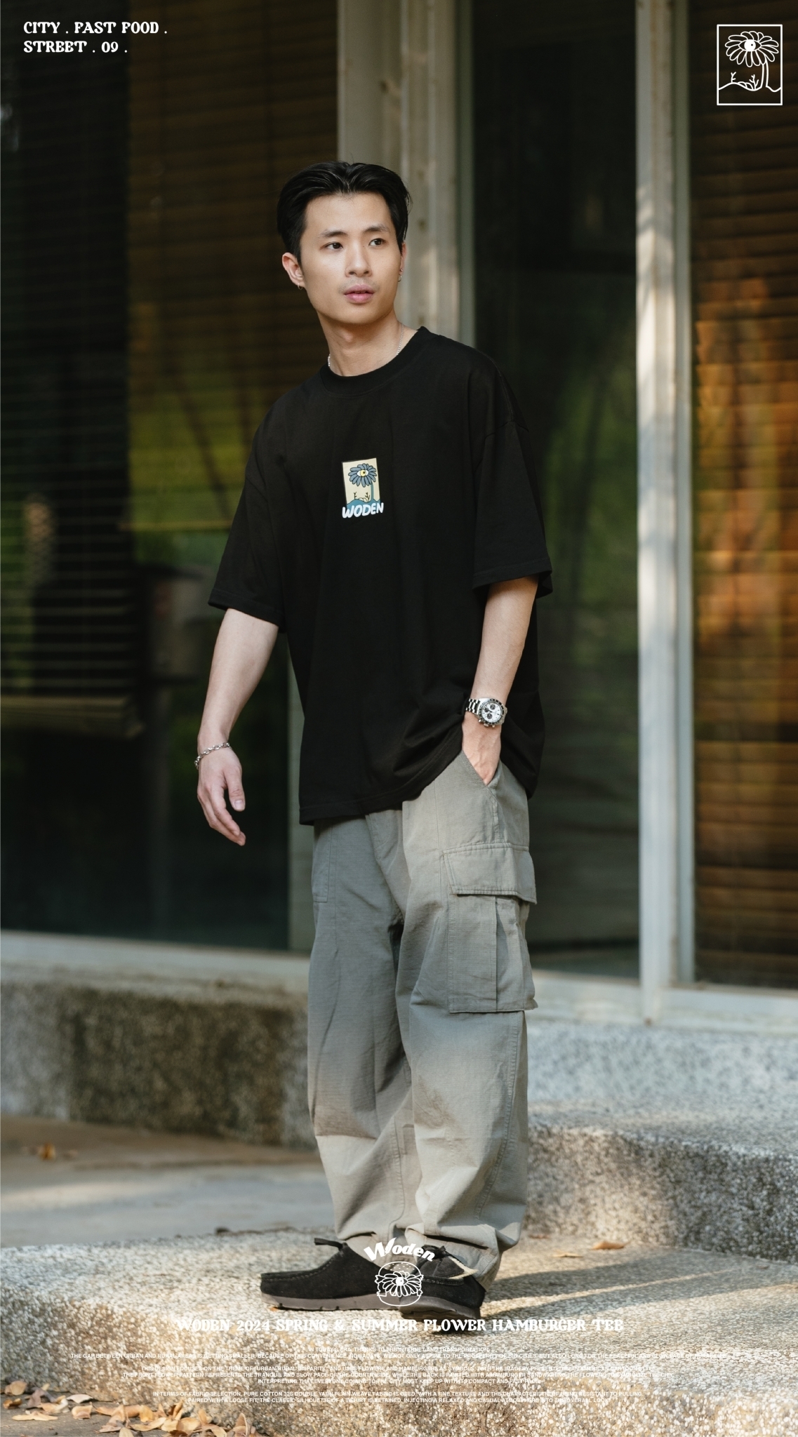 面料的選用方面,採用純棉32支雙紗平紋面料,雙紗工藝質地細緻且具有耐拉扯的特性。搭配寬鬆的版型,保留了T-Shirt的經典輪廓,為整體造型注入輕鬆隨性的氛圍。