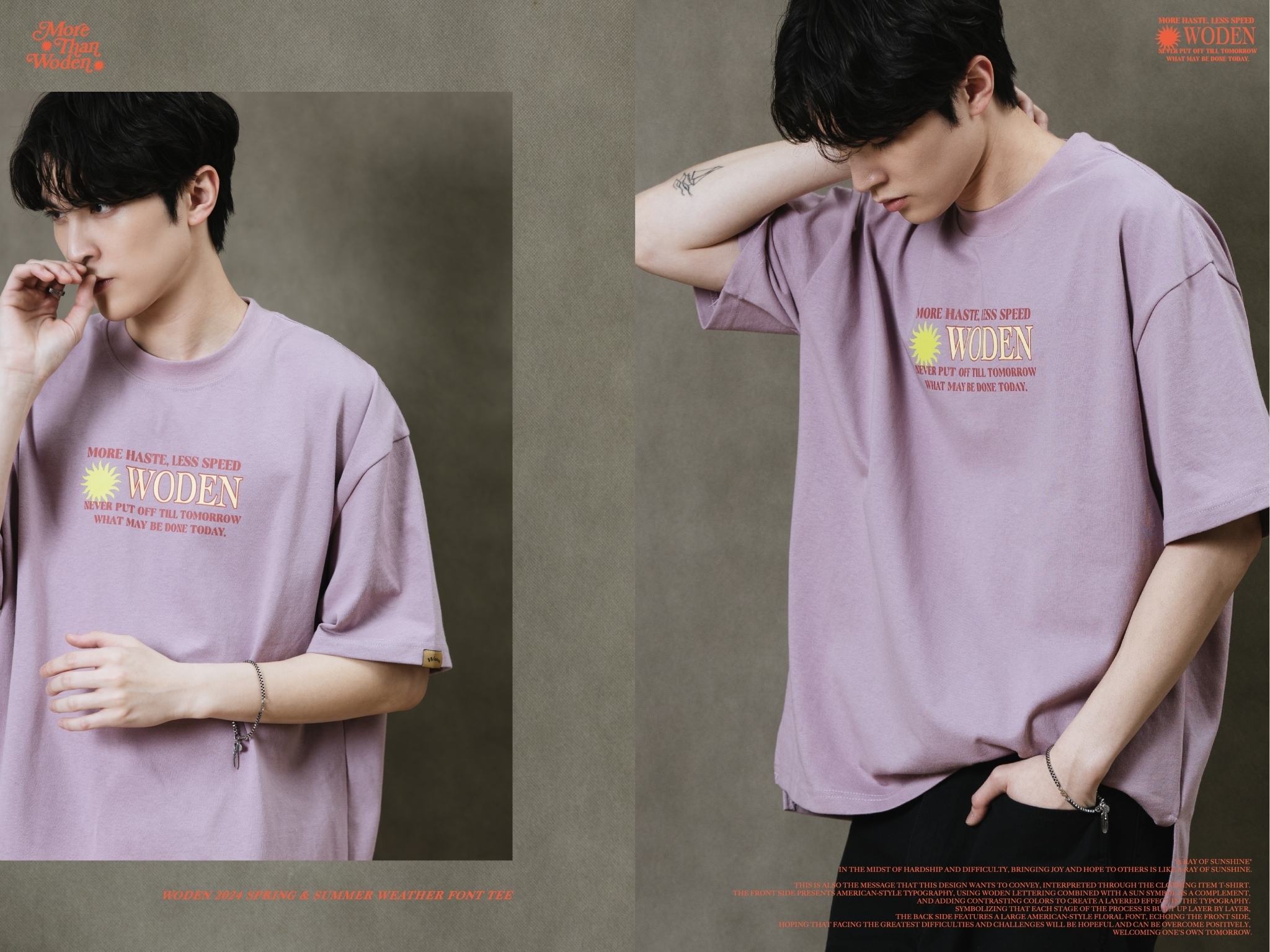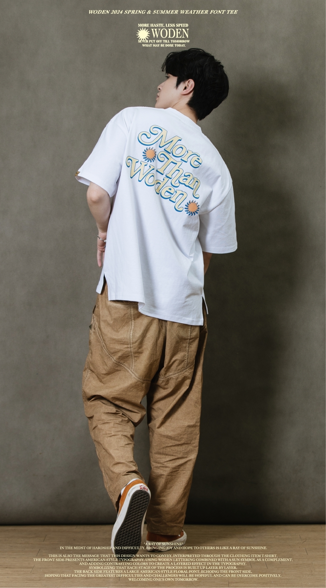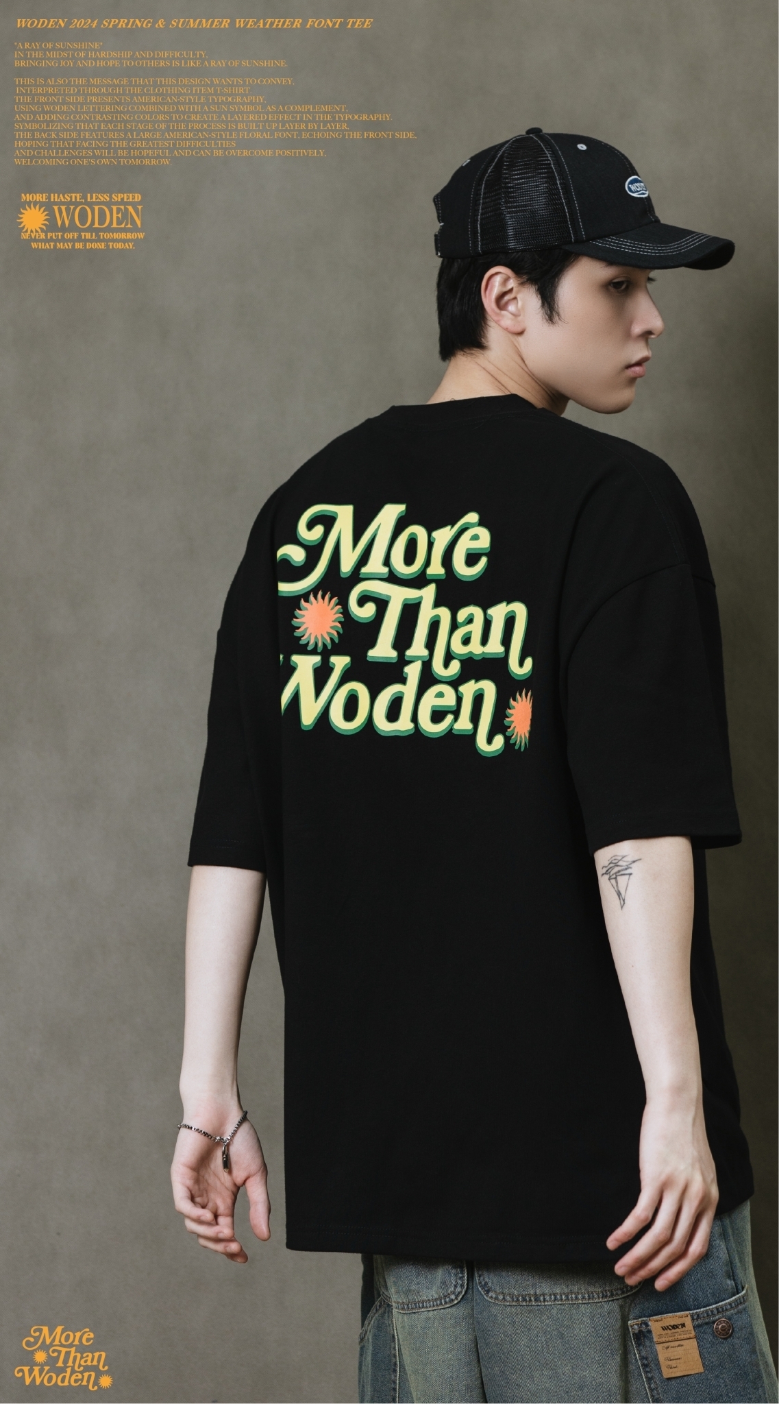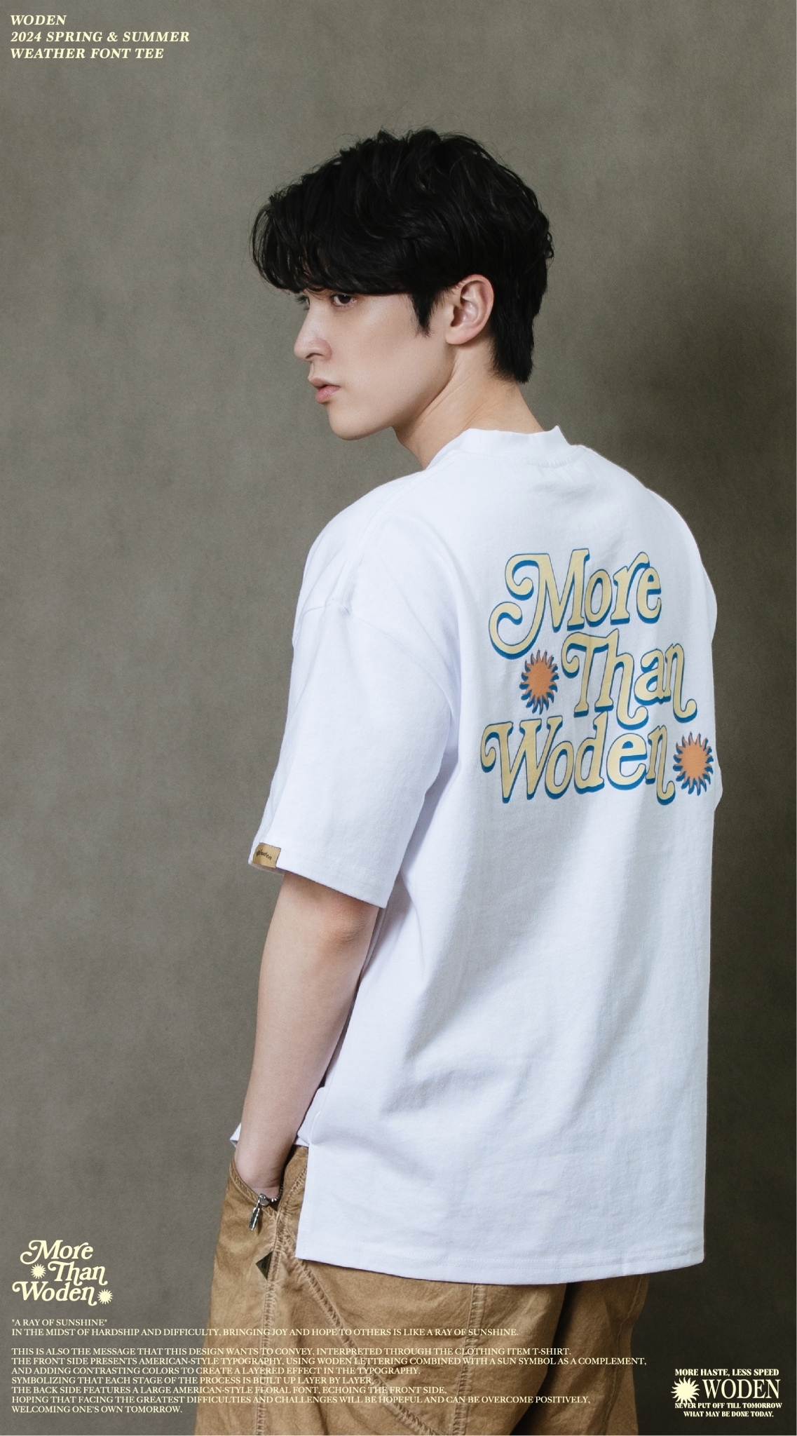 這也是此款想要傳達的信息,透過服飾單品_T-shirt來做詮釋。正面以美式排版文字呈現,利用WODEN字母排版加入太陽圖騰作為呼應,再以撞色使排版更有層次感。象徵著每個過程階段都一次相互堆疊而成,背面加入大圖美式雕花字體,與正面互相呼應,期許自己面對最大的困難、難關,都是有希望迎刃而解的,正向迎接屬於自己的明日。