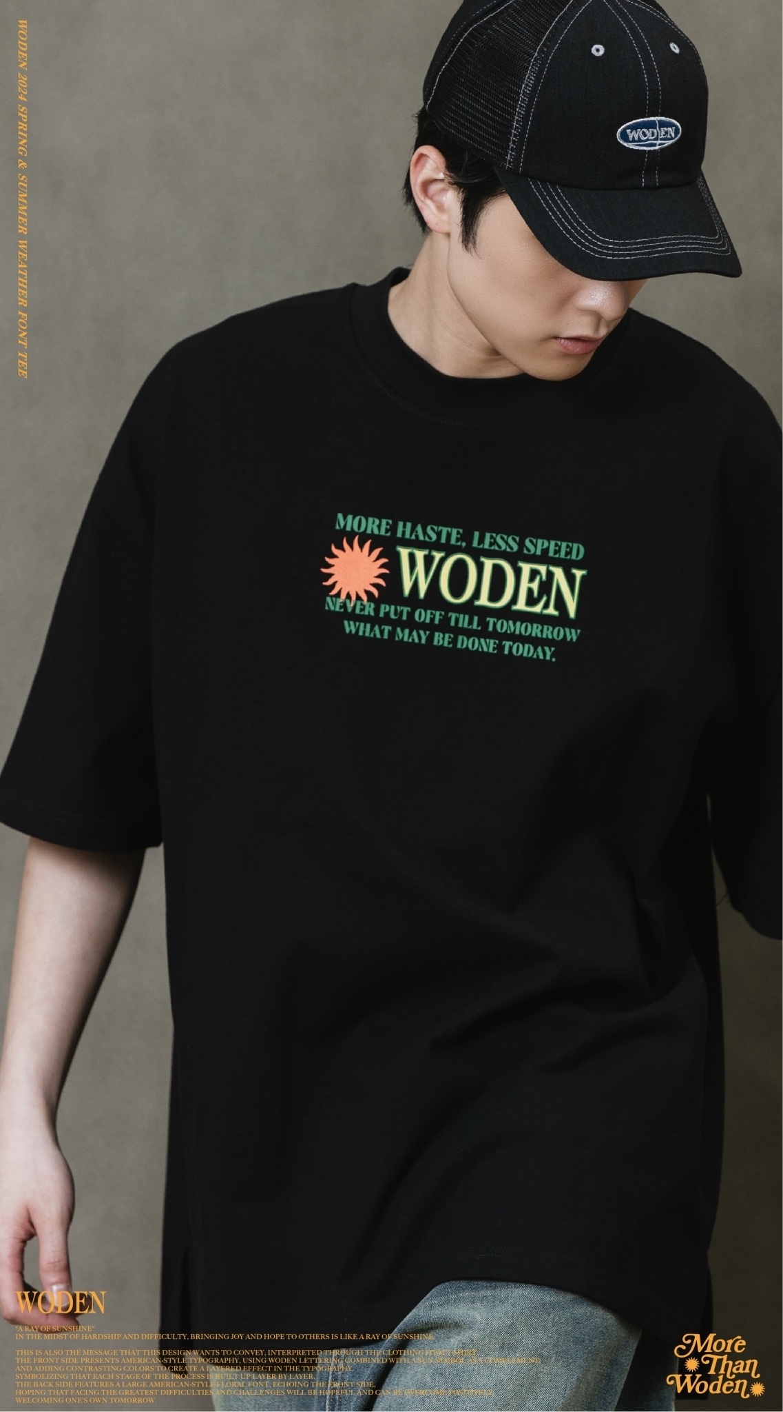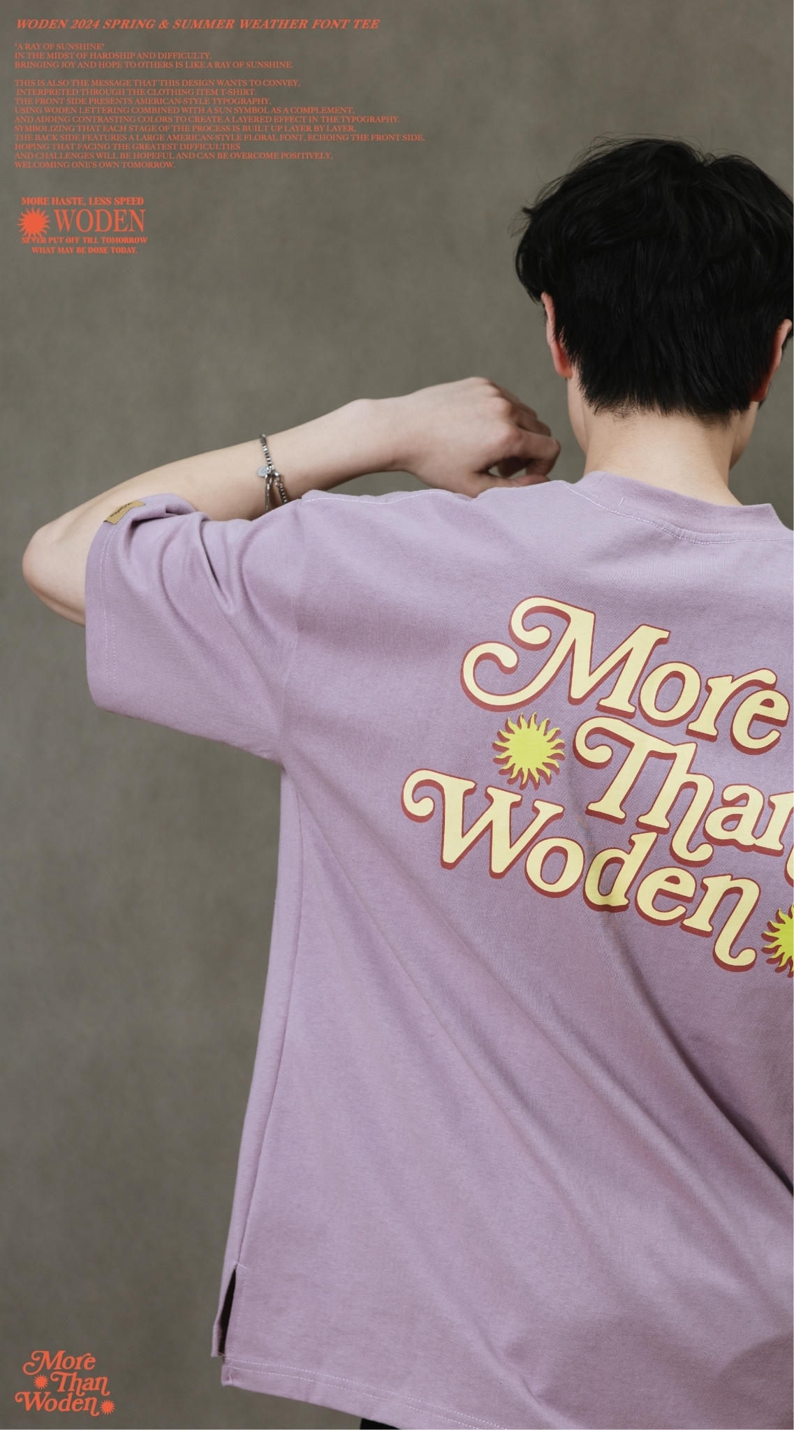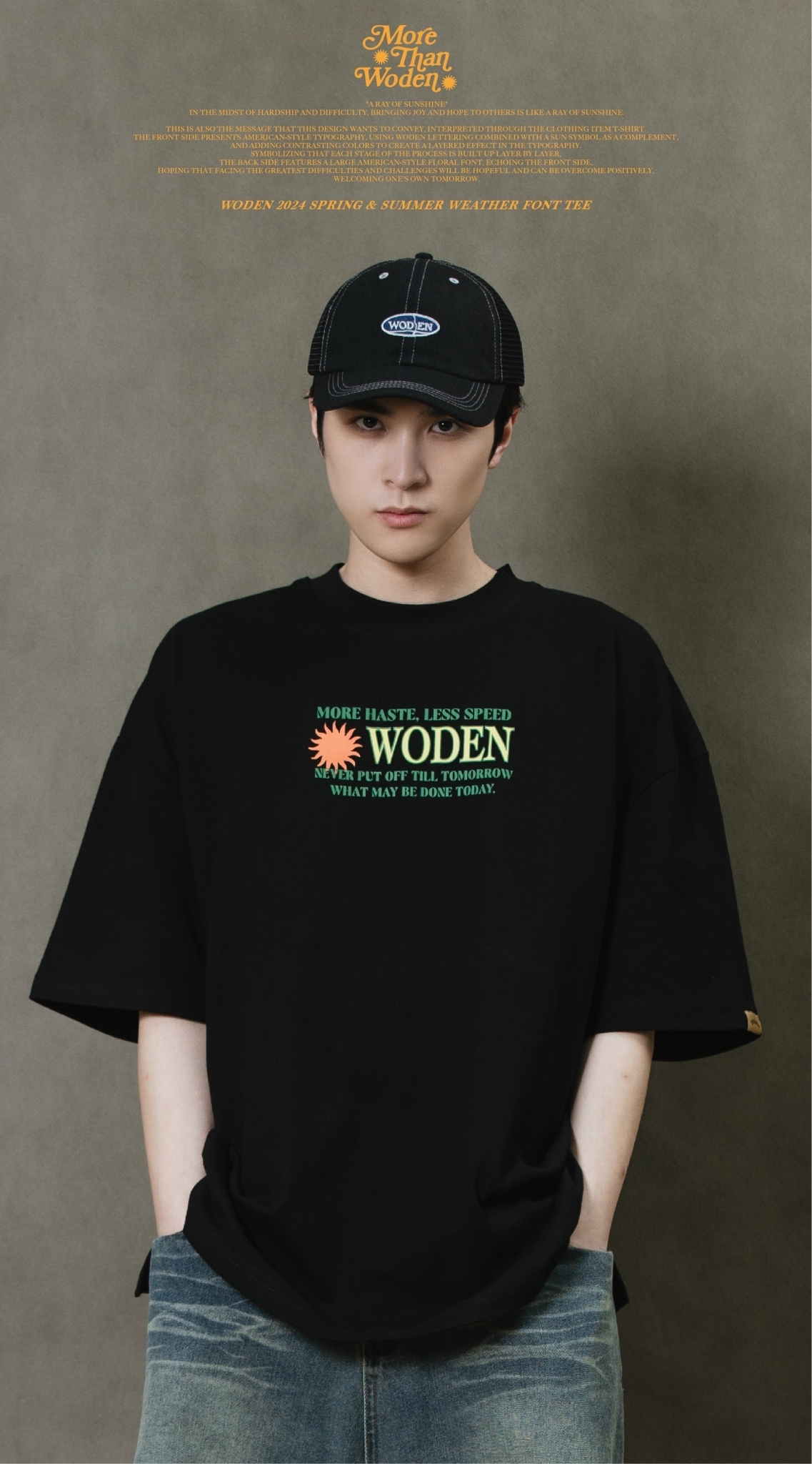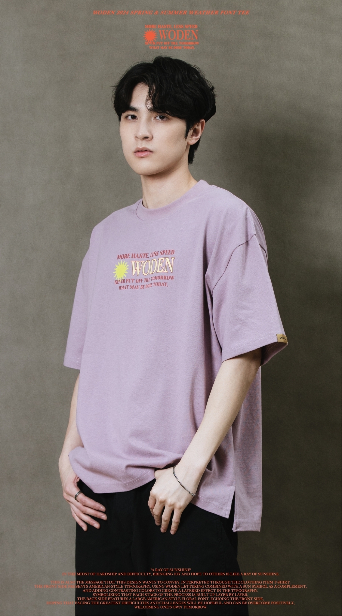 這也是此款想要傳達的信息,透過服飾單品_T-shirt來做詮釋。正面以美式排版文字呈現,利用WODEN字母排版加入太陽圖騰作為呼應,再以撞色使排版更有層次感。象徵著每個過程階段都一次相互堆疊而成,背面加入大圖美式雕花字體,與正面互相呼應,期許自己面對最大的困難、難關,都是有希望迎刃而解的,正向迎接屬於自己的明日。