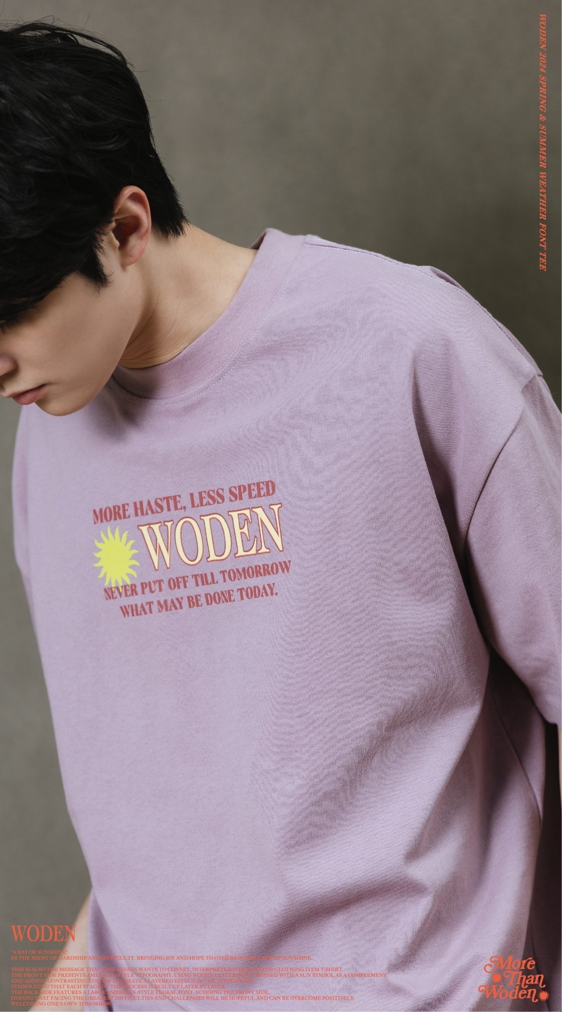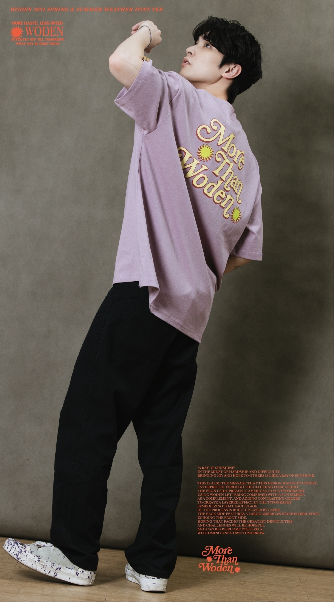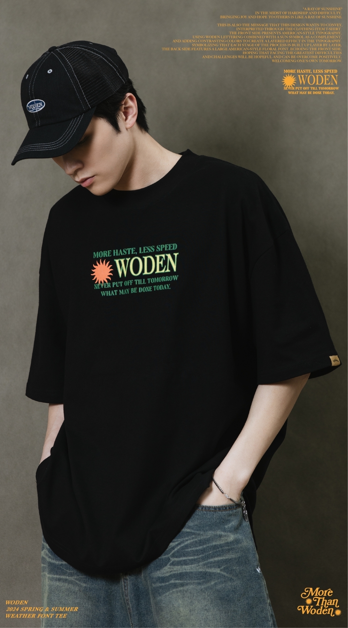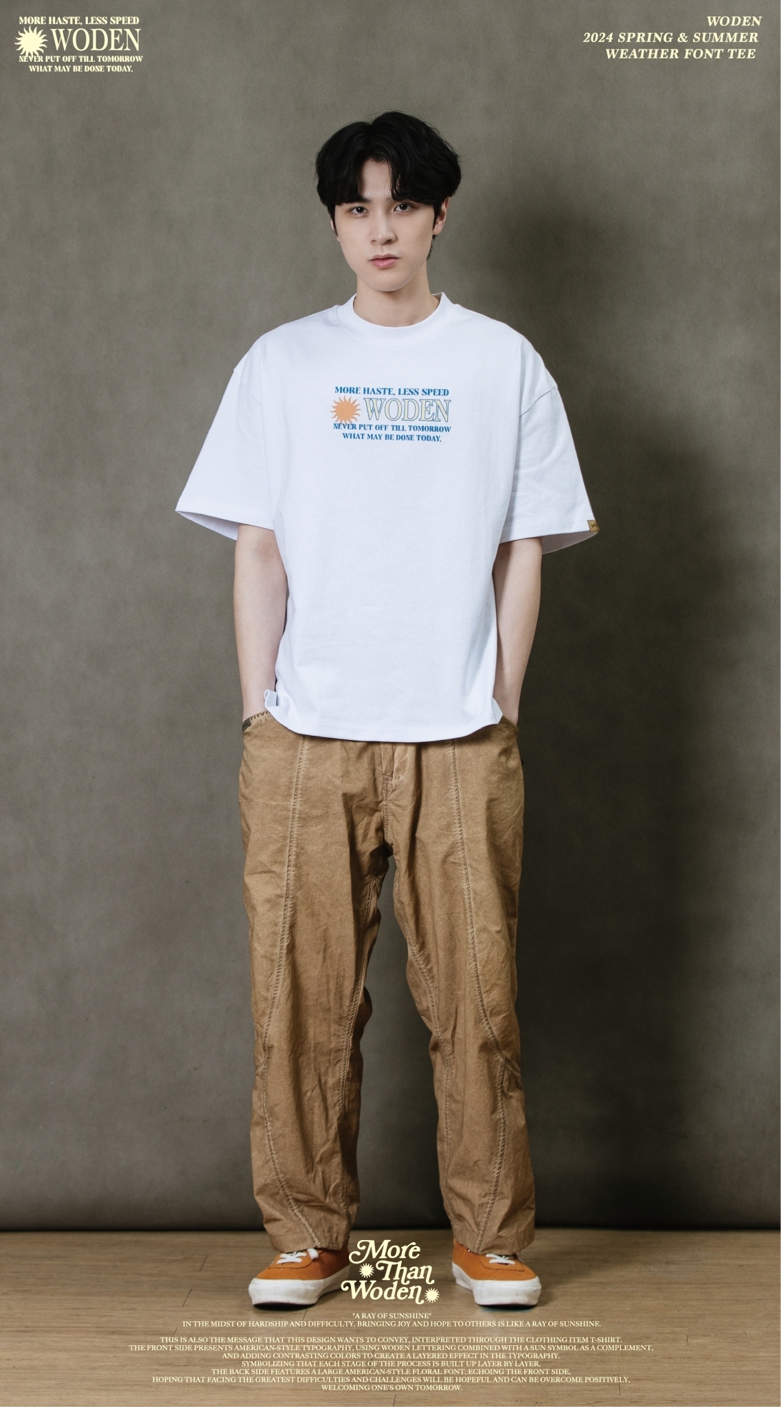 這也是此款想要傳達的信息,透過服飾單品_T-shirt來做詮釋。正面以美式排版文字呈現,利用WODEN字母排版加入太陽圖騰作為呼應,再以撞色使排版更有層次感。象徵著每個過程階段都一次相互堆疊而成,背面加入大圖美式雕花字體,與正面互相呼應,期許自己面對最大的困難、難關,都是有希望迎刃而解的,正向迎接屬於自己的明日。