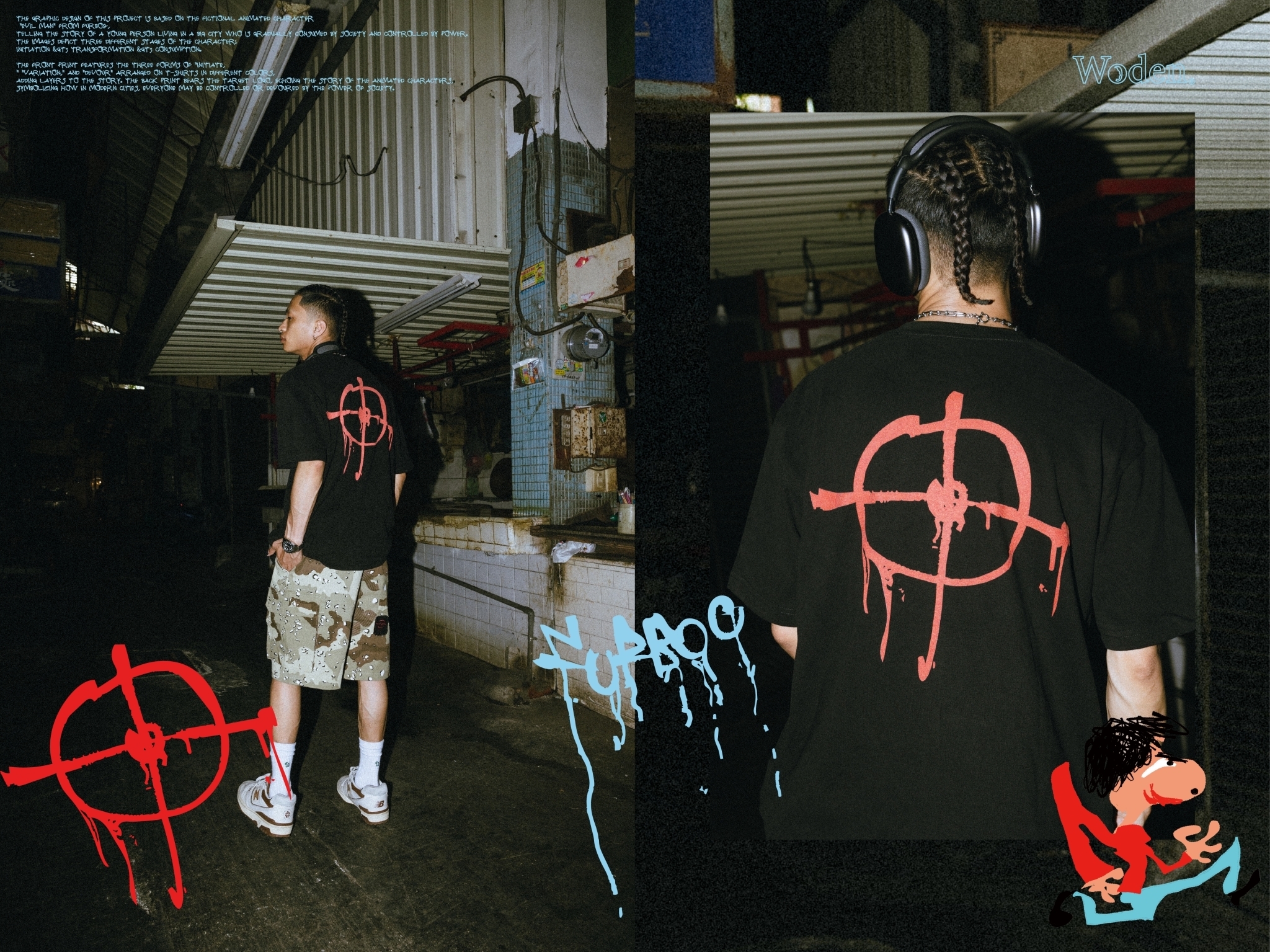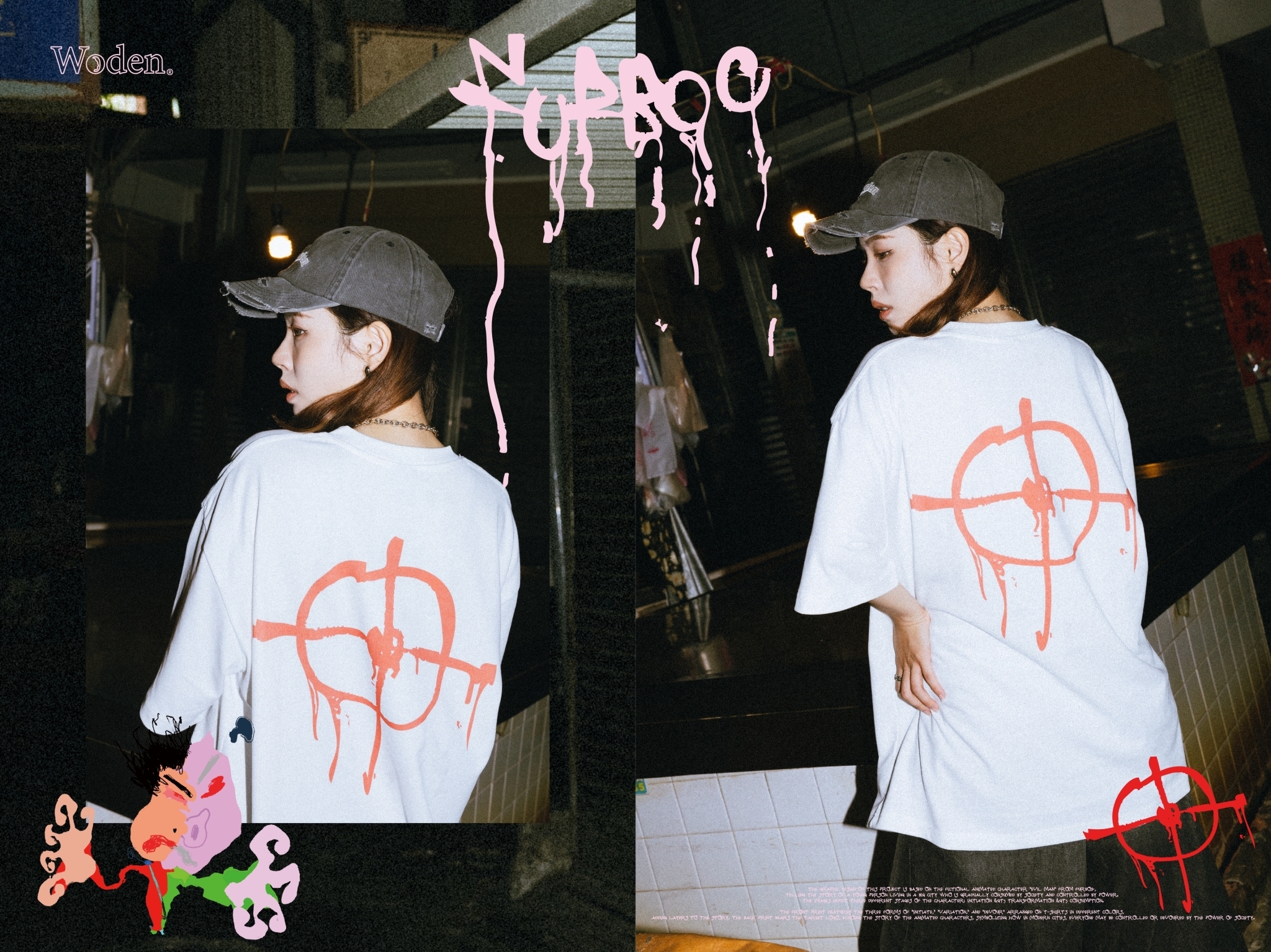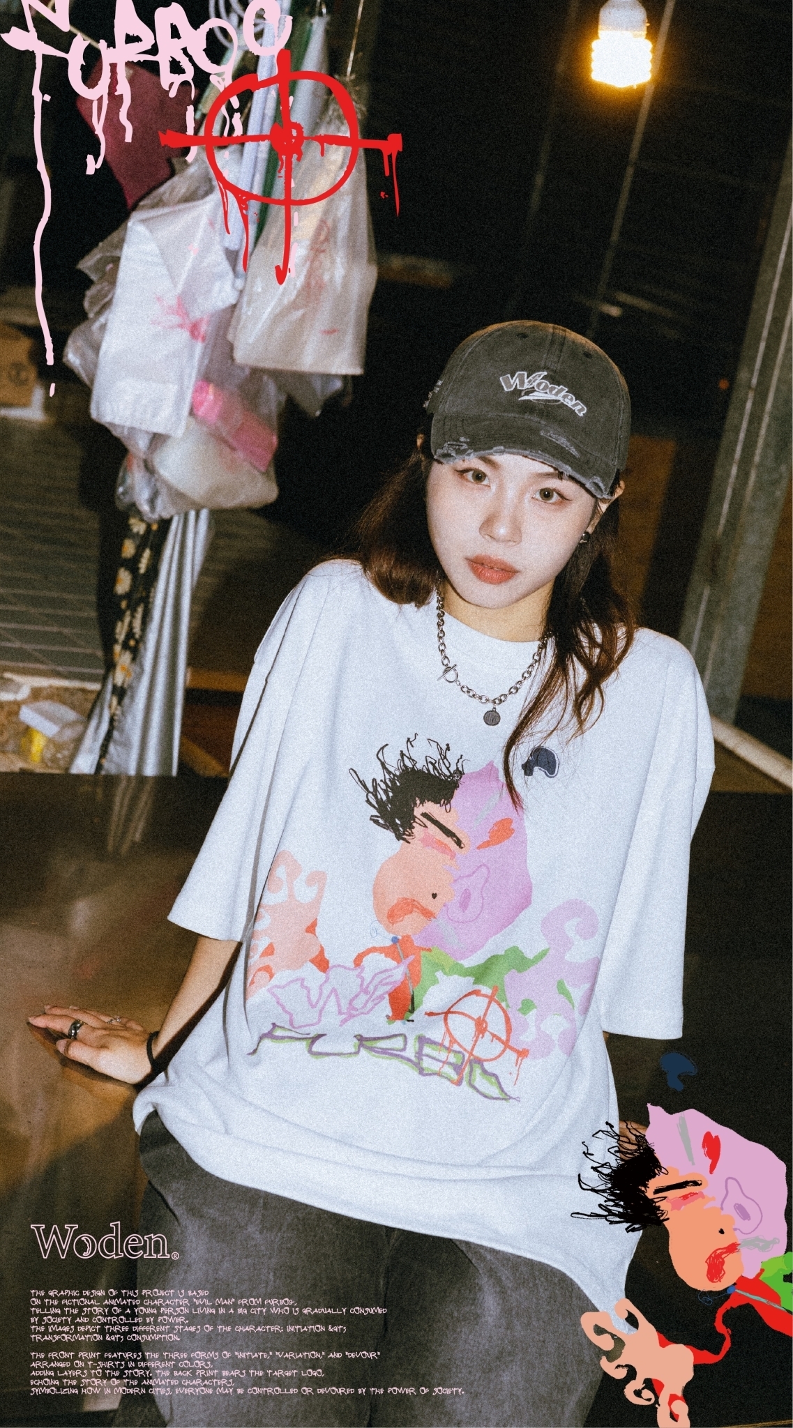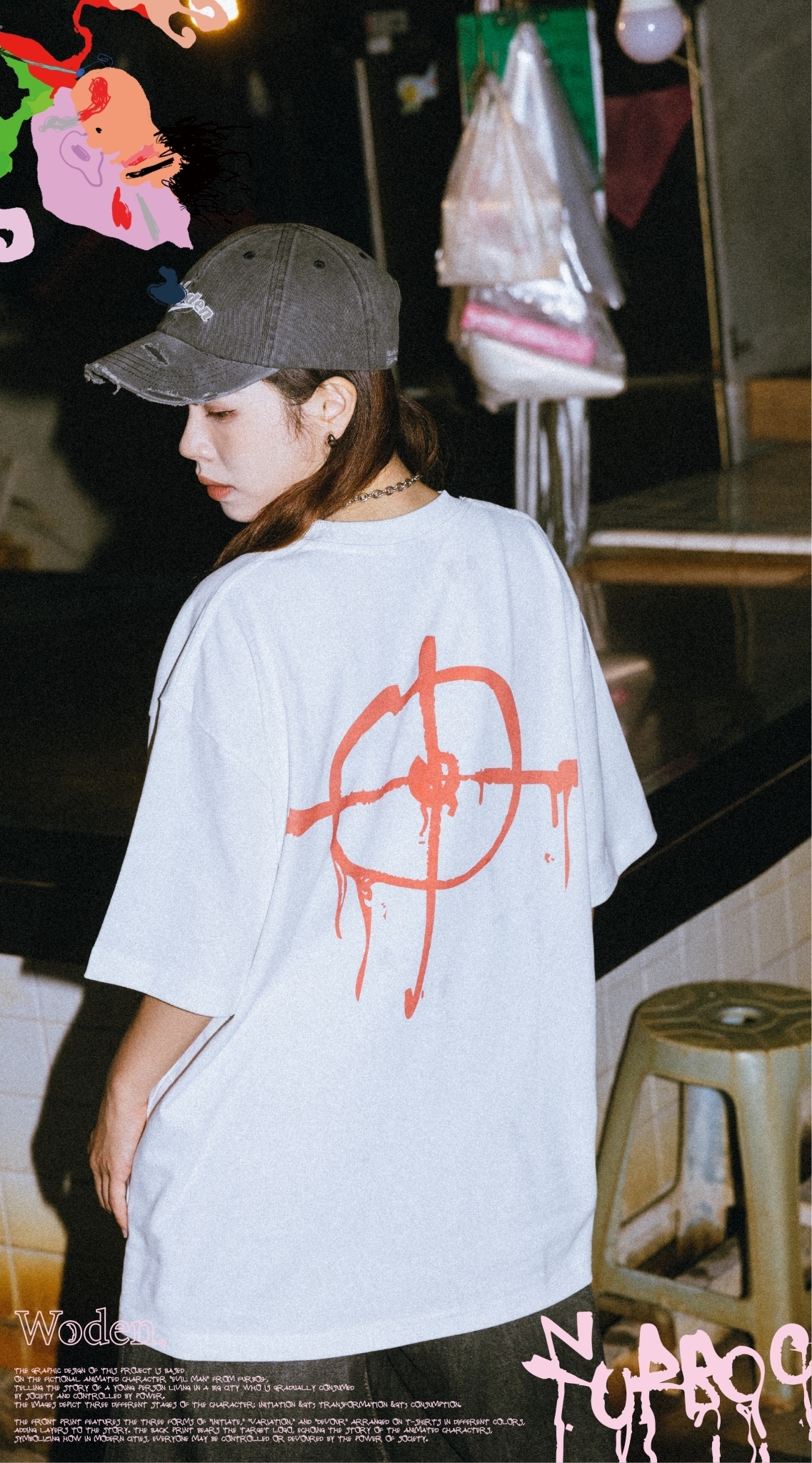 正面印刷圖將『起始』、『變異』、『吞噬』三種形態分別排列在不同顏色的T-shirt上,增加了故事的層次感。背面則印有靶心logo,與動畫角色的故事相呼應,隱喻在現代城市中,每個人都可能被現實社會的權力控制或吞噬。