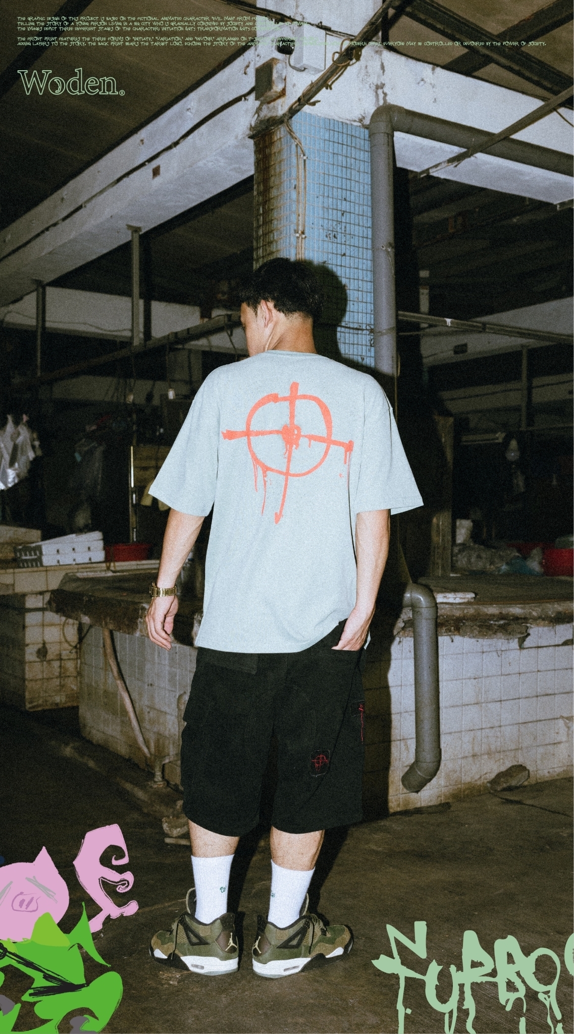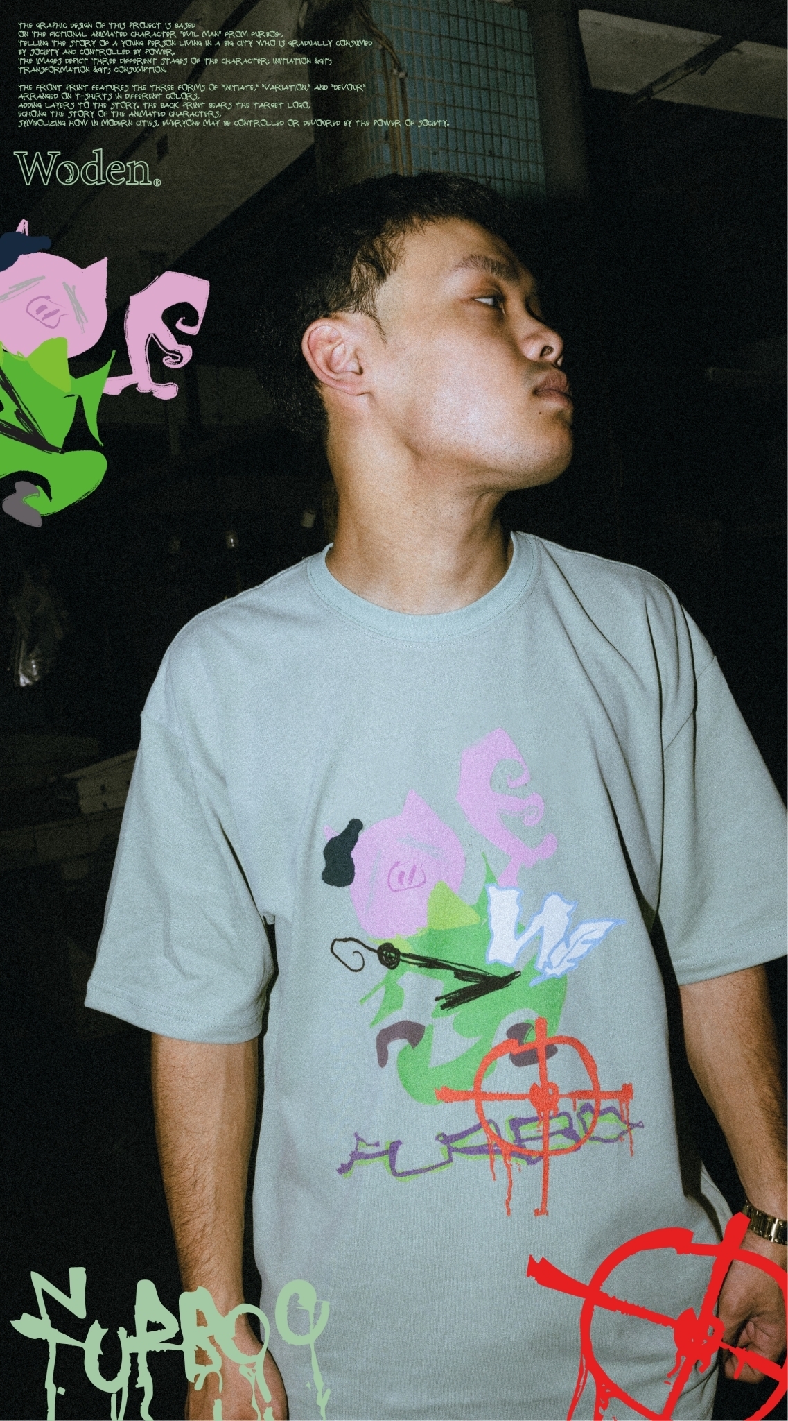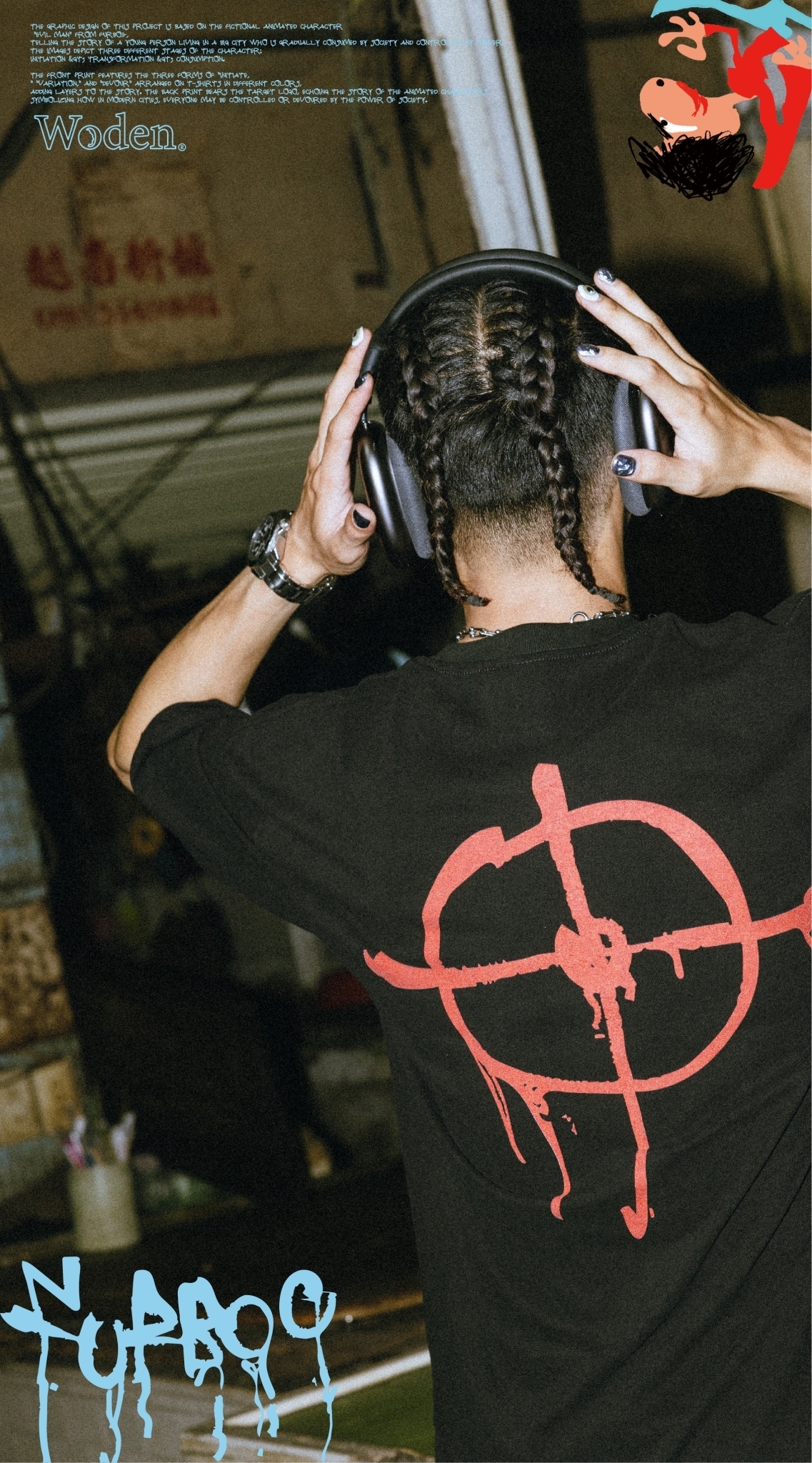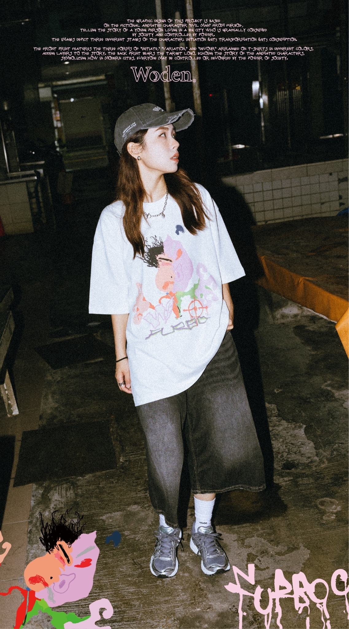 正面印刷圖將『起始』、『變異』、『吞噬』三種形態分別排列在不同顏色的T-shirt上,增加了故事的層次感。背面則印有靶心logo,與動畫角色的故事相呼應,隱喻在現代城市中,每個人都可能被現實社會的權力控制或吞噬。