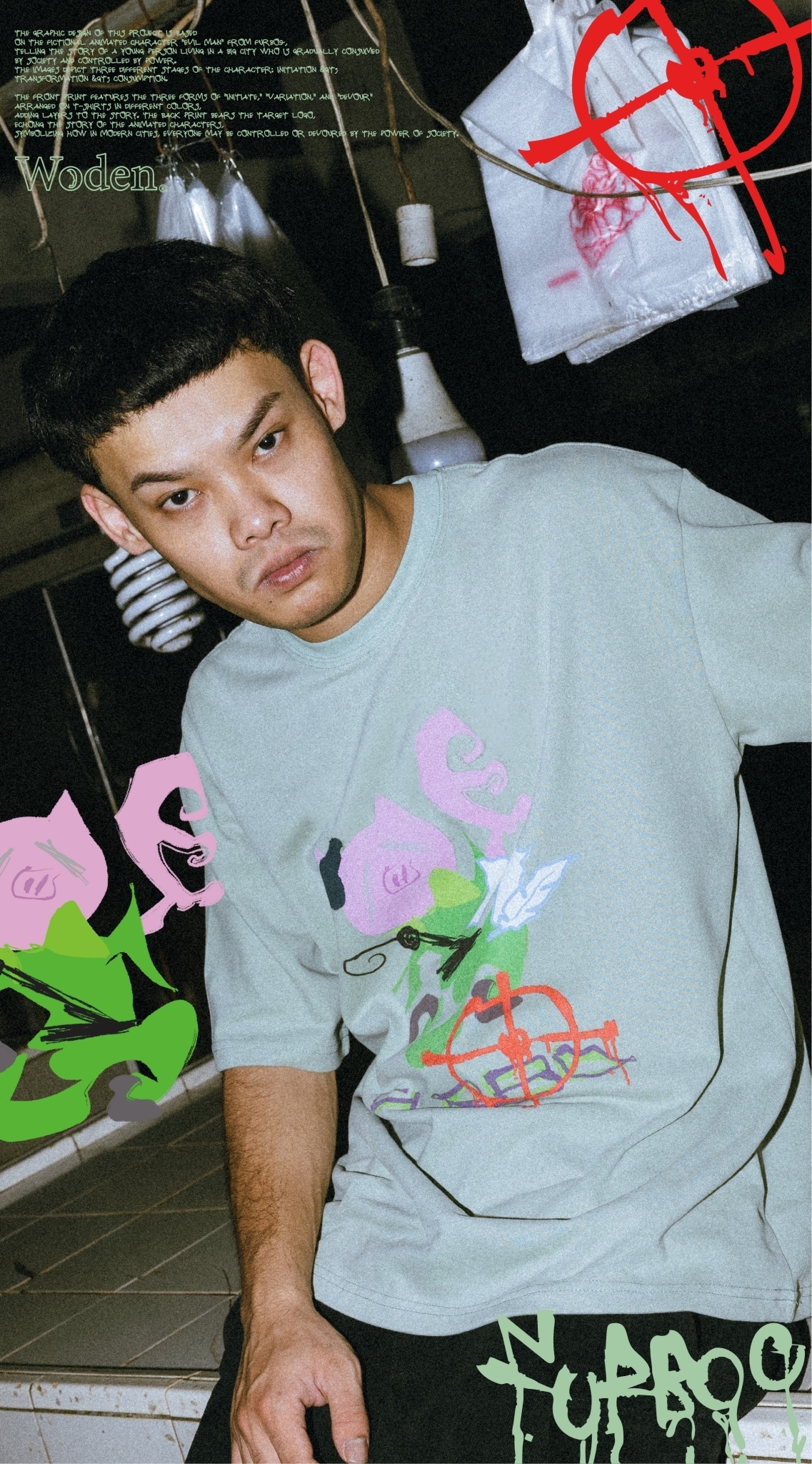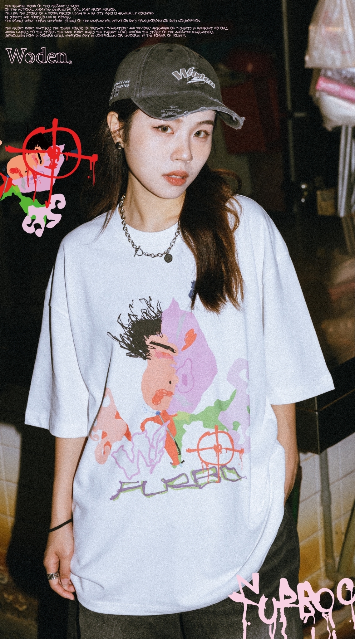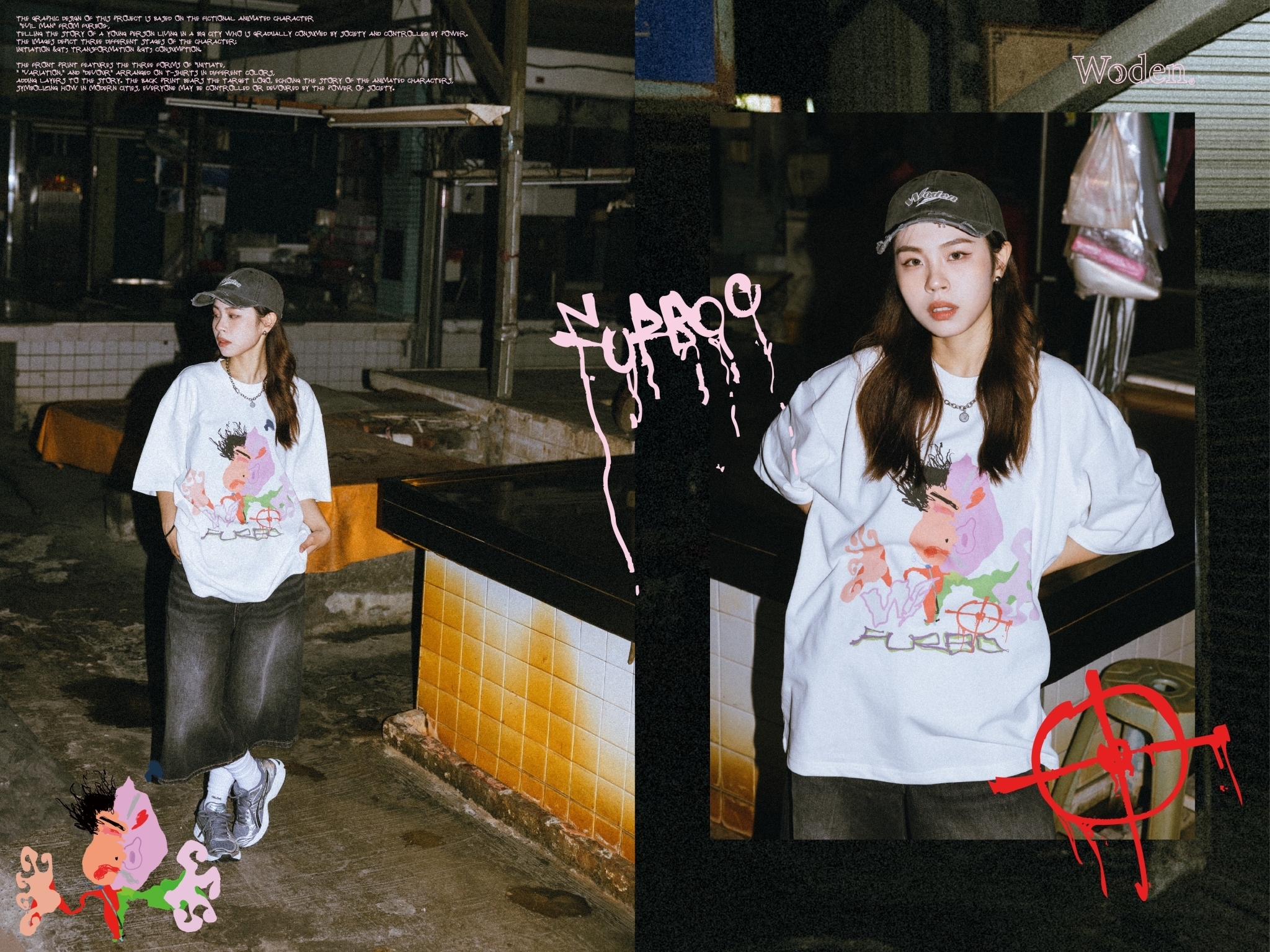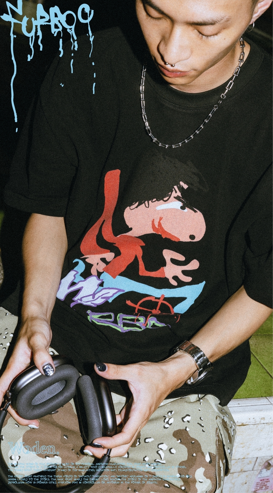正面印刷圖將『起始』、『變異』、『吞噬』三種形態分別排列在不同顏色的T-shirt上,增加了故事的層次感。背面則印有靶心logo,與動畫角色的故事相呼應,隱喻在現代城市中,每個人都可能被現實社會的權力控制或吞噬。