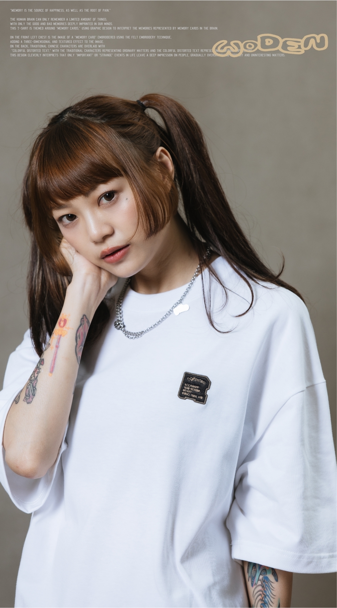 正面左胸口加入“記憶卡”圖像,採用毛氈刺繡工藝呈現,此細節使記憶卡圖像更加立體且富有質感。背面則以『正體字』疊加『跳色扭曲文字』呈現,『正體字』代表一般的事情,『跳色扭曲文字』則代表深刻的印象。此設計巧妙地詮釋了生活中只有“重要”或“奇怪”的事件才會讓人印象深刻,並逐漸覆蓋掉一般且無趣的事情。