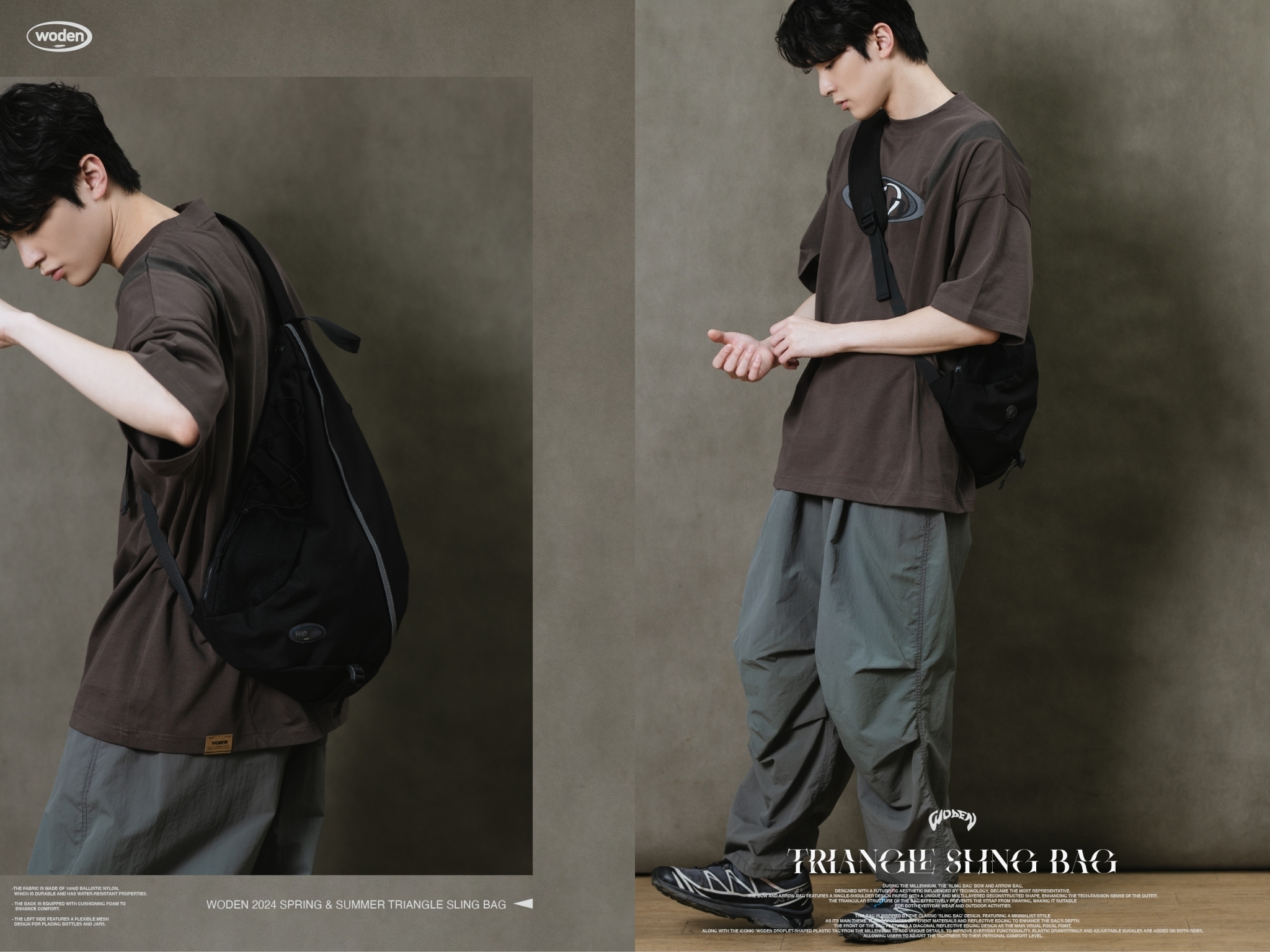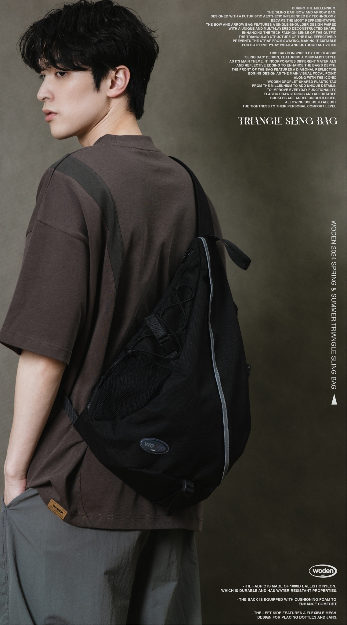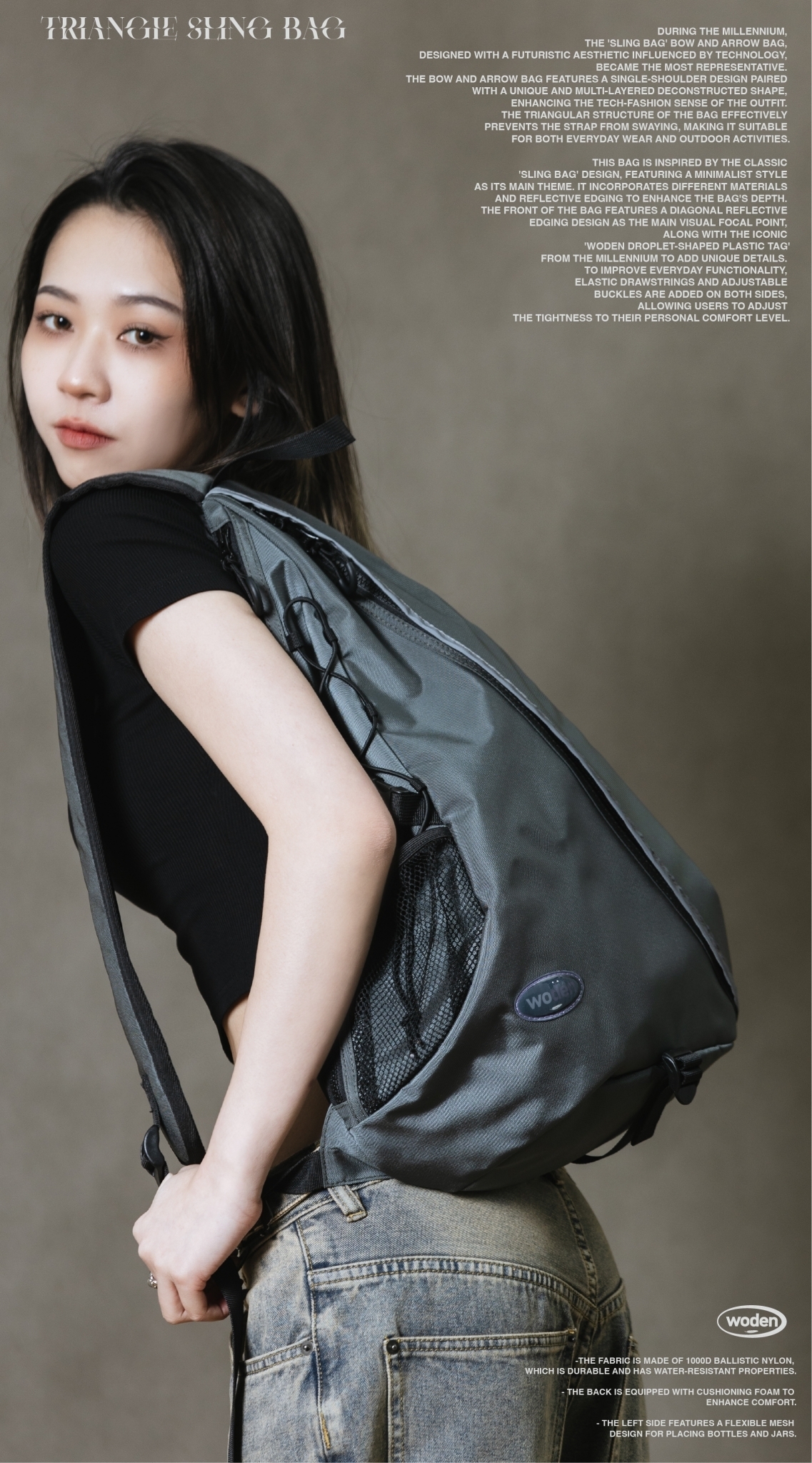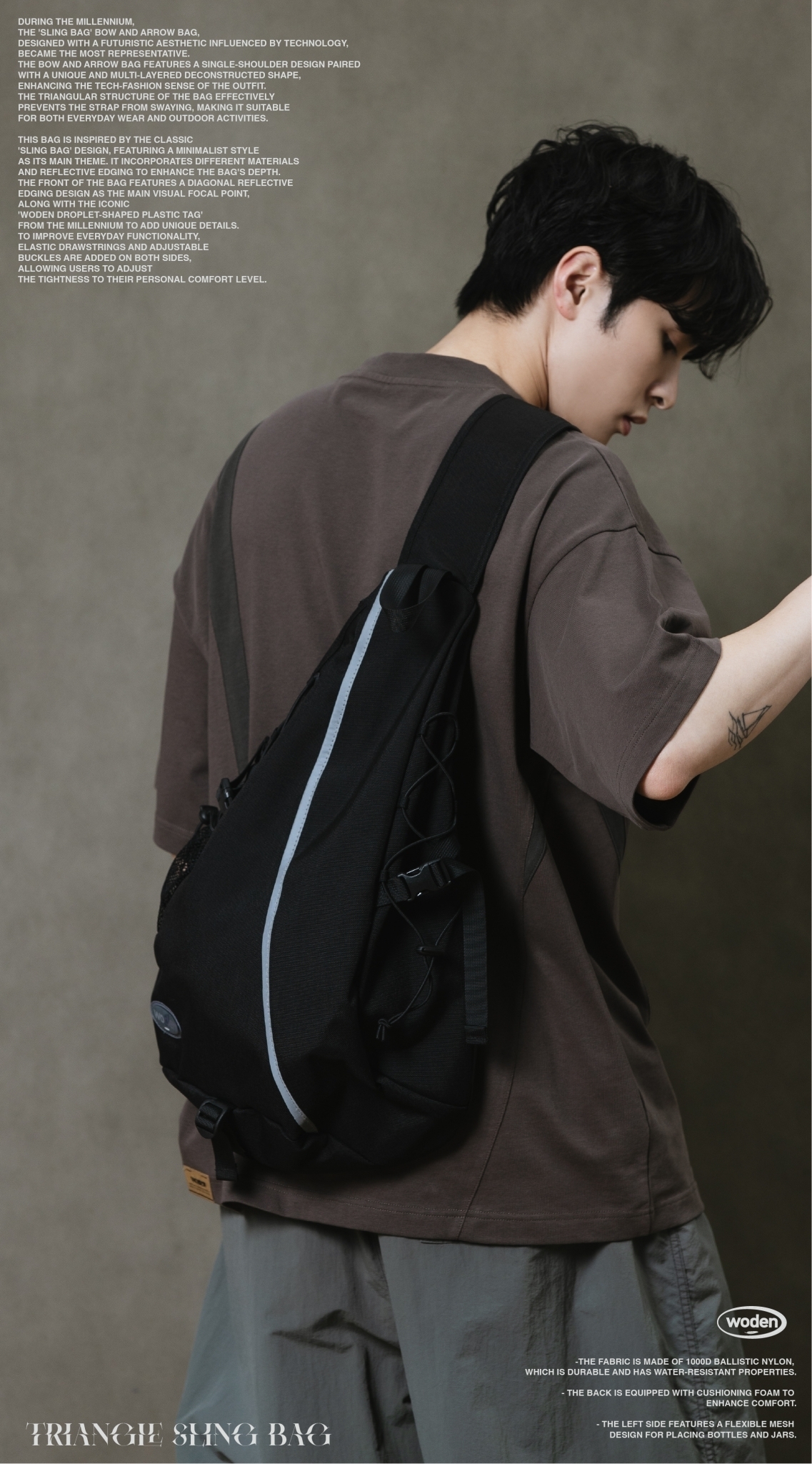 此款包袋參考經典『Sling Bag弓箭包』造型,整體以簡約素面風格為主,並以異材質與反光包邊設計增加包款的層次感。包身正面加入斜反光包邊設計作為主視覺焦點,並加入千禧年具代表性的『WODEN滴狀塑膠標』增添獨特細節。為了提高日常使用的功能性,兩側加入彈性抽繩和調節釦,可以根據個人使用習慣調整至舒適的鬆緊度。