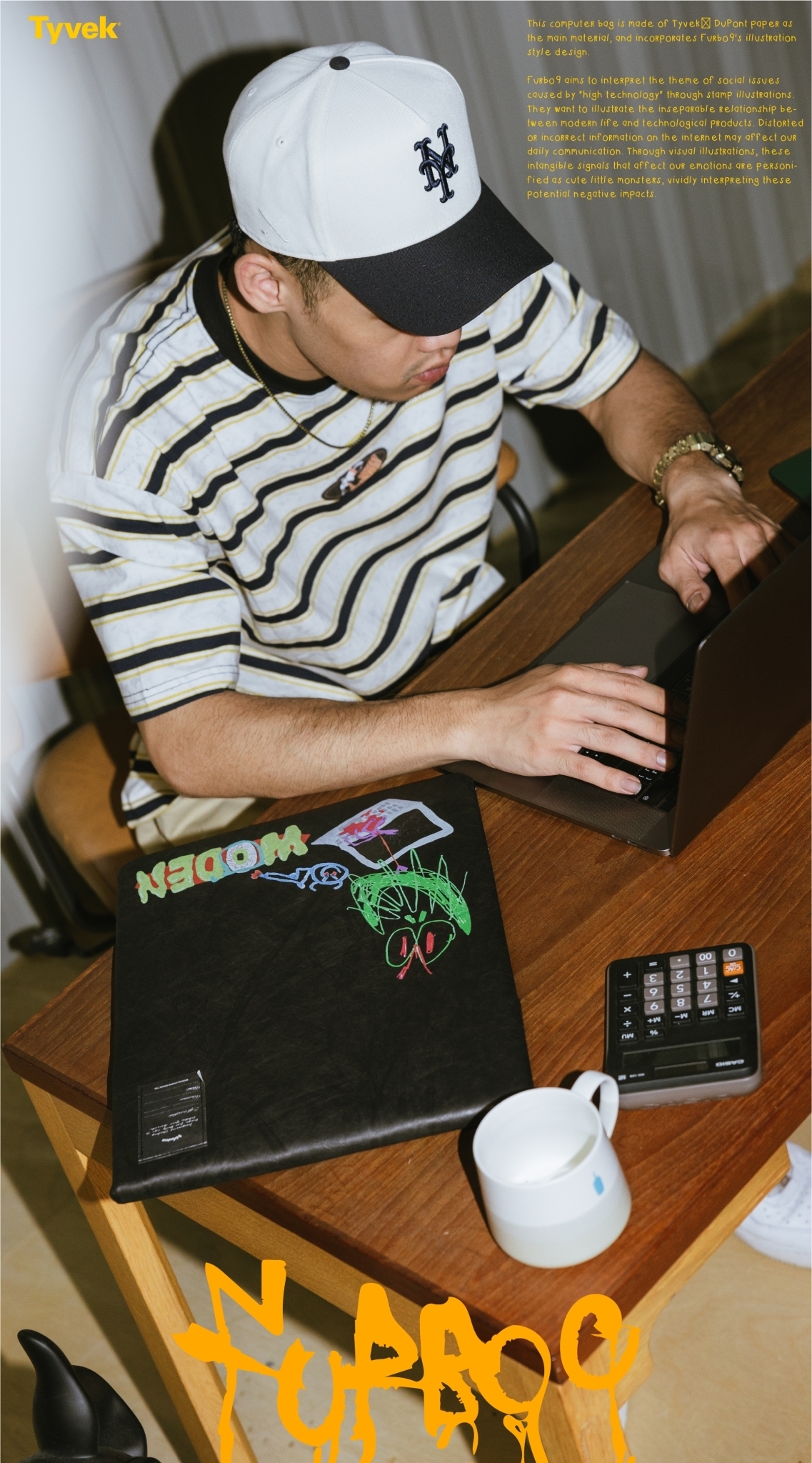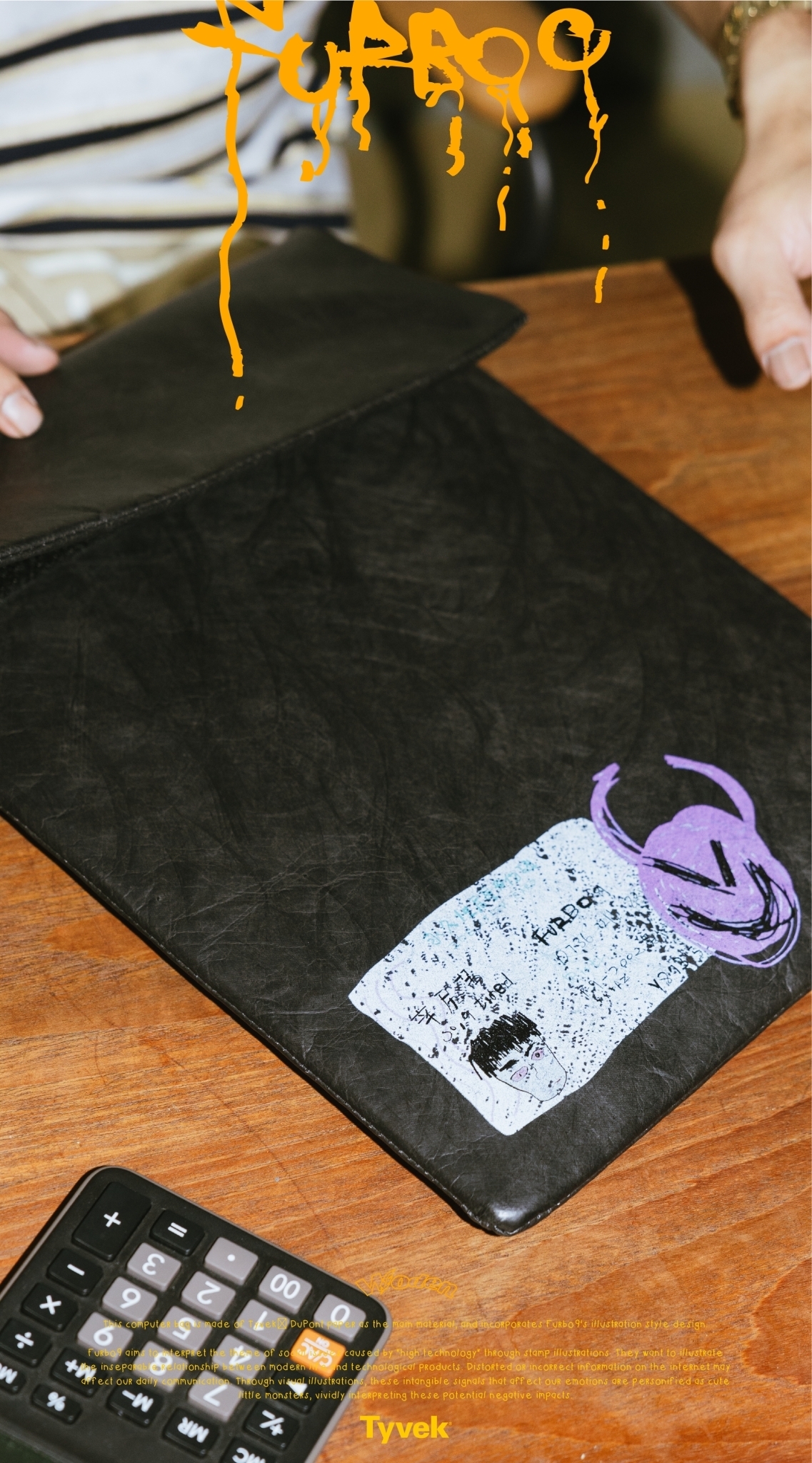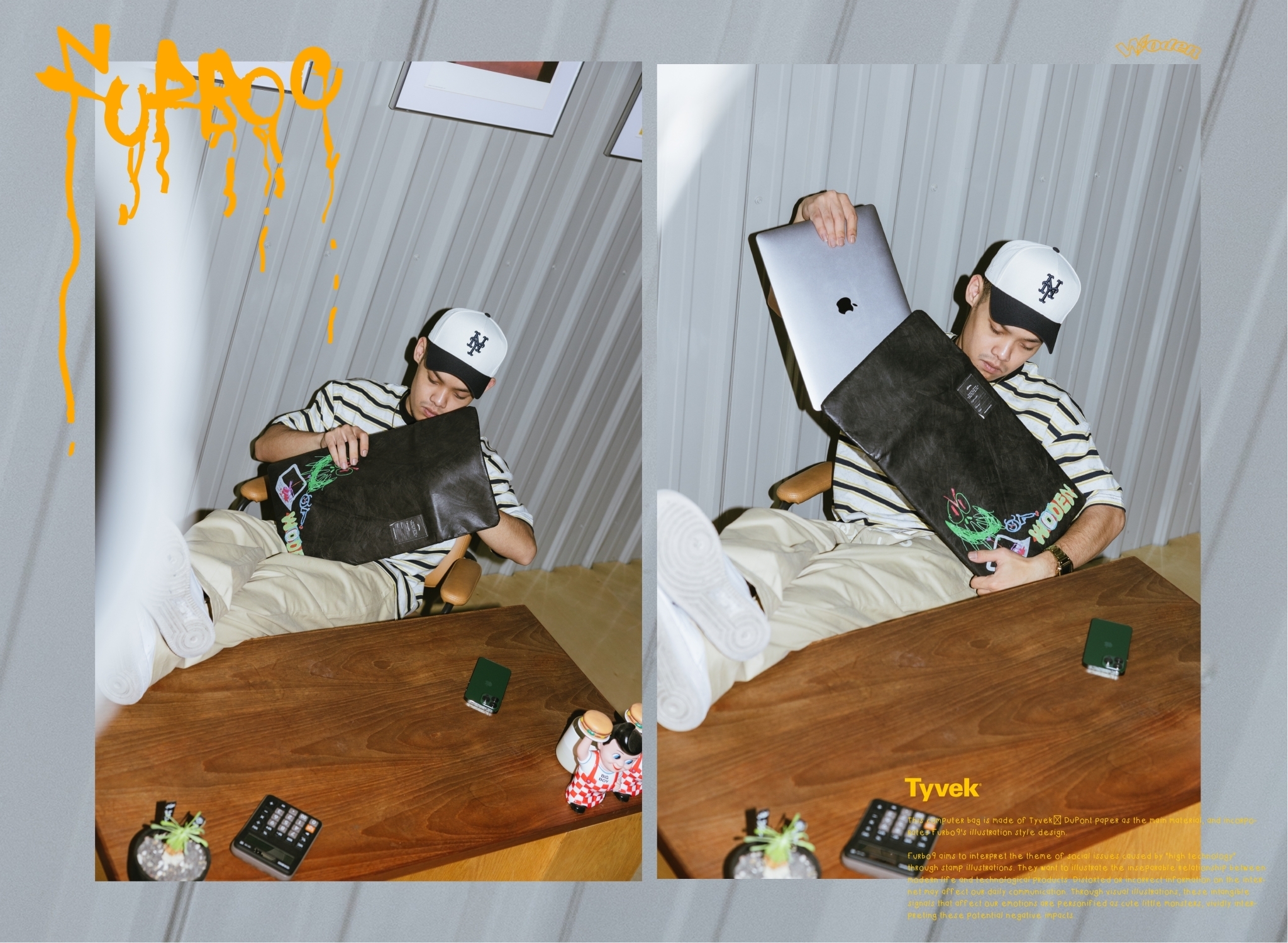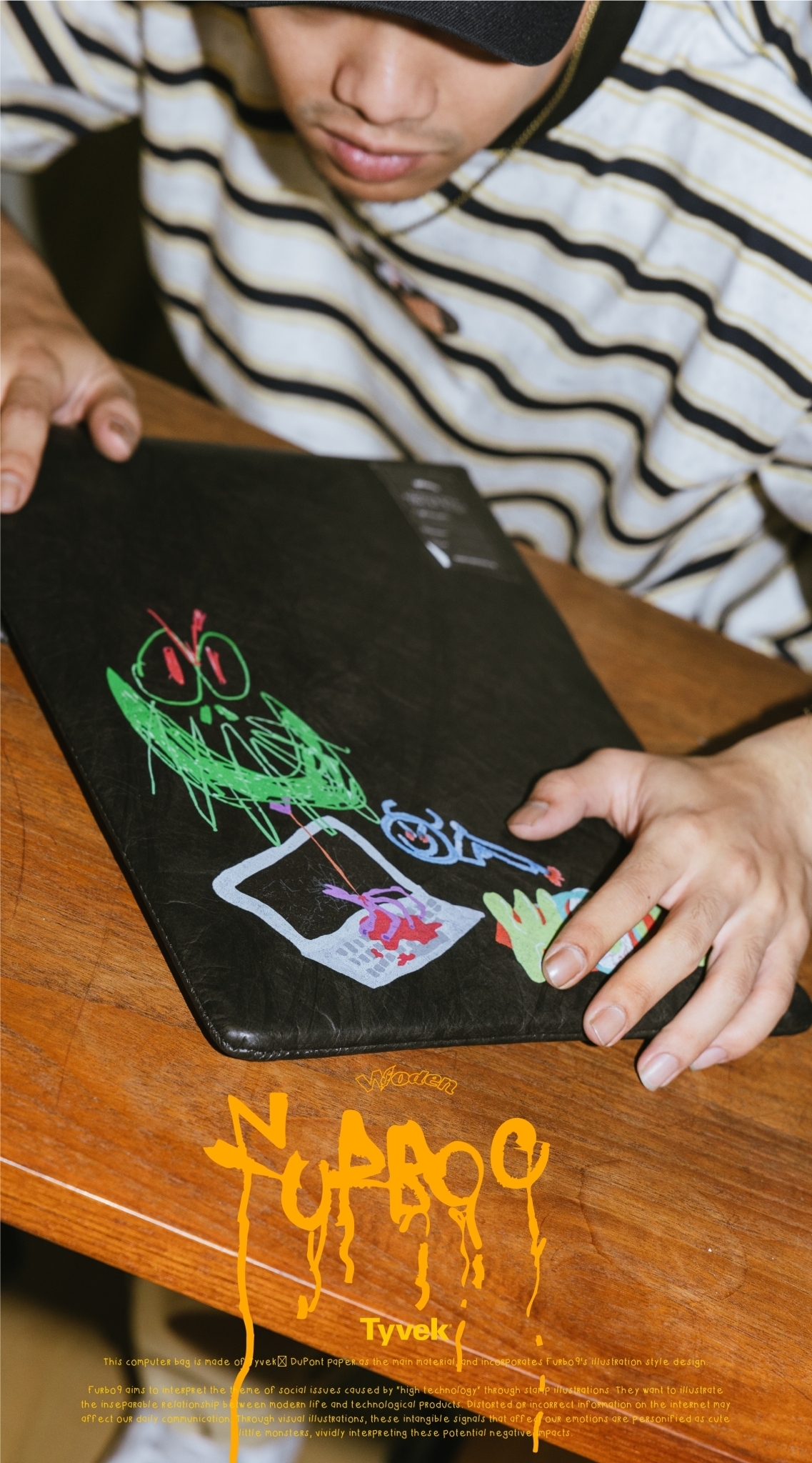 此款電腦包選用了Tyvek®杜邦紙作為主要材質,並融入了Furbo9的插畫風格設計。