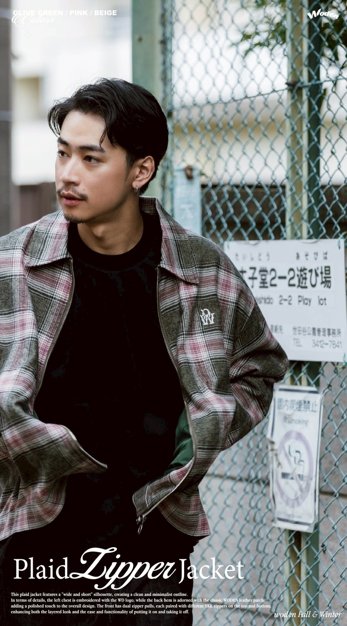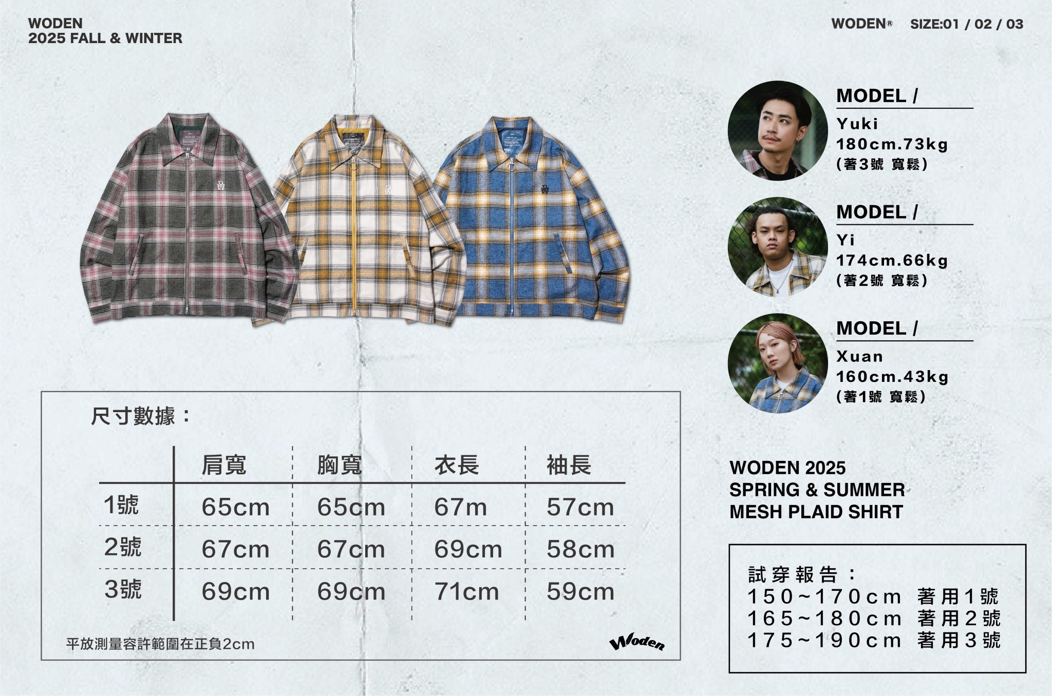 本次格紋外套採用『寬短版型』,勾勒出俐落簡約的輪廓。細節上,左胸繡上 WD 字體LOGO,背面下擺則點綴 WODEN 經典皮標,讓整體設計更加完整。正面雙拉鍊頭設計,上下分別搭配YKK不同造型拉鍊,既增添層次感,也提升穿脫的便利與機能性。