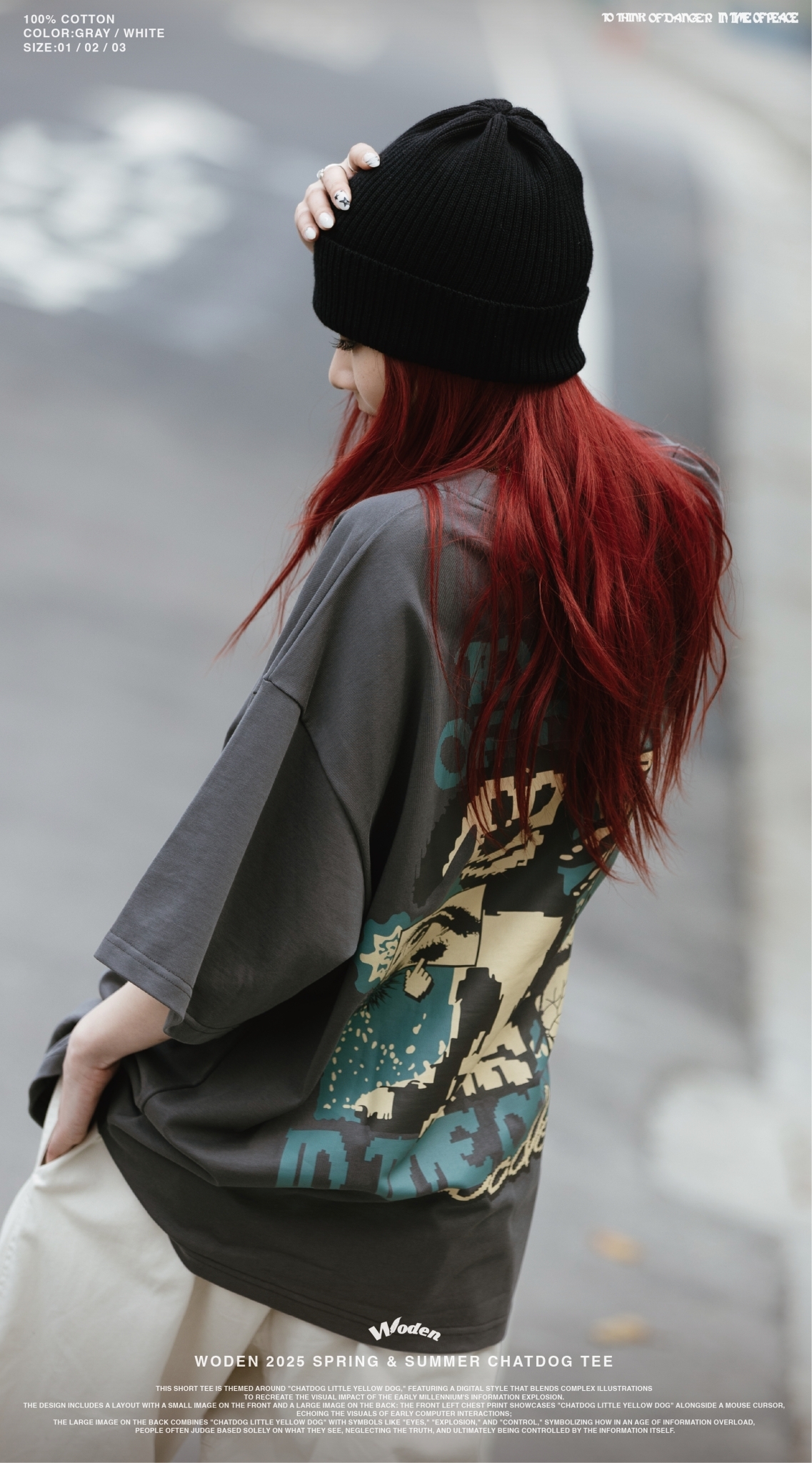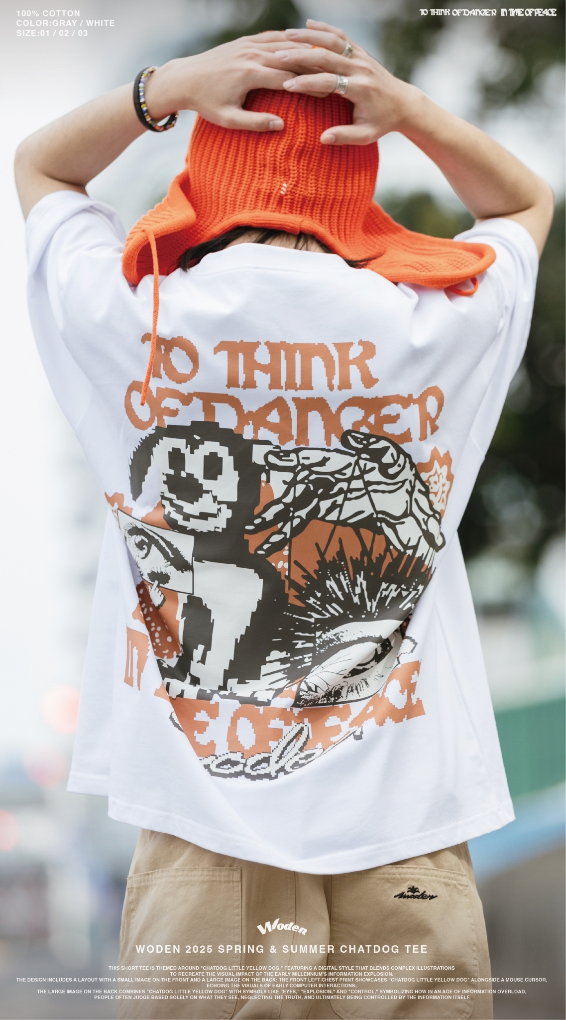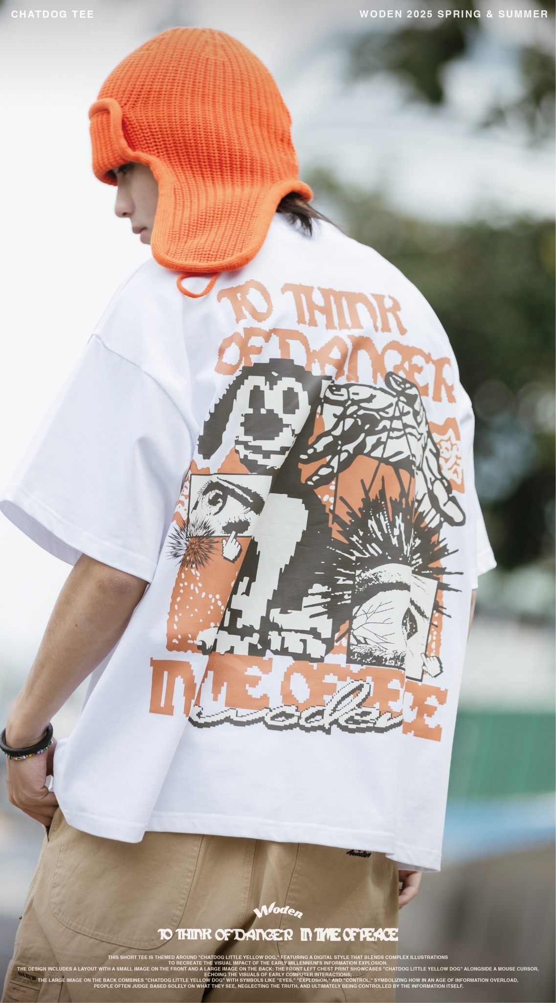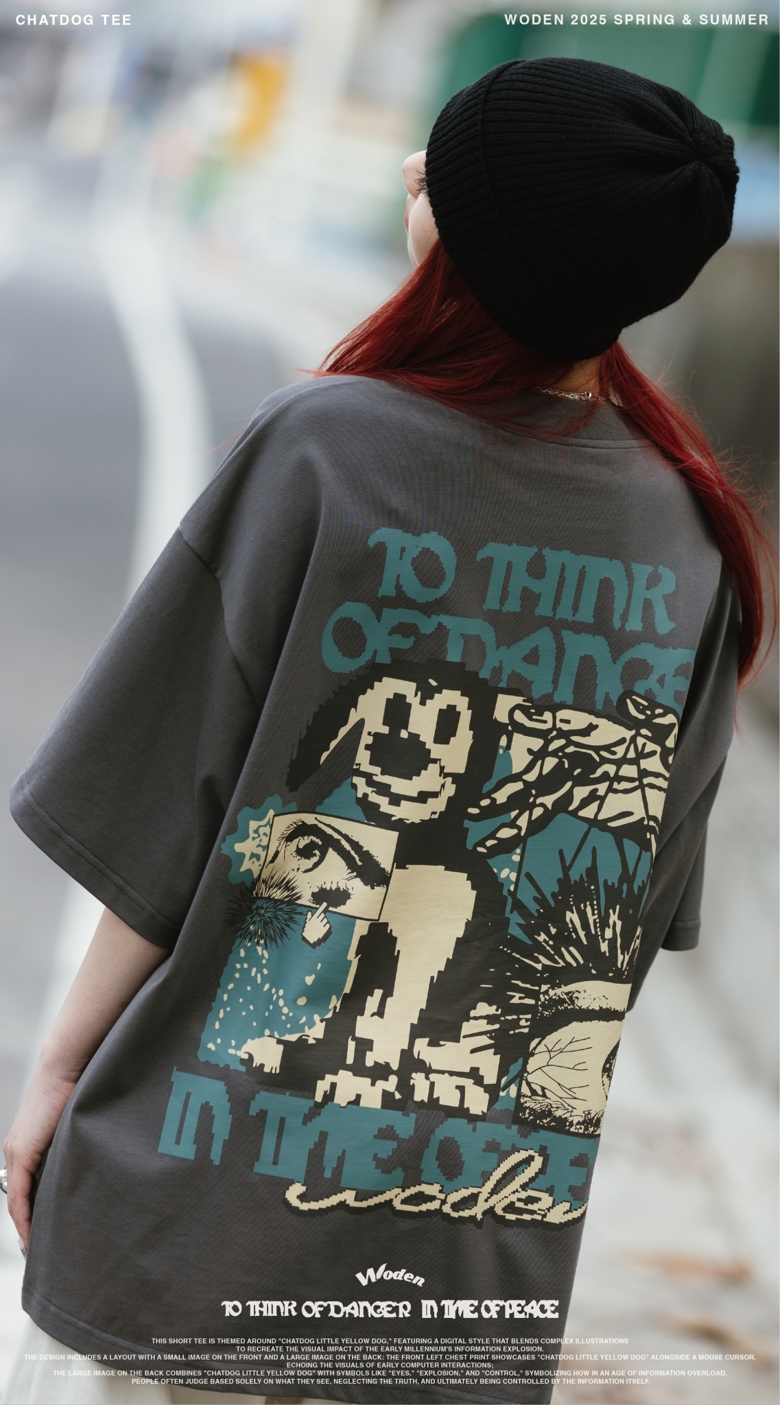 本款短Tee以『ChatDOG 小黃狗』為主題,圖像採用數位風格融合複雜插畫,重現千禧年資訊爆炸初期的視覺衝擊。設計上採用前小圖、後大圖的配置:正面左胸印花呈現『ChatDOG 小黃狗』搭配滑鼠游標,呼應早期電腦互動的畫面;背面大面積圖像則結合『ChatDOG 小黃狗』與『眼睛』、『爆炸』、『操控』等符號,象徵在資訊氾濫的時代,人們往往只憑眼見而判斷,卻忽略了真相,最終反被資訊所操控。