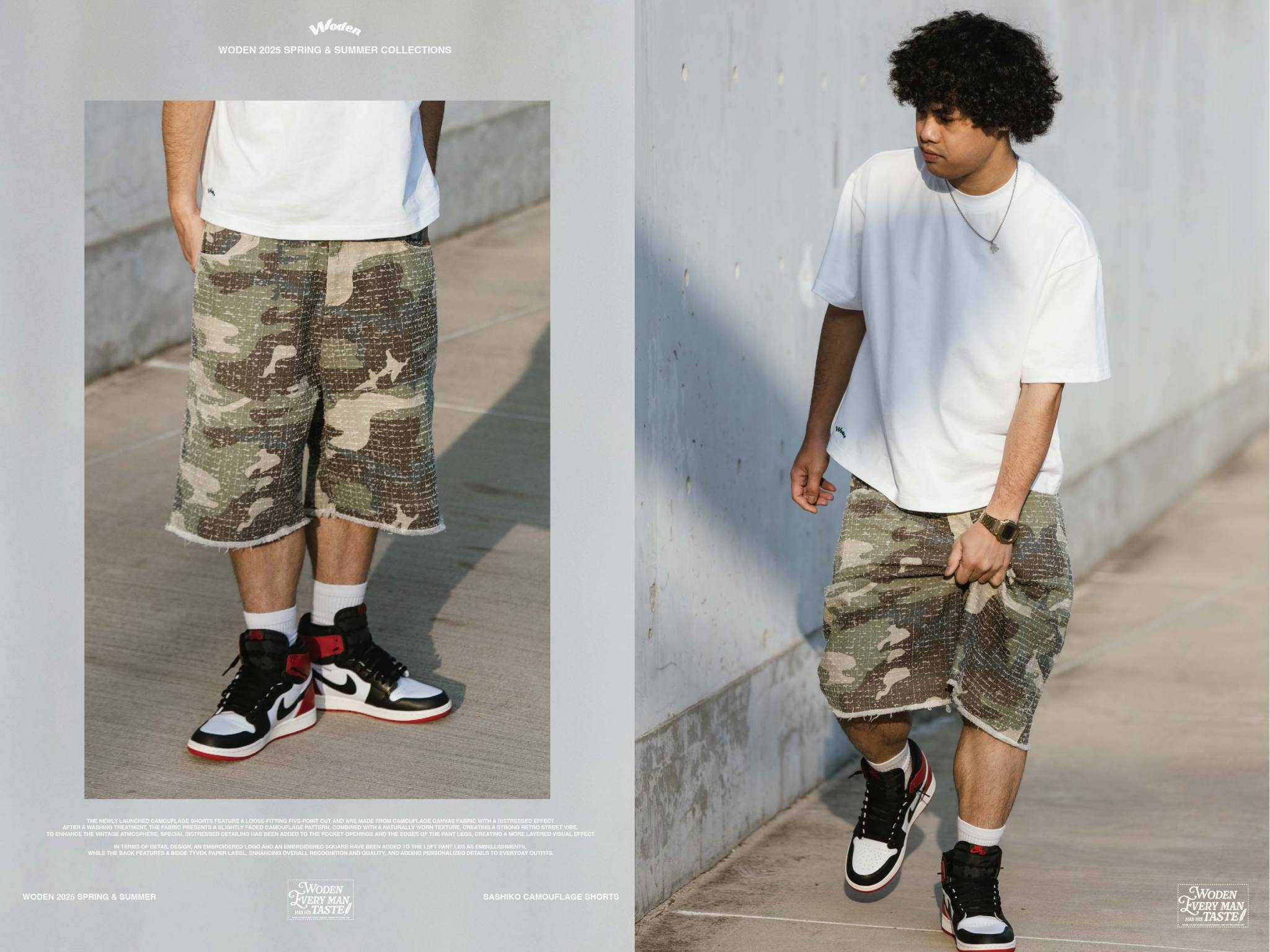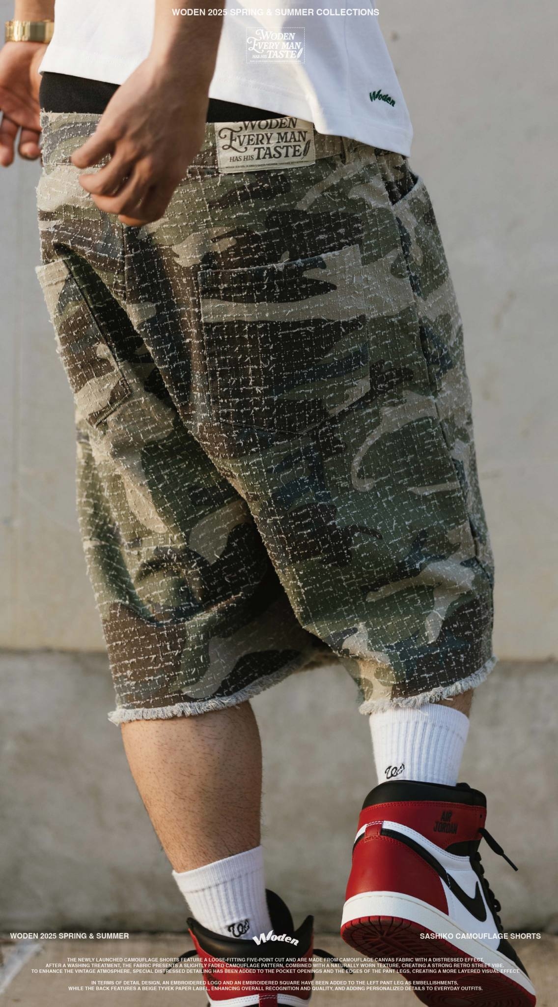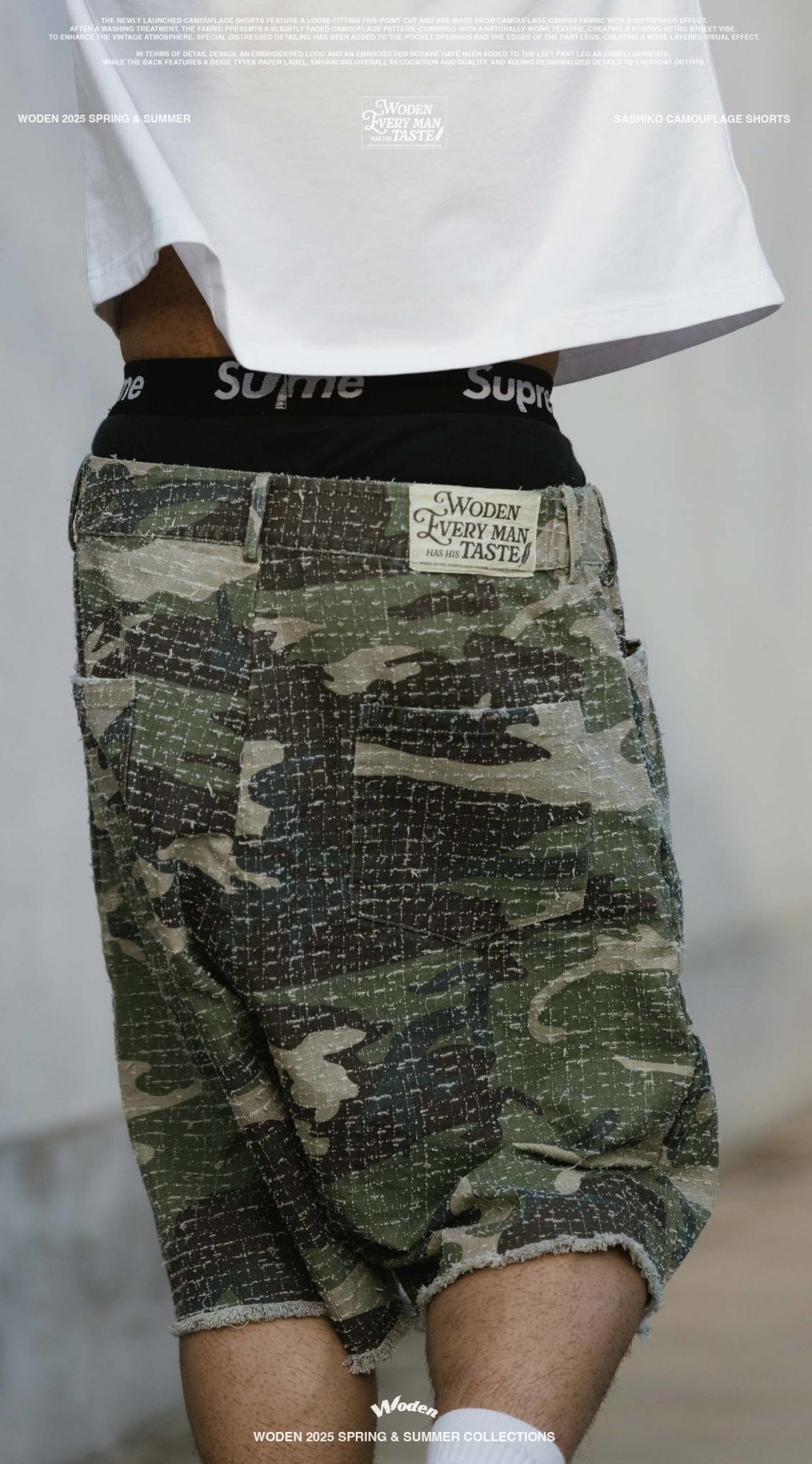 本次推出的迷彩短褲採用寬鬆五分褲版型,選用具勾破工藝效果的迷彩帆布面料,經過洗水處理後,呈現略帶褪色的迷彩圖紋,搭配自然破損質感,營造出濃厚的復古街頭氣息。為了加強舊化氛圍,特別在口袋開口與褲管邊緣進行磨破細節設計,打造出更具層次的視覺效果。