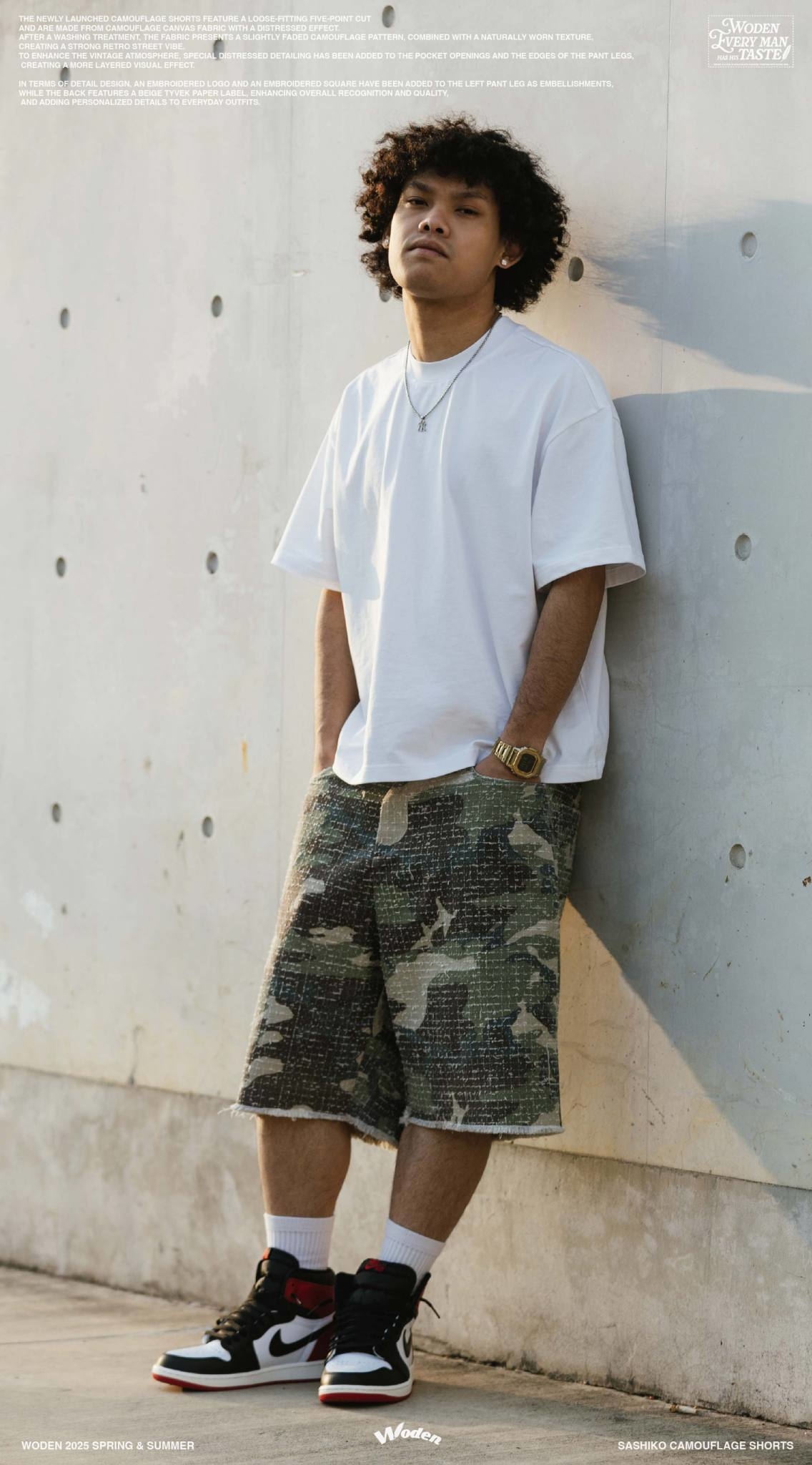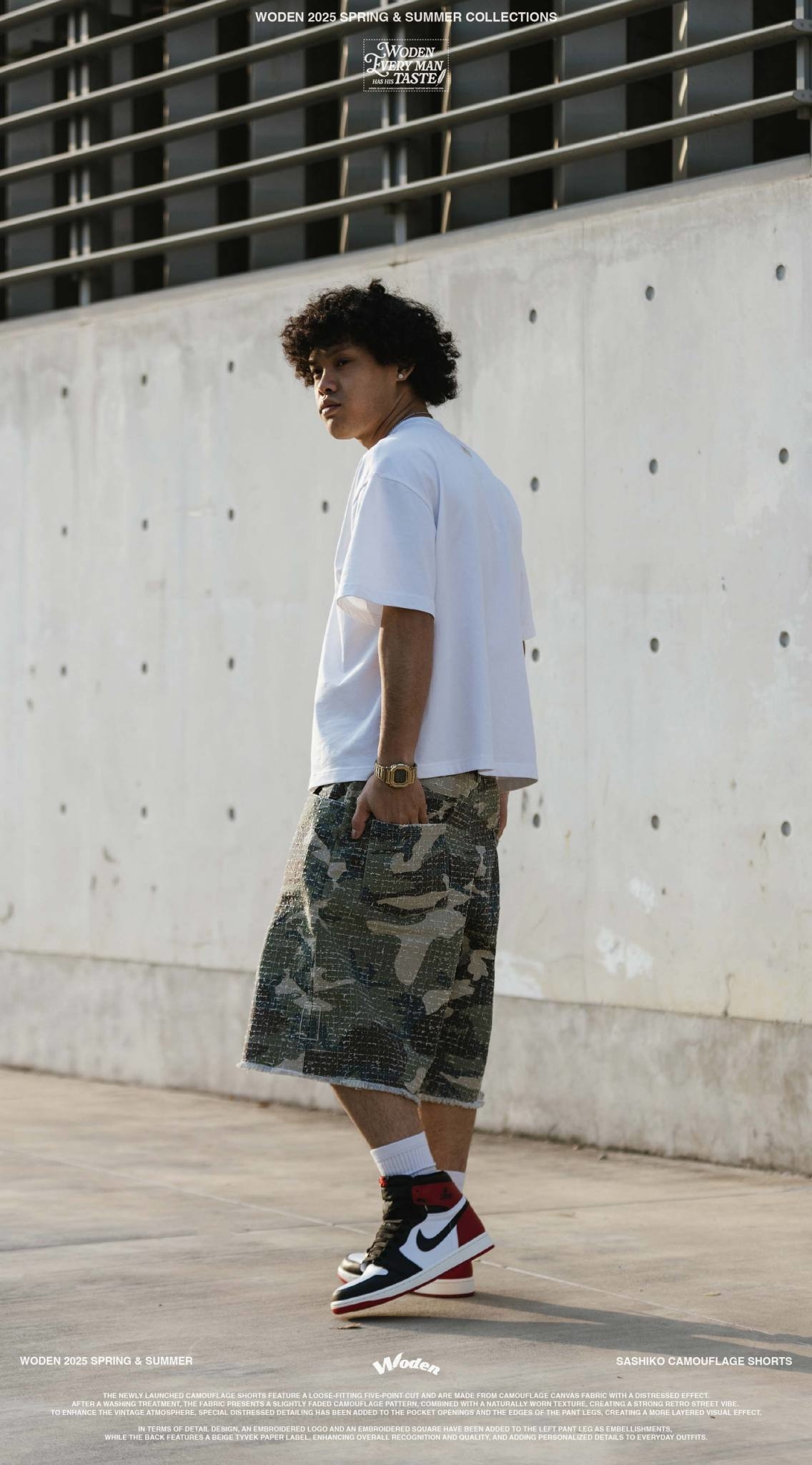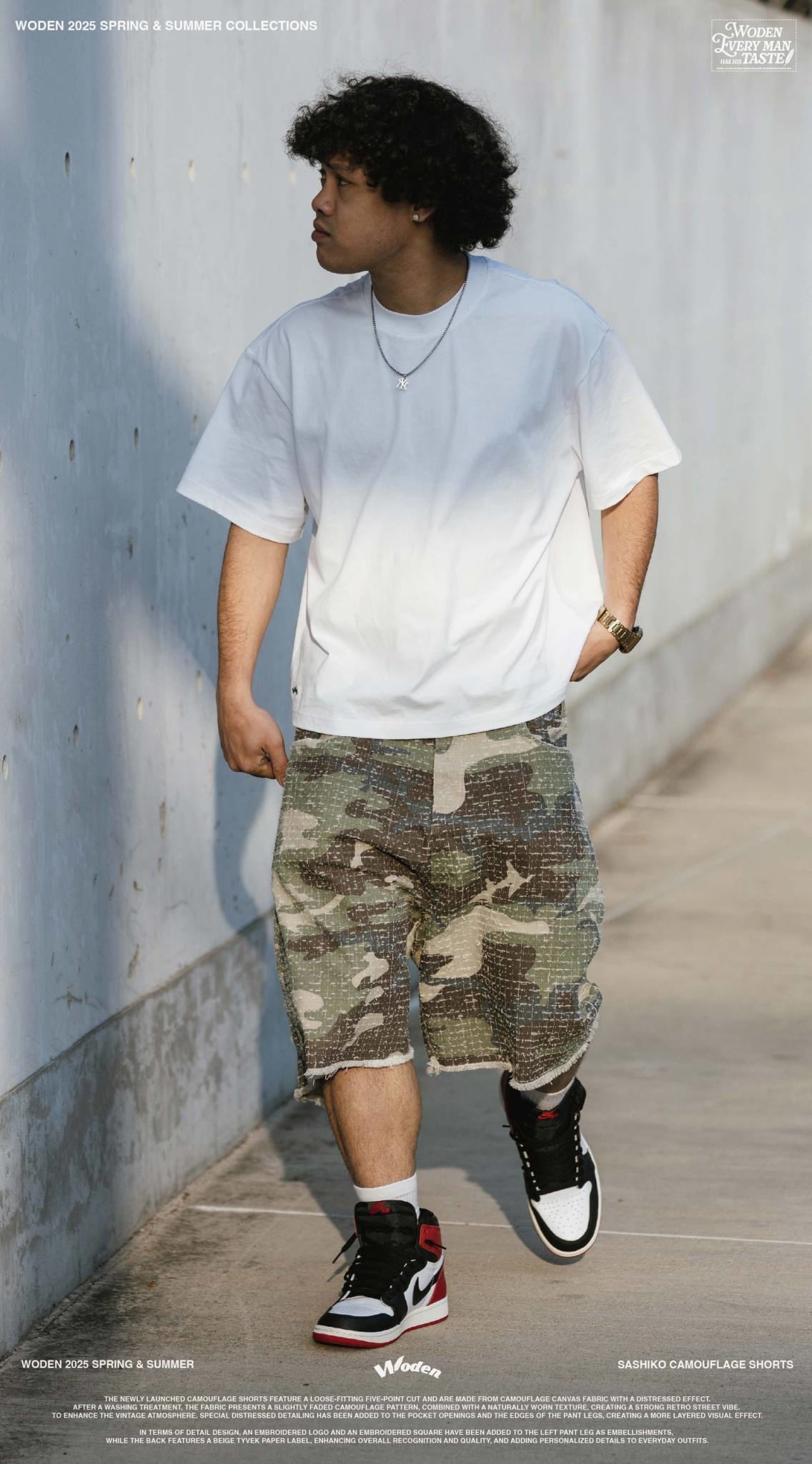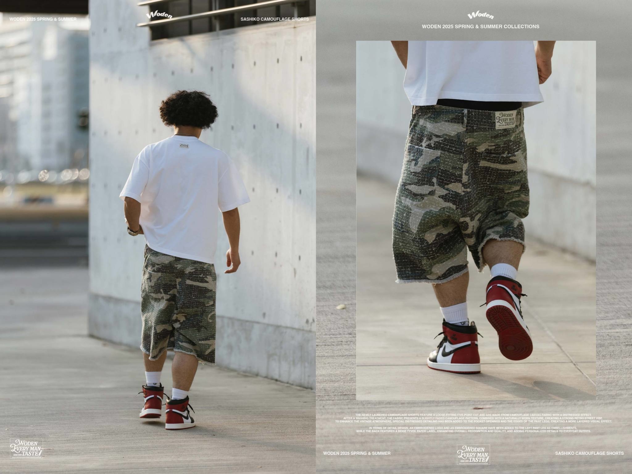 本次推出的迷彩短褲採用寬鬆五分褲版型,選用具勾破工藝效果的迷彩帆布面料,經過洗水處理後,呈現略帶褪色的迷彩圖紋,搭配自然破損質感,營造出濃厚的復古街頭氣息。為了加強舊化氛圍,特別在口袋開口與褲管邊緣進行磨破細節設計,打造出更具層次的視覺效果。