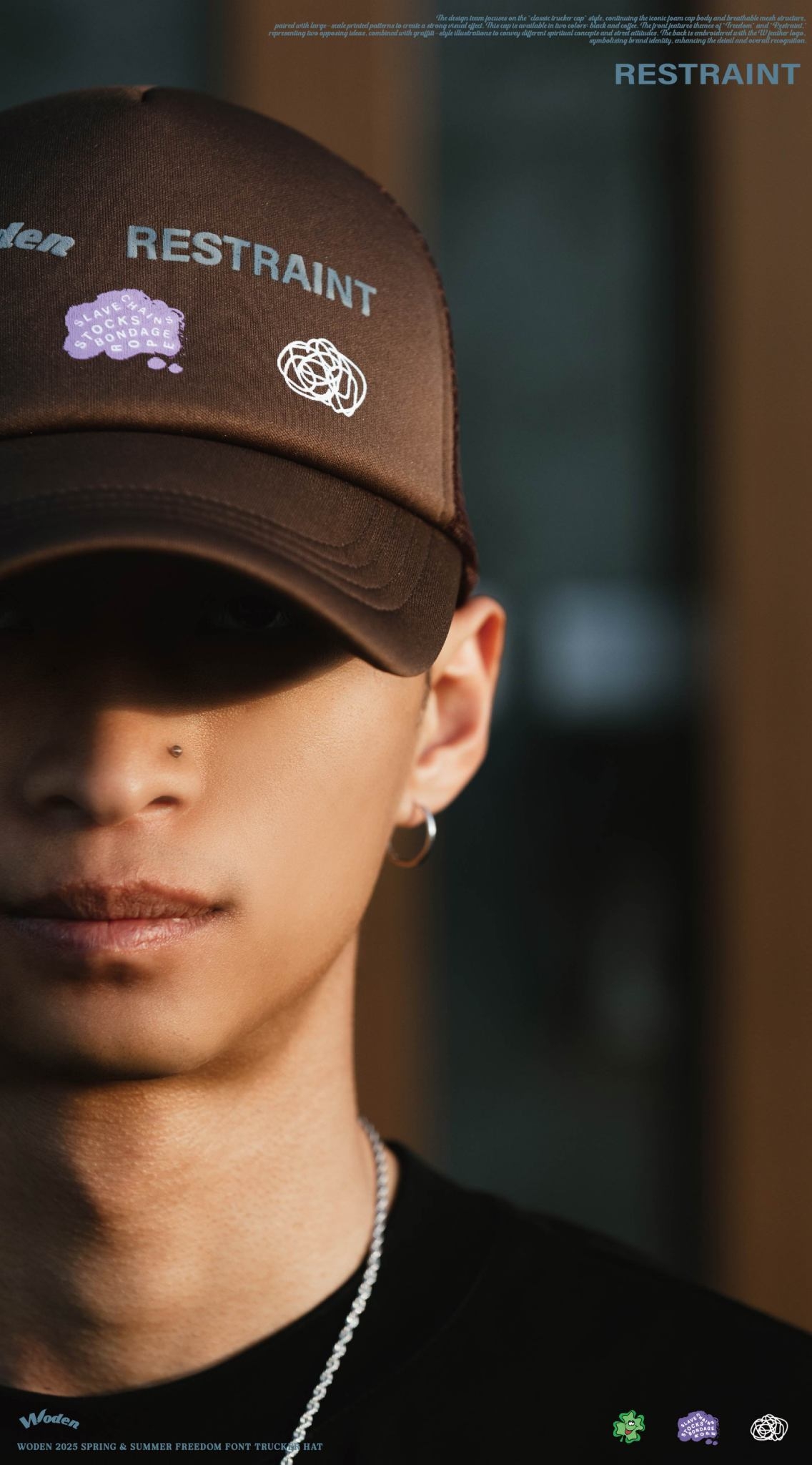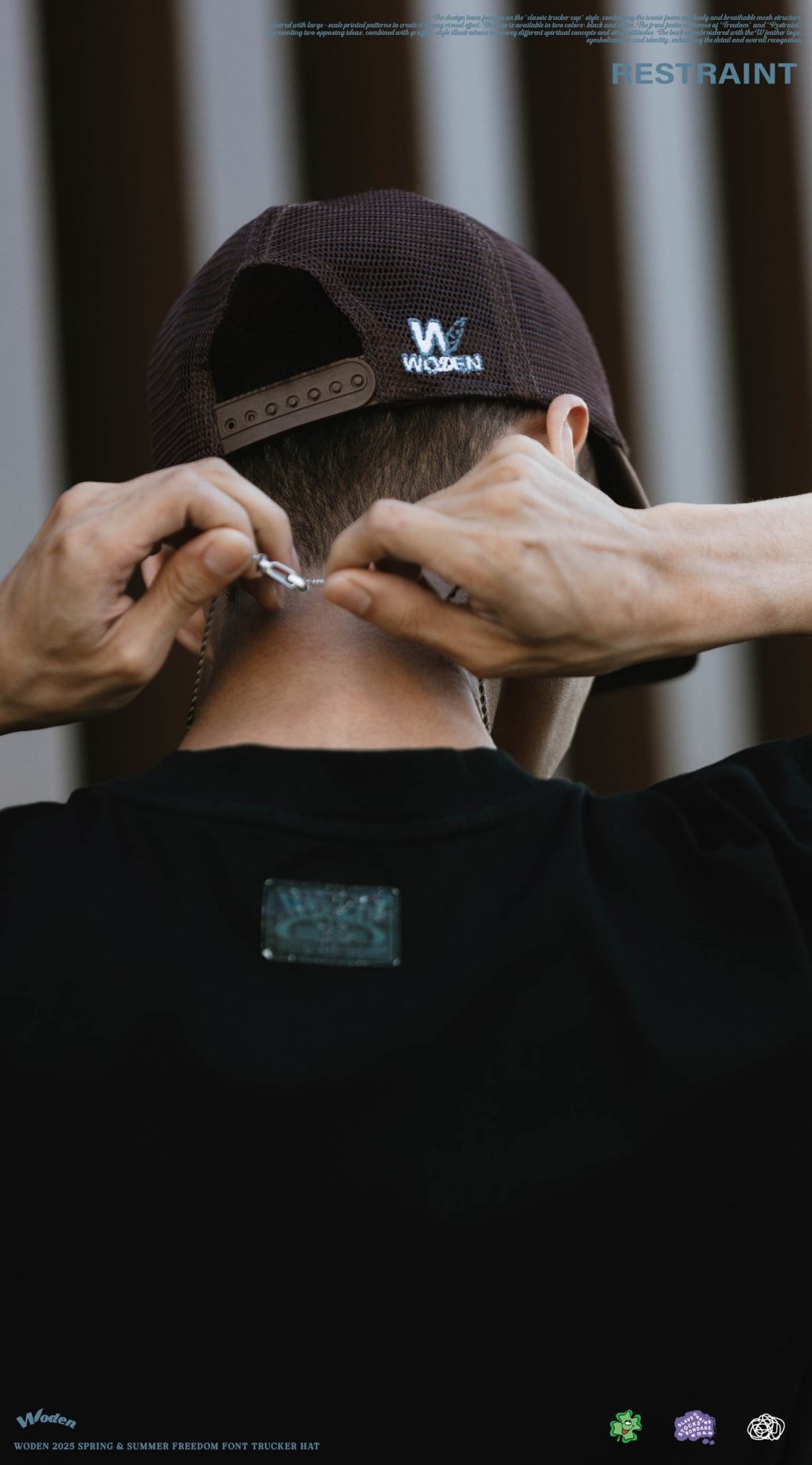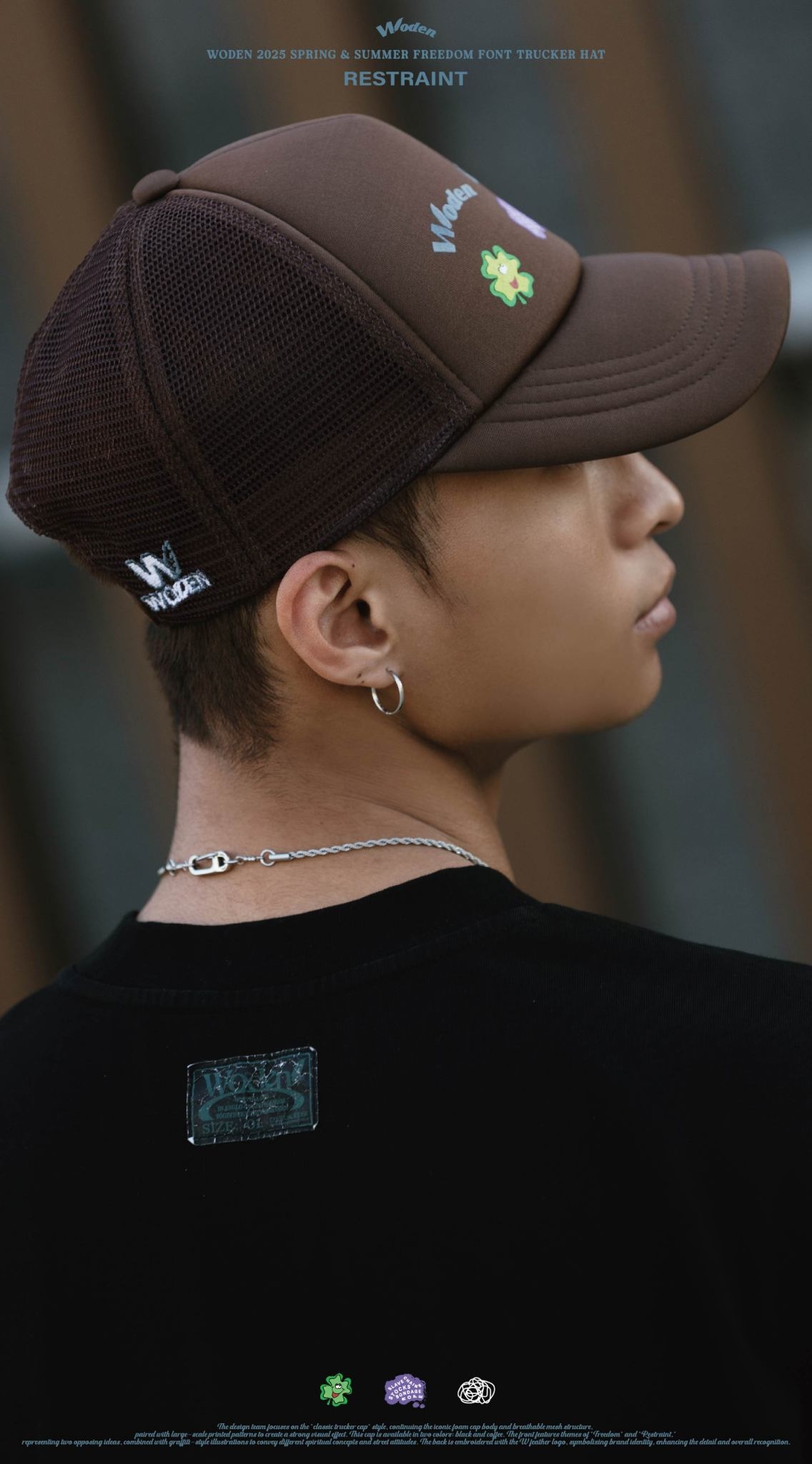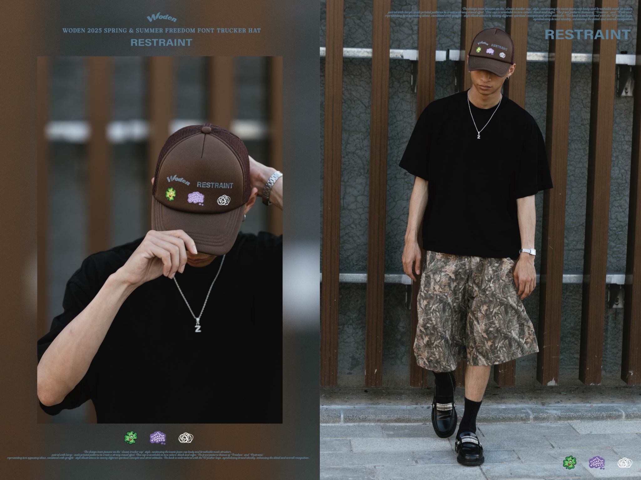 本次設計團隊以「經典卡車網帽」版型為主軸,延續標誌性的發泡棉帽身與透氣網眼結構,搭配大面積印花圖樣呈現出強烈視覺效果。此款帽款共推出黑色與咖啡色兩款,正面分別以「Freedom 自由」與「Restraint 限制」兩種相對思想為主題,結合塗鴉風格插畫,傳遞不同的精神理念與街頭態度。背面則繡上象徵品牌識別的 W 羽毛電繡 LOGO,強化細節層次與整體辨識度。