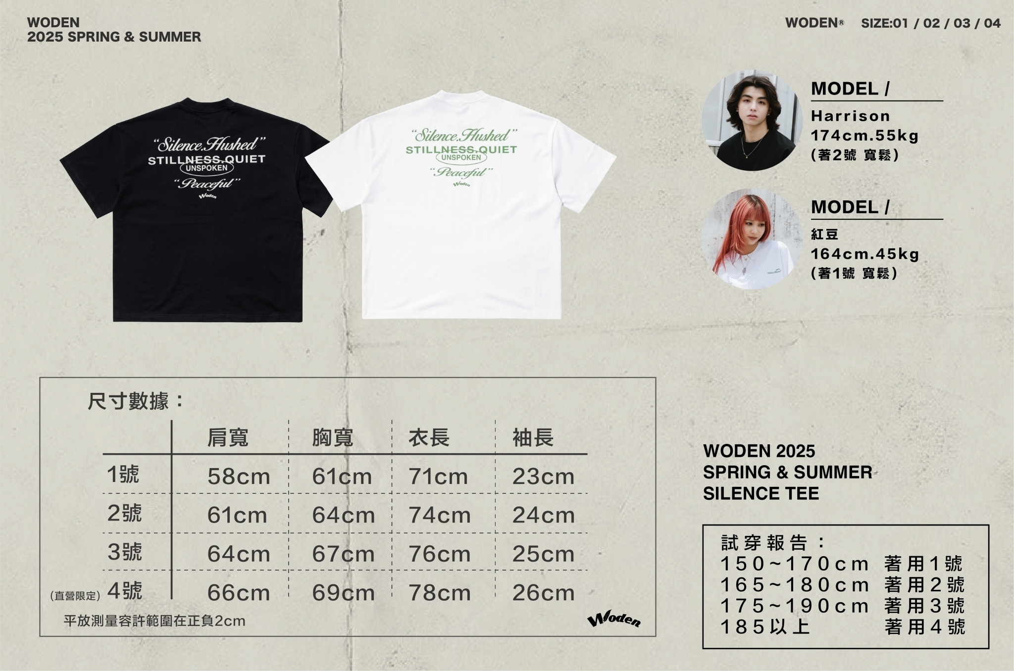 本次設計以T-shirt作為載體,詮釋「沉默是金」的處世智慧。整體以純文字排版設計為主,正面左右胸口分別印有「Stillness.Quiet」與「Silence.Hushed」字樣,透過不同字型的變化搭配WODEN LOGO,增添視覺層次與辨識度。背面則以大面積文字設計呈現,將前側語彙重新排列組合,形成回應與呼應,最後以「Peaceful」作結,象徵沉默能帶來平和,避免不必要的誤解與衝突。